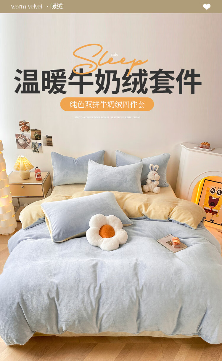 Yusenyi milk velvet bed four-piece set thickened coral velvet double-sided plus velvet quilt cover flannel three-piece bed set baby blue + milkshake yellow double-sided warm velvet skin-friendly and delicate sheet style 200x230cm milk velvet quilt cover single piece 3-200