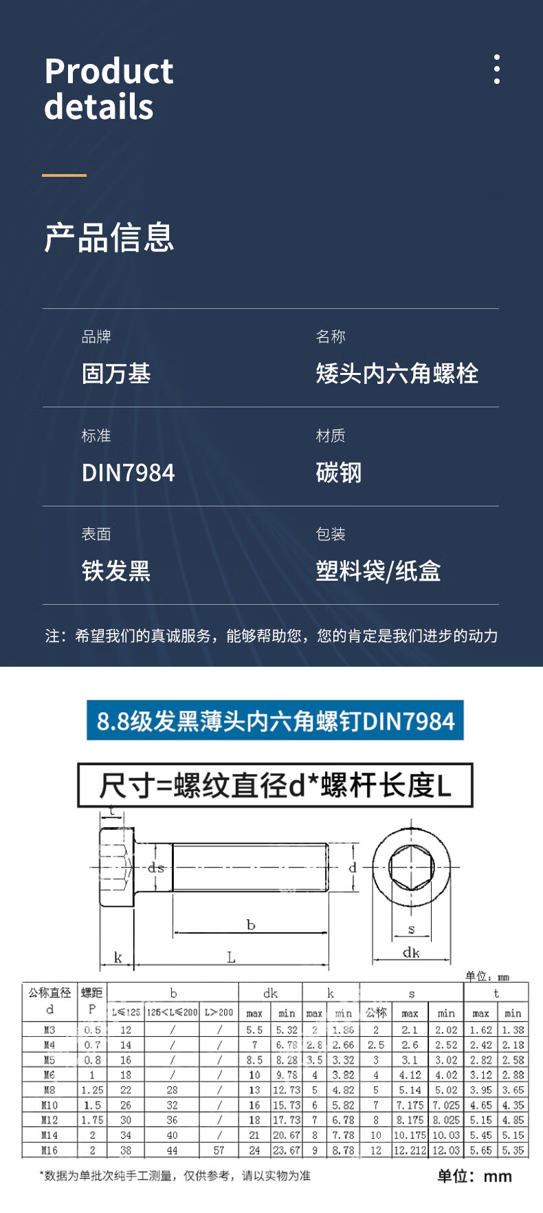 Guwanji grade 8.8/grade 12.9 high strength black thin head hexagon socket screw short head screw bolt screw national standard 12.9 grade M24x60 1 piece