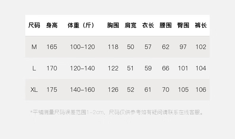 China (cm) 165 / 88-90 170 / 96-98 175 / 108-110 180 / 118-122 185 / 126-130