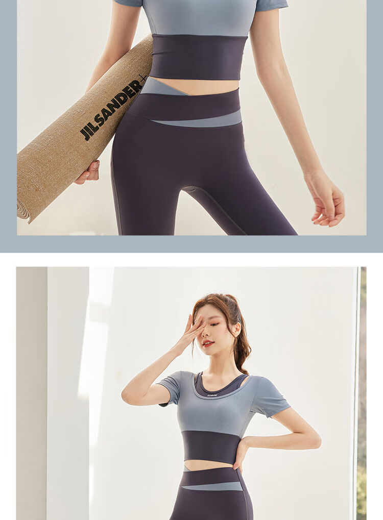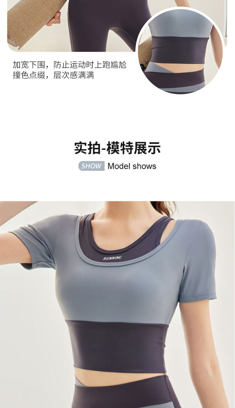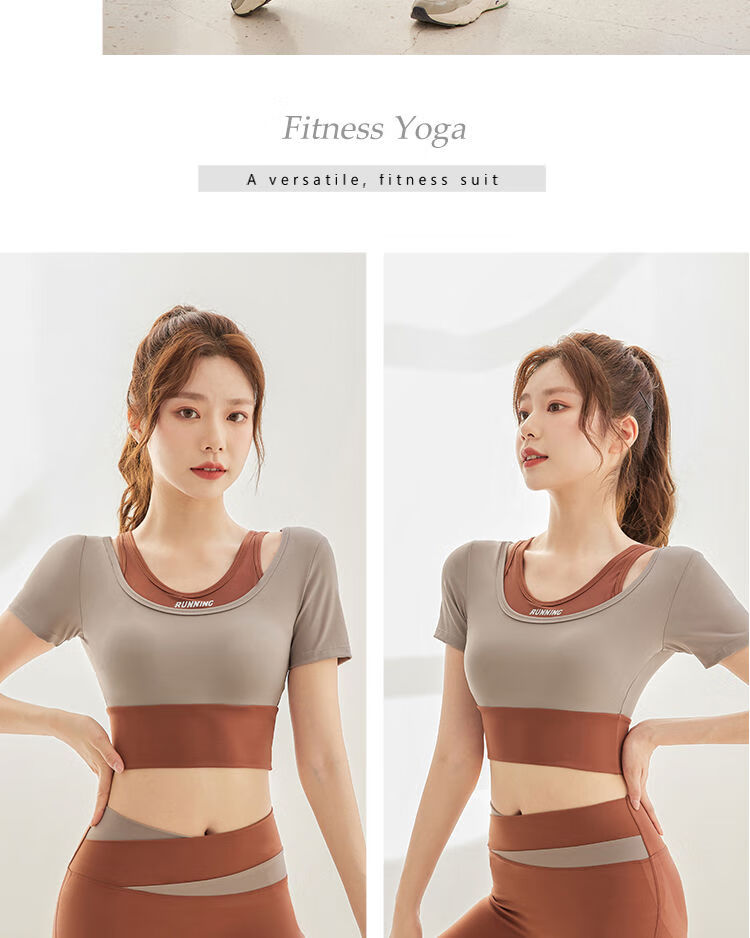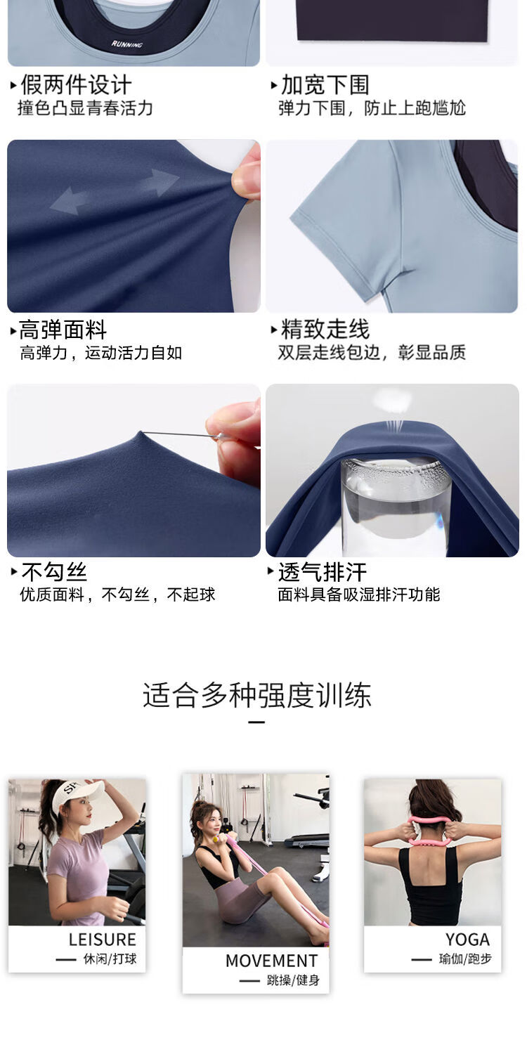 Summer Slim Fake Two Piece Pilates Yoga Short Sleeve Top Women's Quick Dry Running Training Fitness Clothing Set Blue - Short Sleeve Fixed Chest Pad 2XL 2XL Size 130 Jin Jin equals 0.5 kg -145 Jin Jin equals 0.5 kg