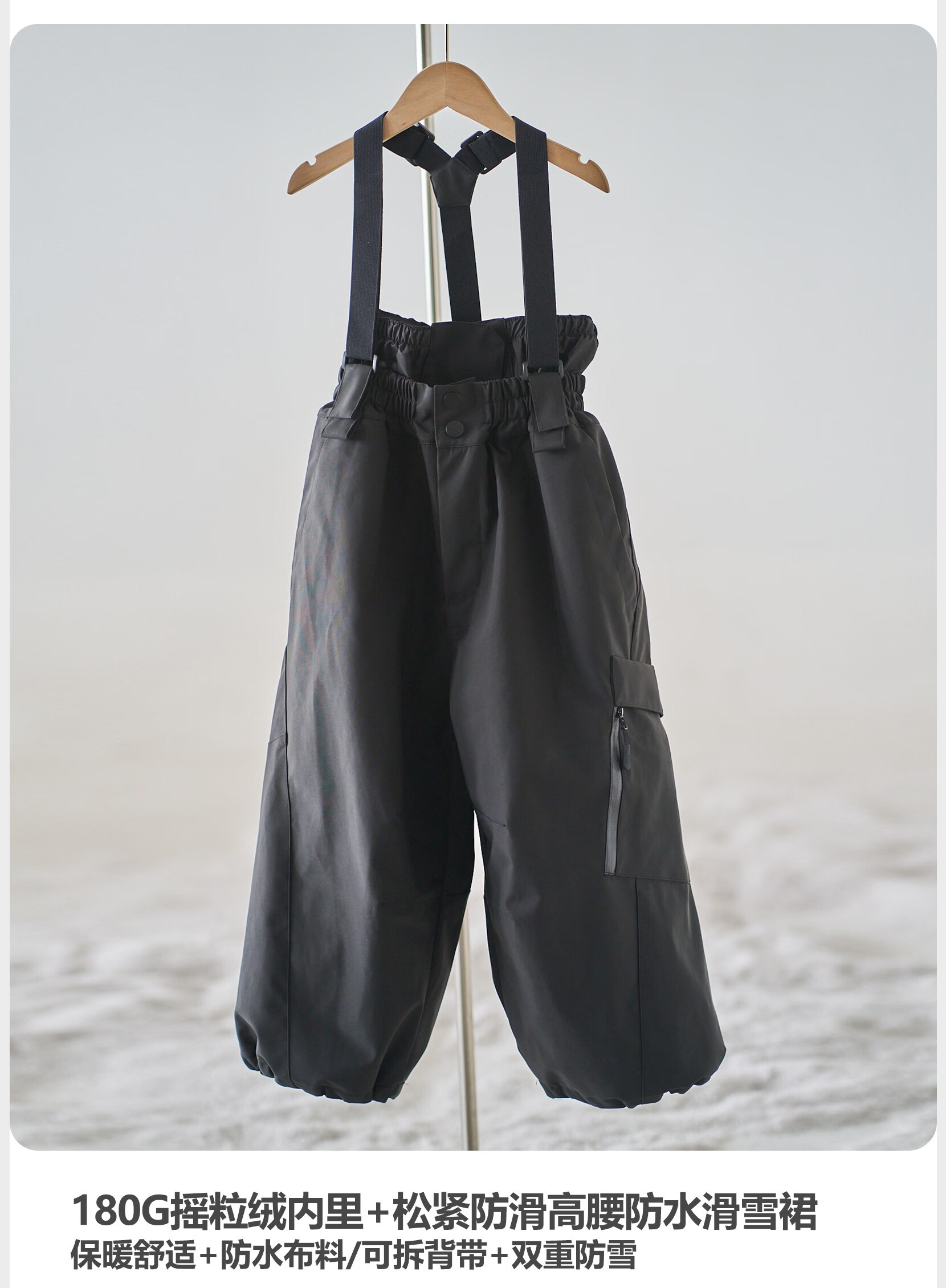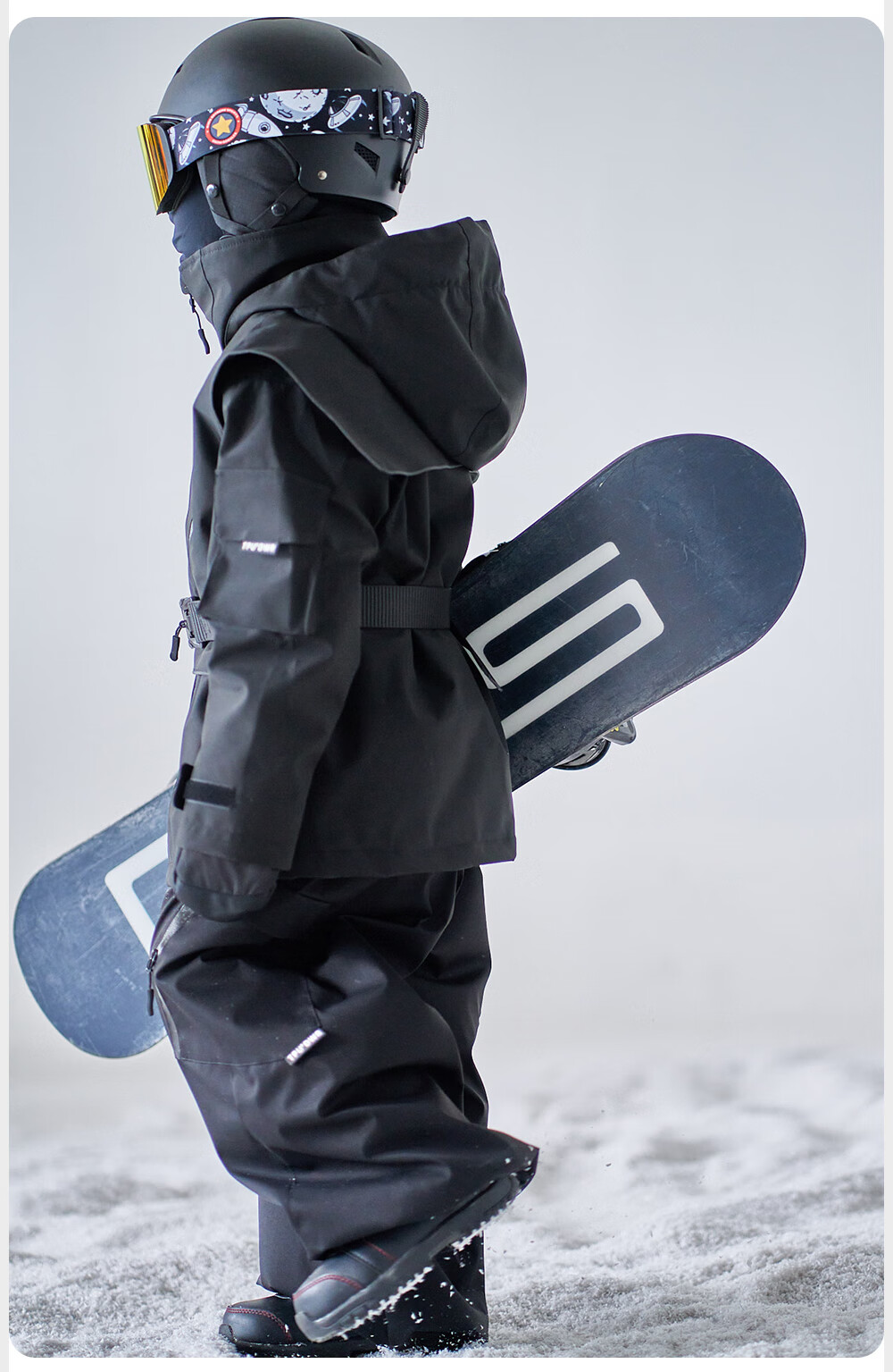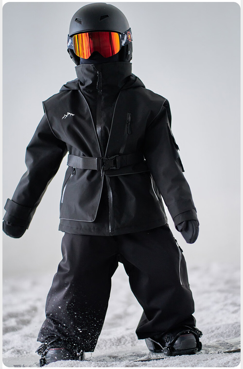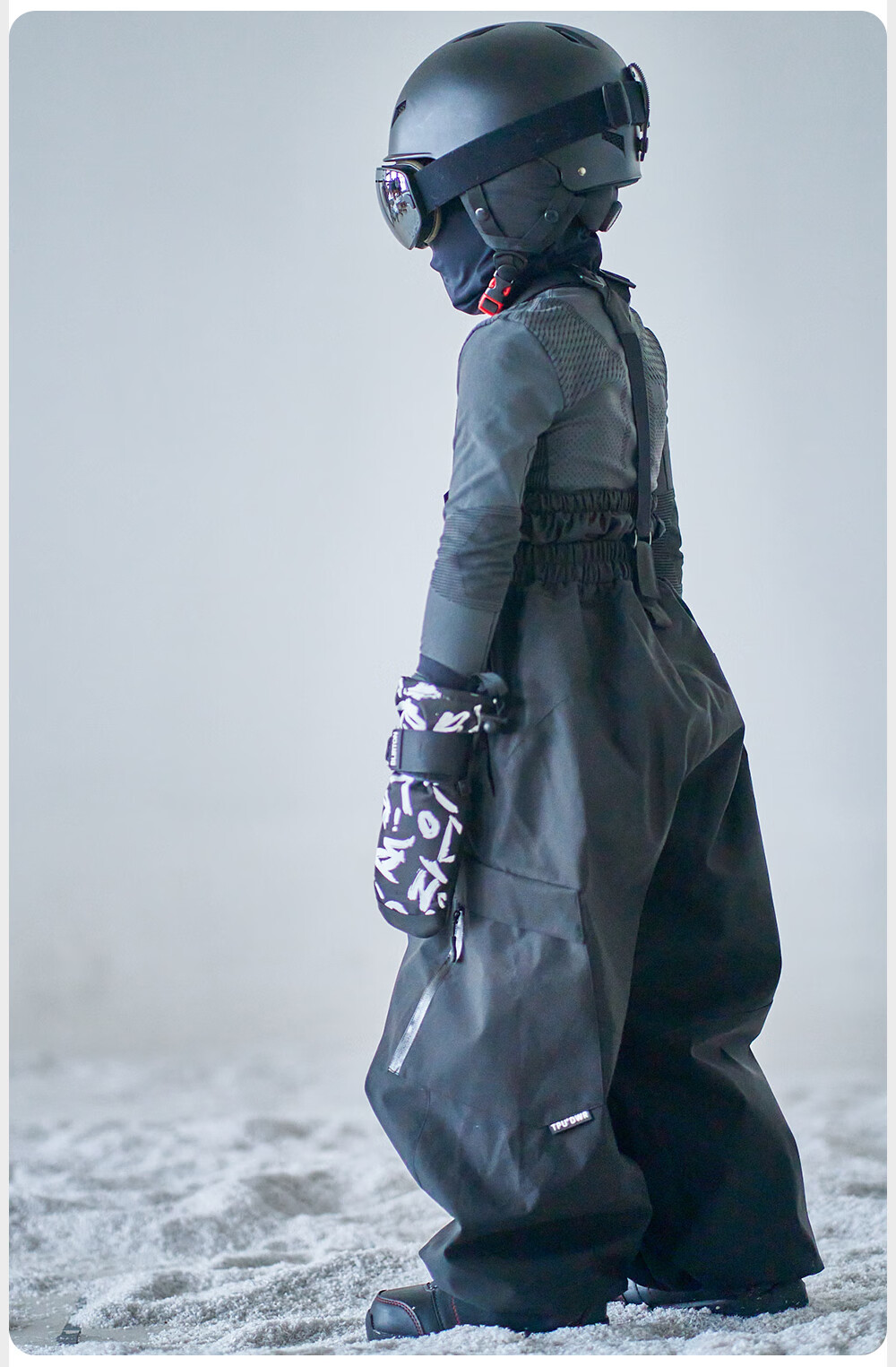 IMGO Black Warrior Professional Children's Ski Wear, Boys and Girls 3L Hard Shell Waterproof and Cotton Thickened Clothing Set, Black Overalls, One Size 150