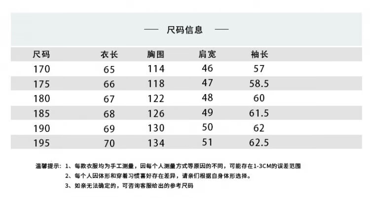 China (cm) 165 / 88-90 170 / 96-98 175 / 108-110 180 / 118-122 185 / 126-130