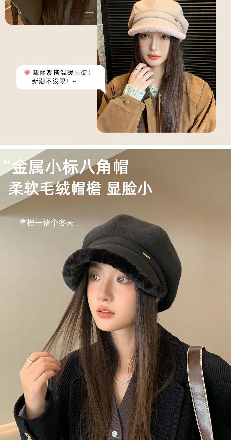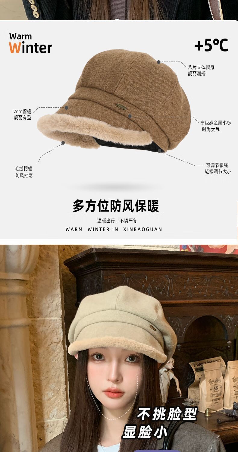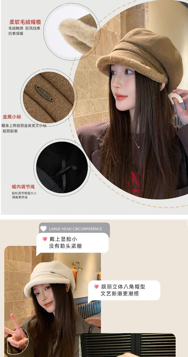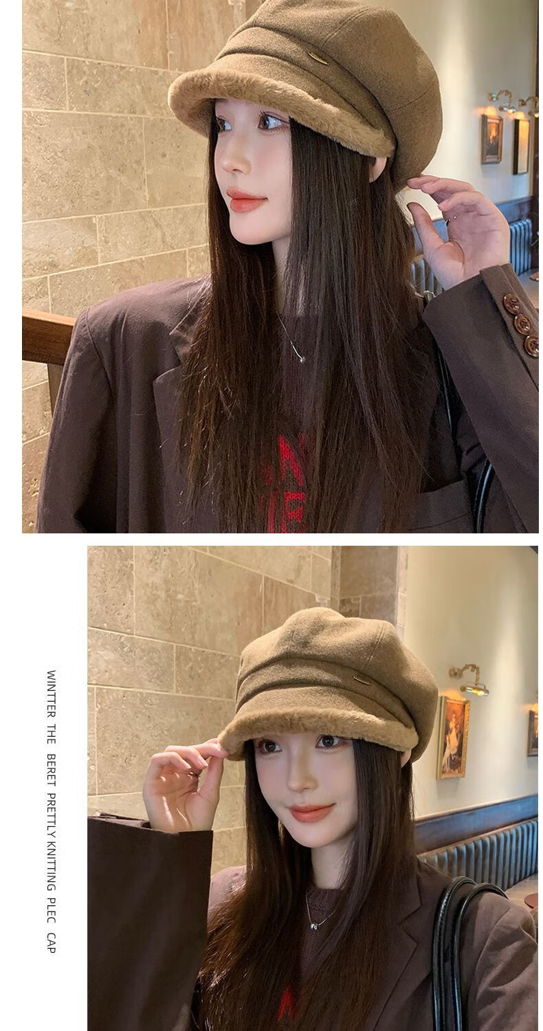 Pierre Cardin British retro fisherman hat octagonal hat women's autumn and winter warm beret plus down duck tongue Japanese ear protection versatile 8979-Coffee One size fits all 55-60 head circumference