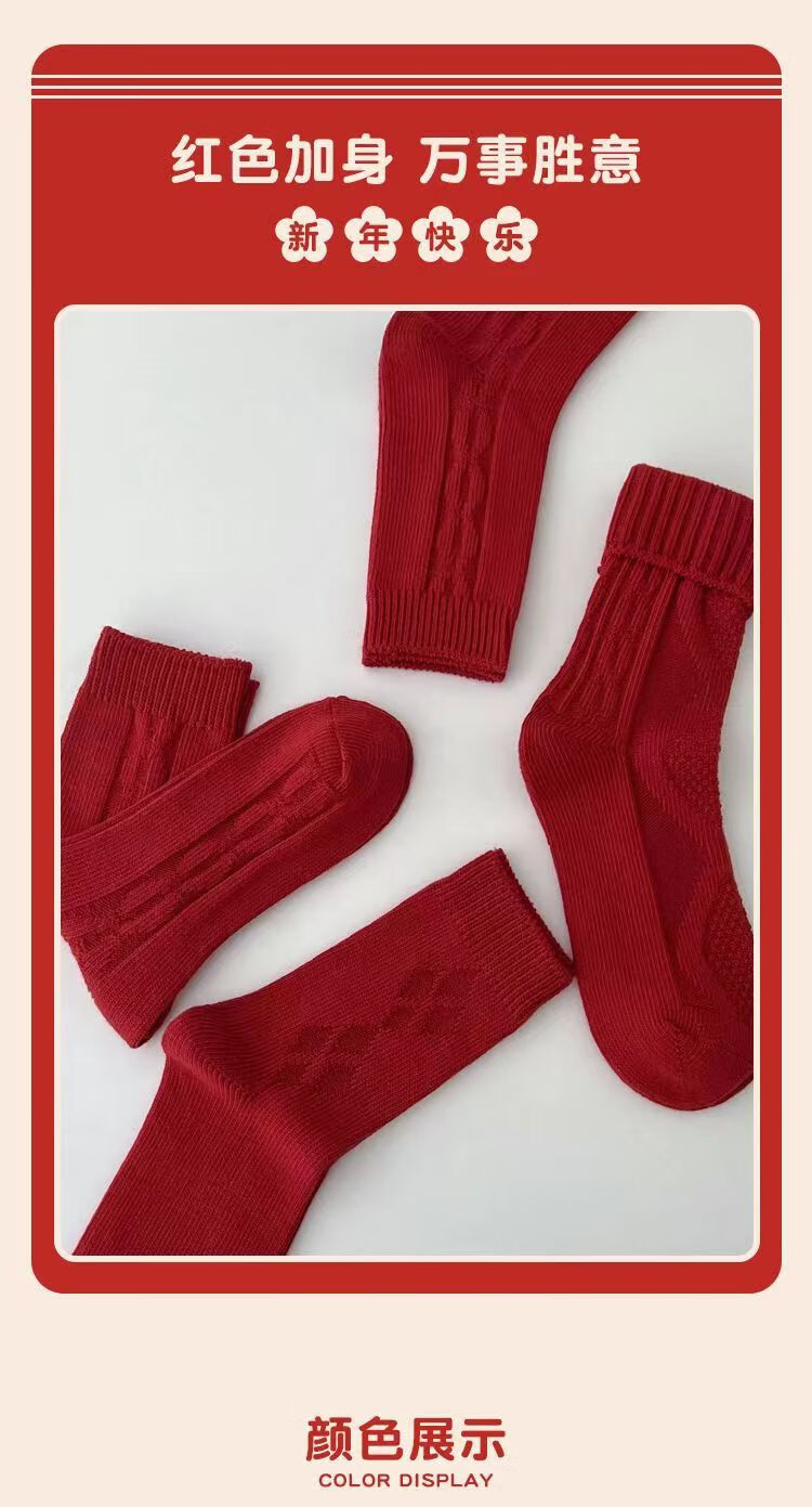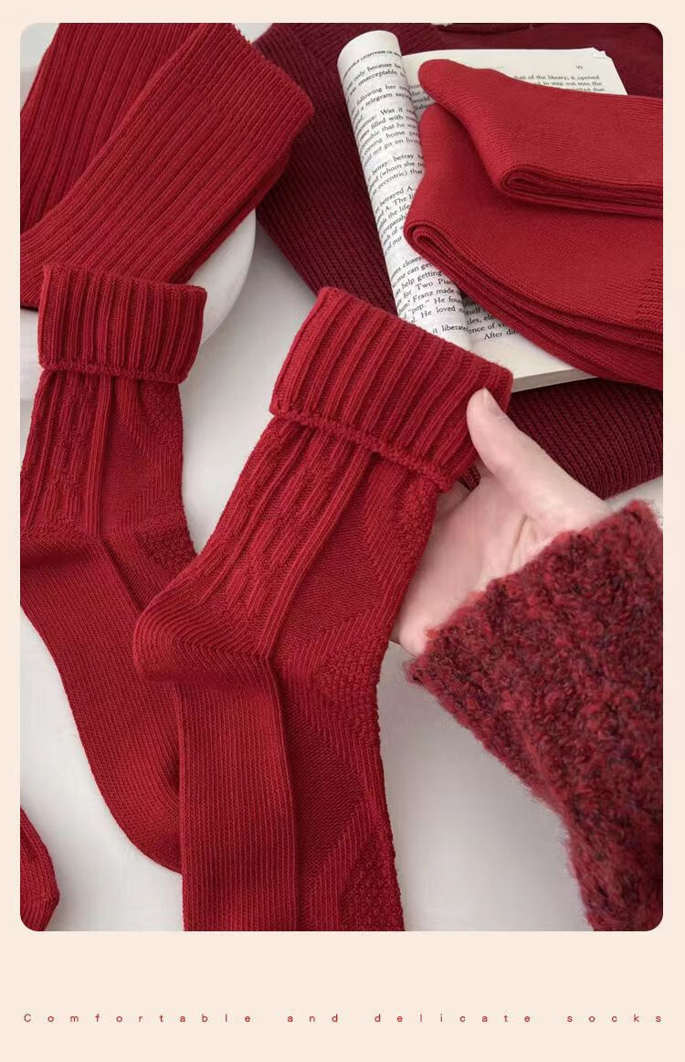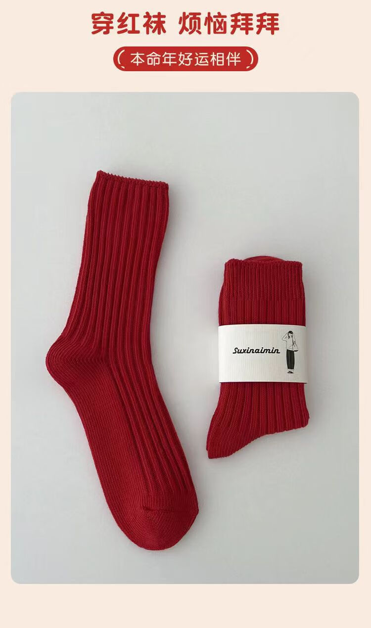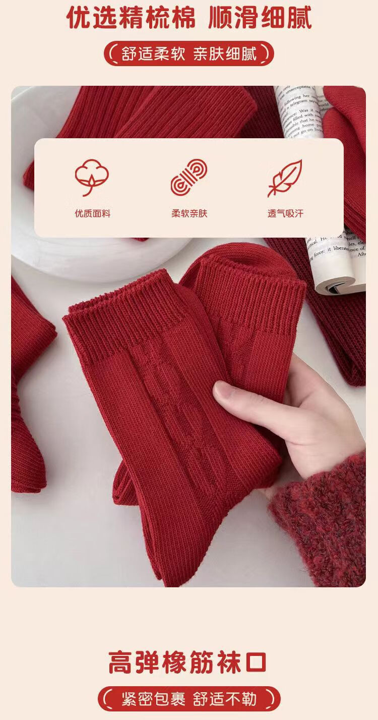 Big red socks women's mid-calf solid color cotton socks autumn and winter year of the dragon animal year wedding new year warm stockings twist three pairs one size