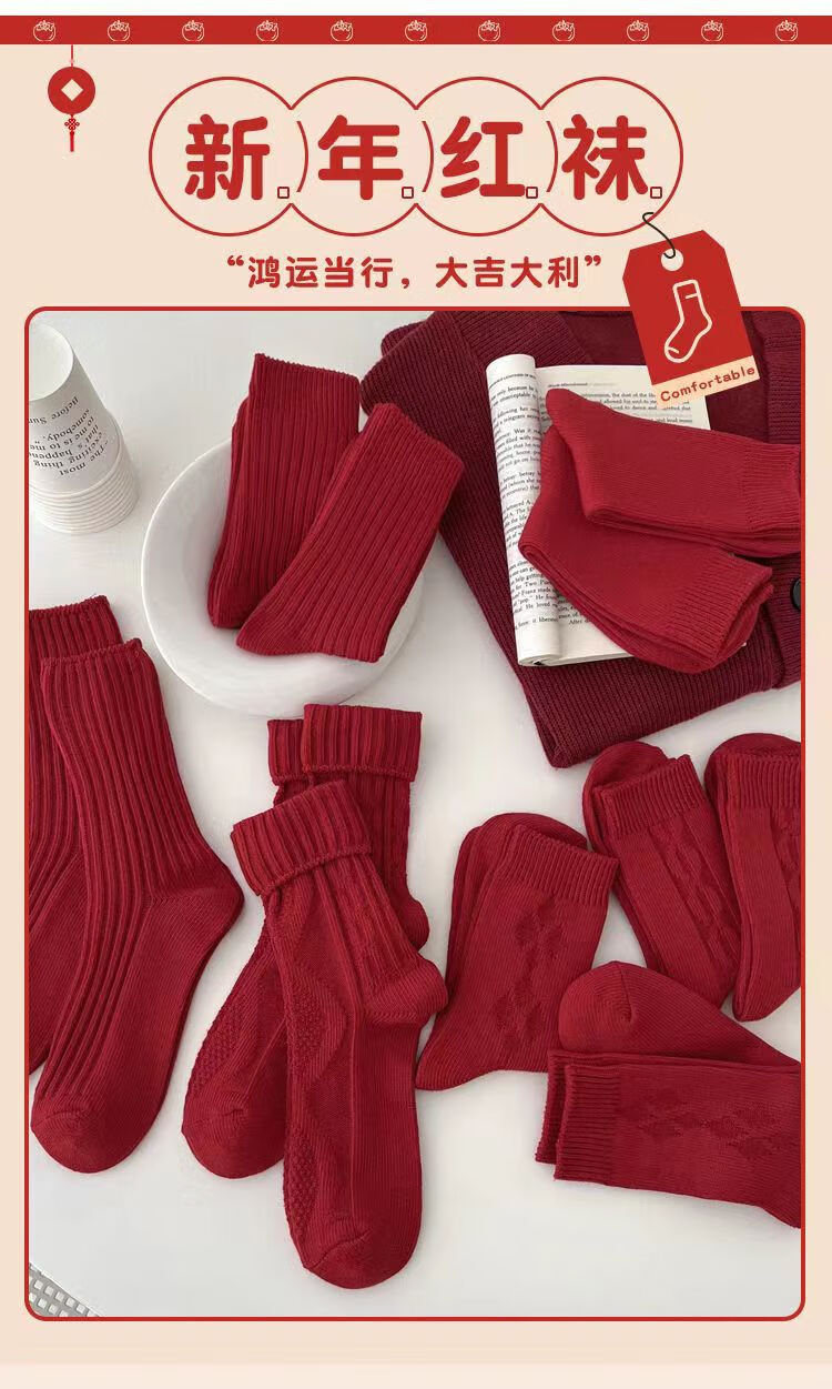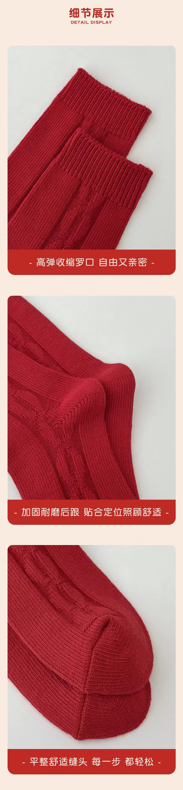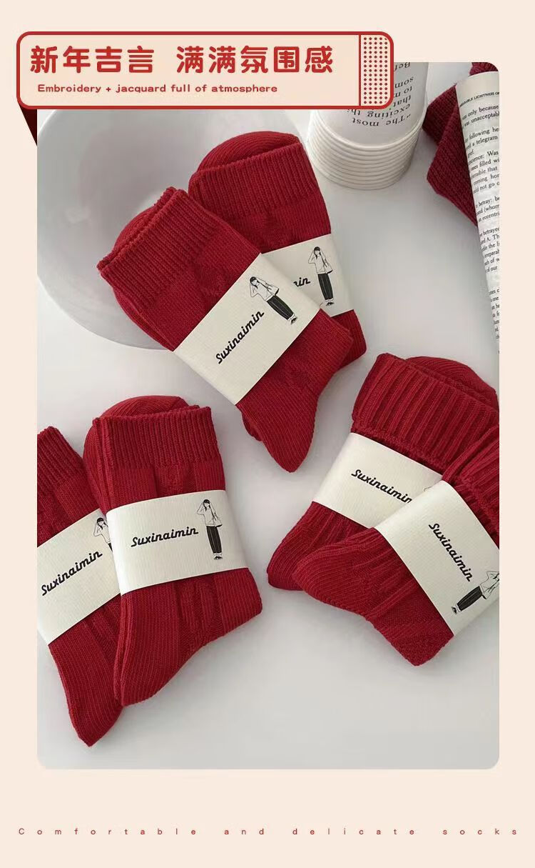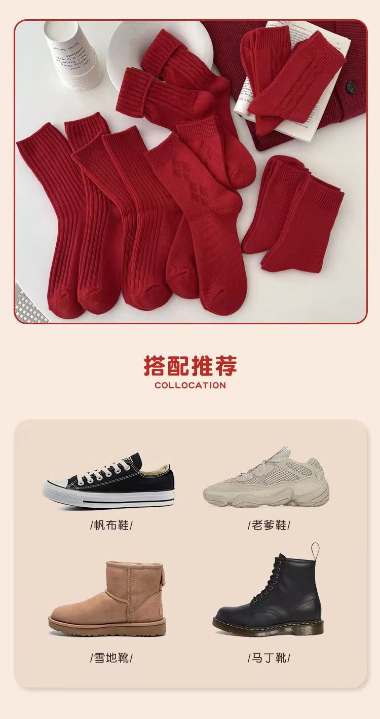 Big red socks women's mid-calf solid color cotton socks autumn and winter year of the dragon animal year wedding new year warm stockings twist three pairs one size