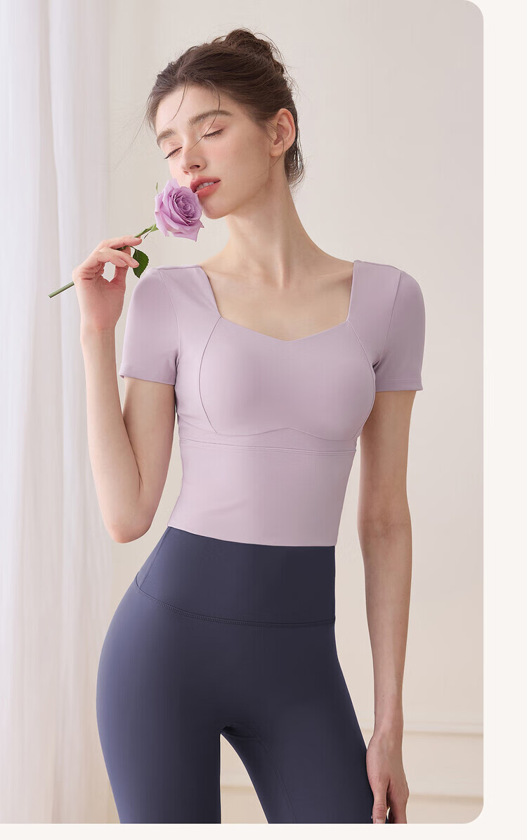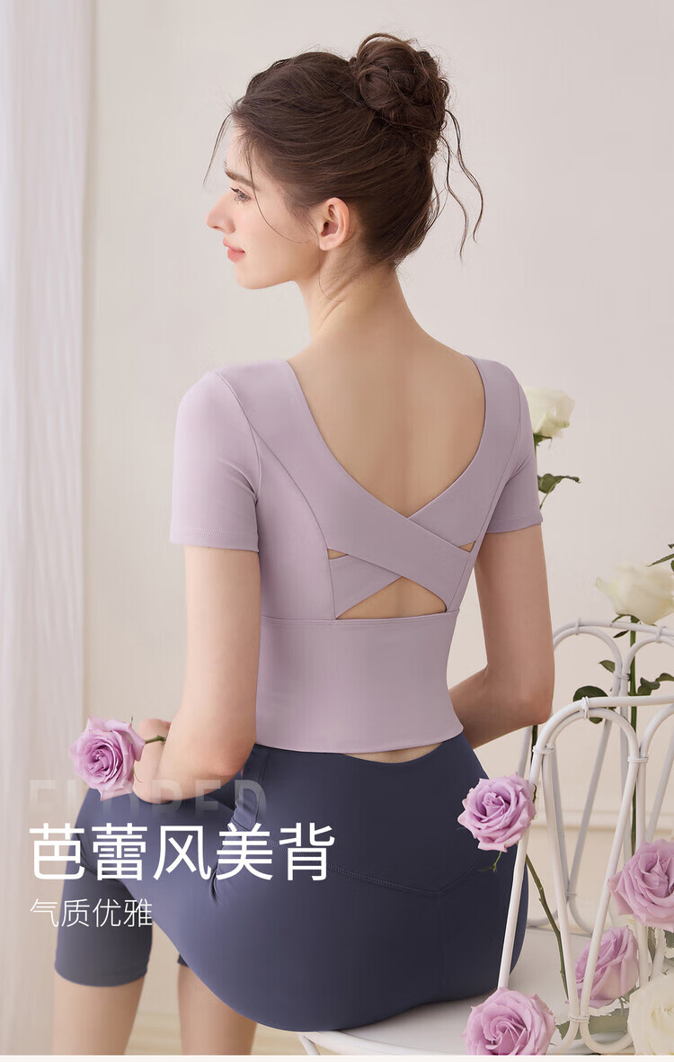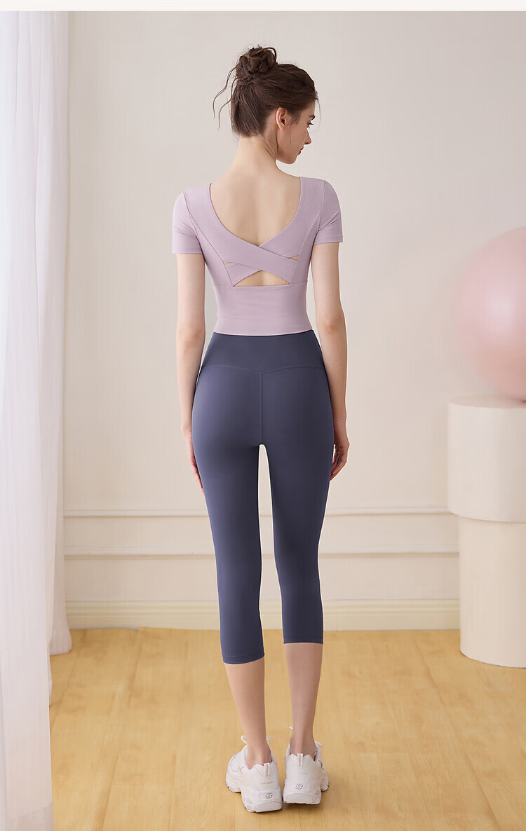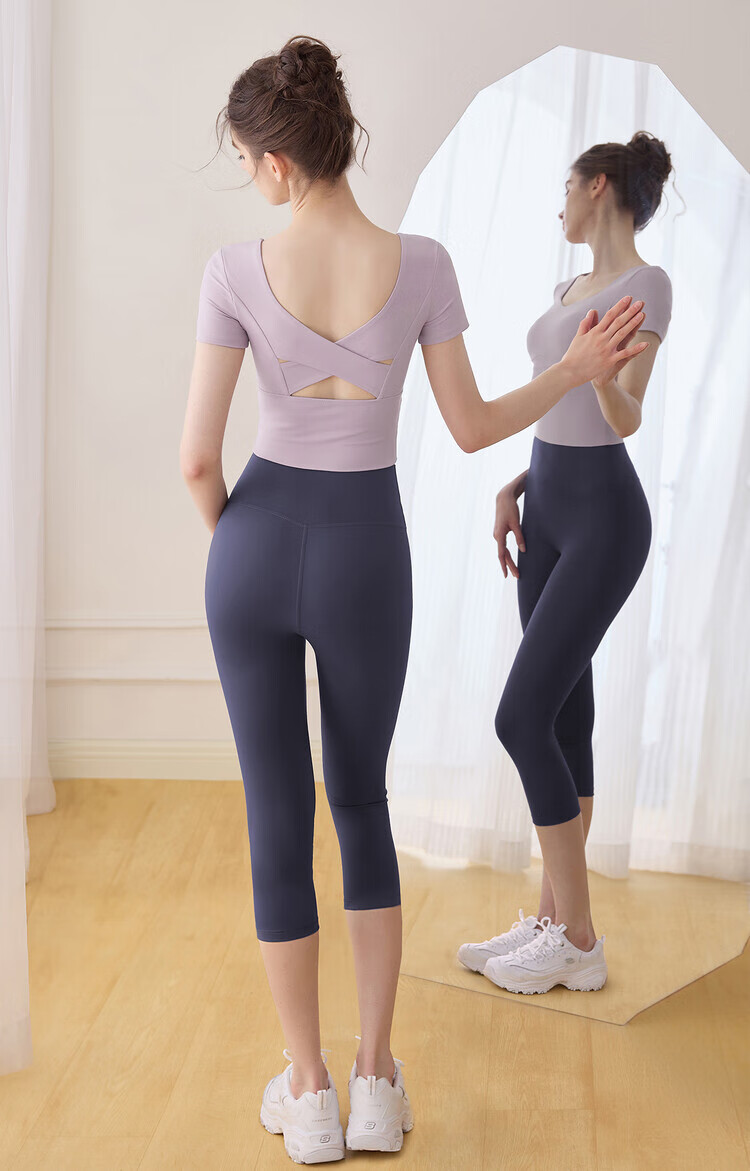 Yoga wear women's suit 2025 new high-end sense with chest pad all-in-one Pilates good-looking fitness summer short-sleeved Fengxin purple short-sleeved + blue-gray cropped pants S