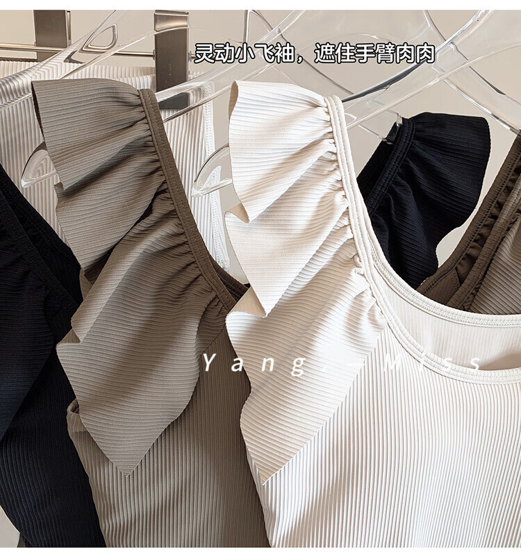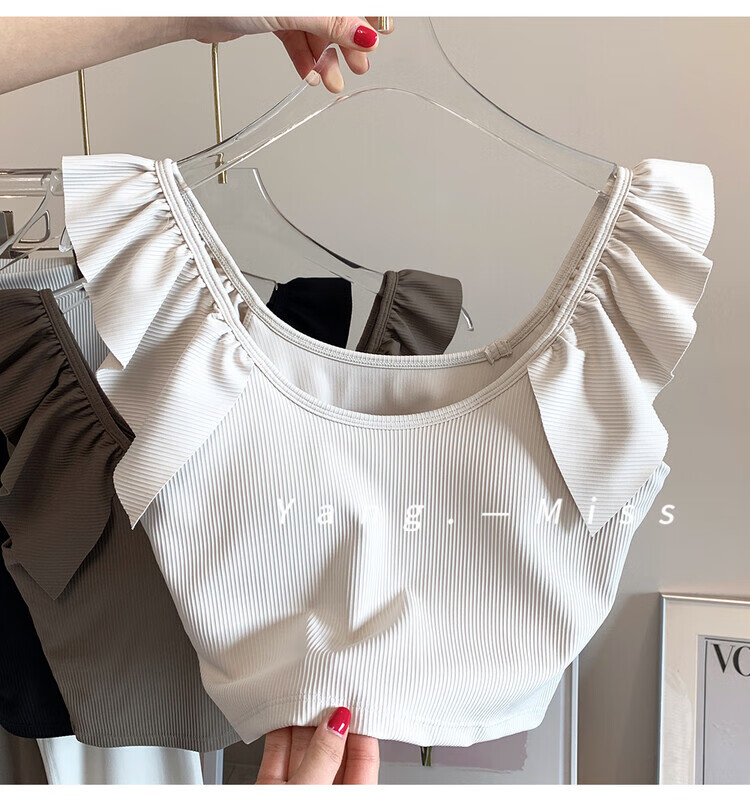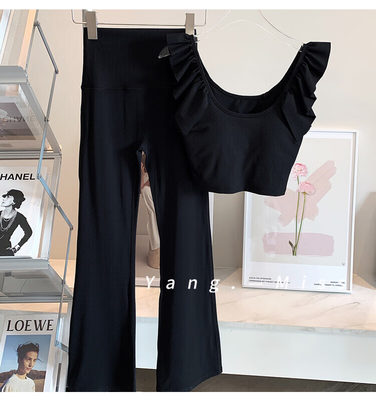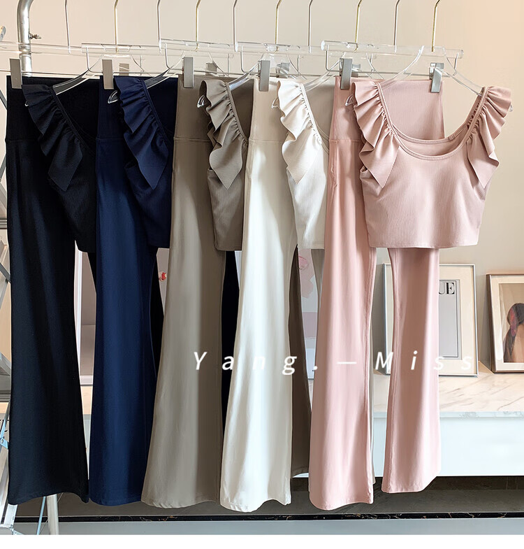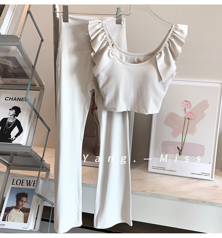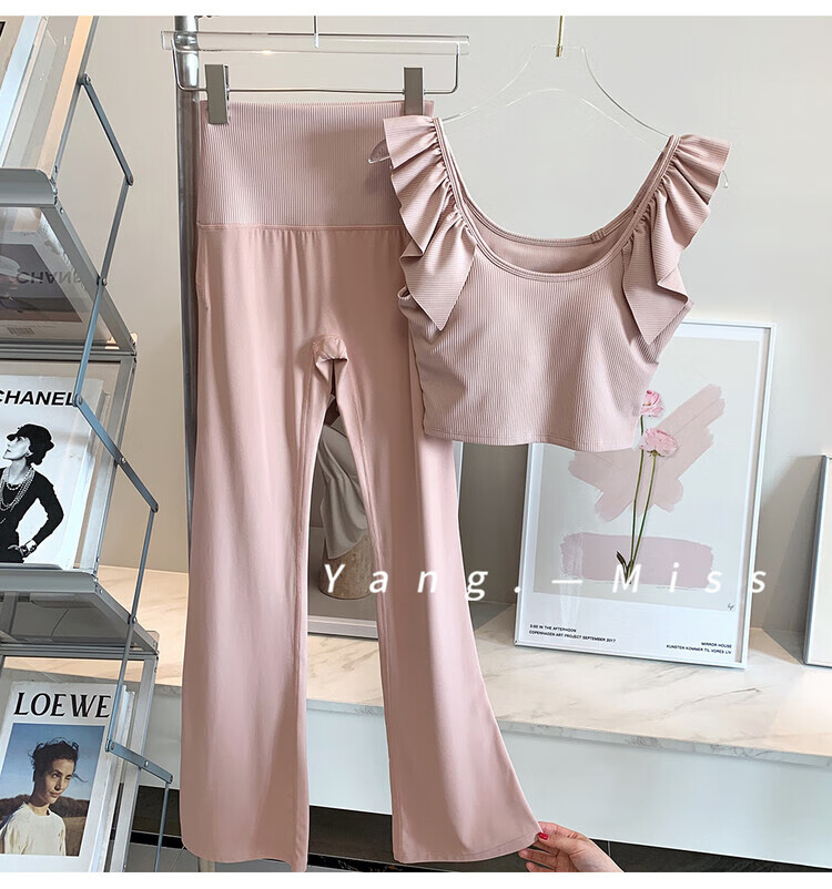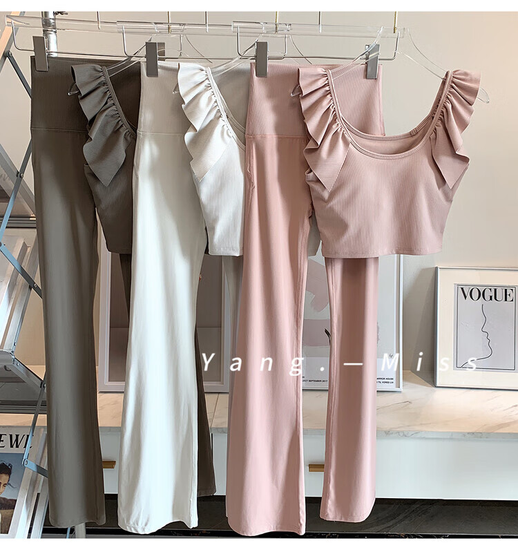 Women's Yoga Wear Suit New Fashionable Quick-Drying Fitness Pilates Ruffled Sports Vest High-waisted Flared Pants Albumin Vest (fixed chest pad) + pants Fresh and clean outfit S Recommended weight 85-100 Jin Jin equals 0.5 kg