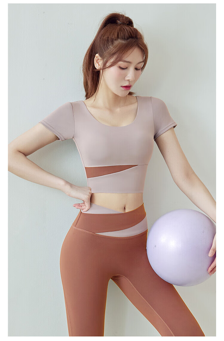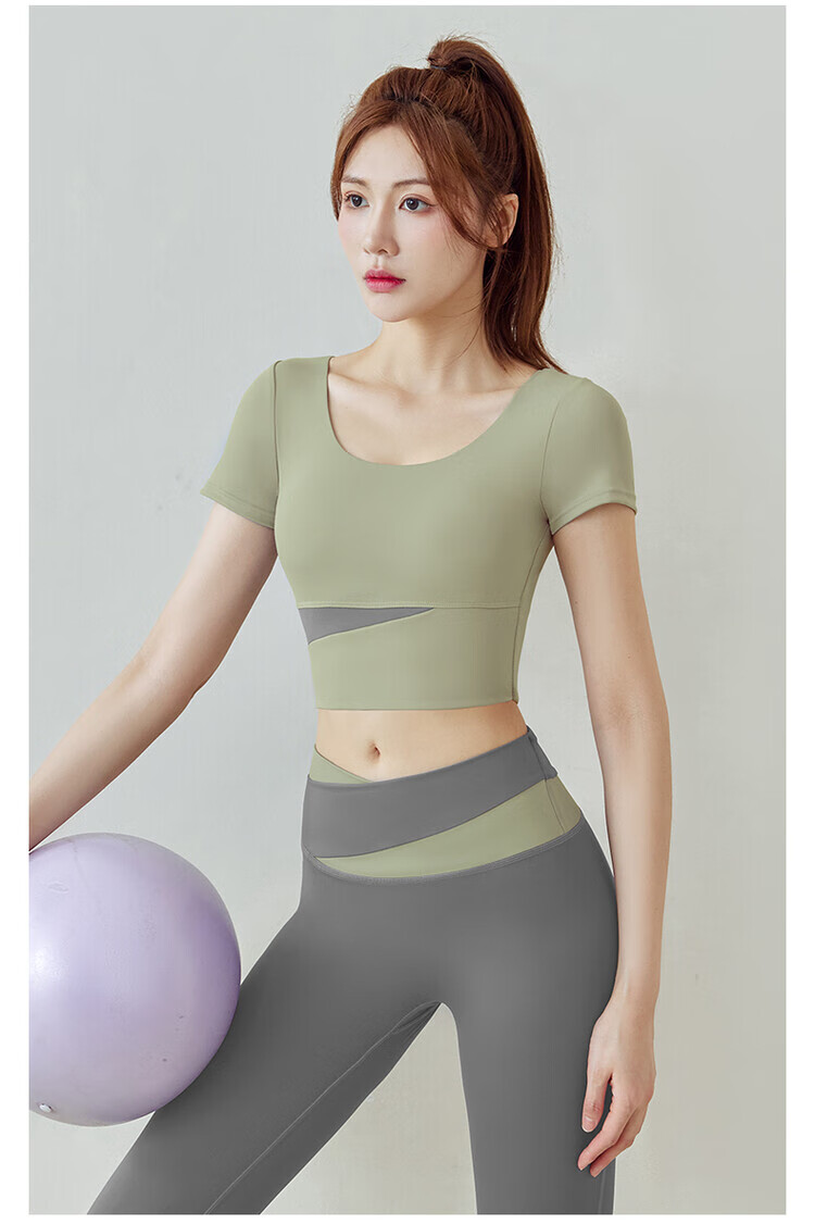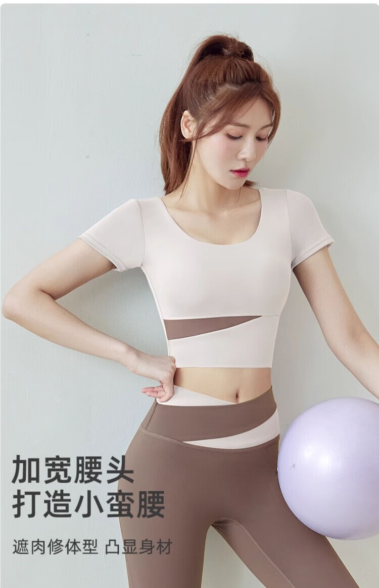 Yoga clothes for women 2025 new style Pilates training morning running fitness sports large size short-sleeved top suit autumn short-sleeved + trousers gray lake blue + whale blue S (recommended 85-95Jin Jin equals 0.5 kg)