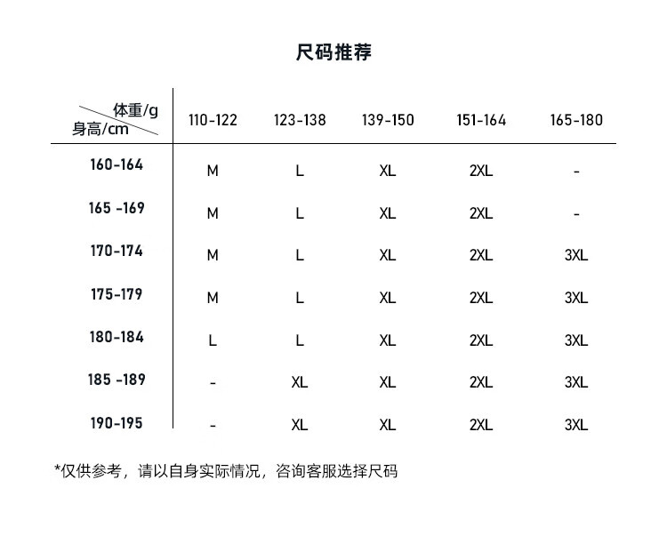 China (cm) 160-165/84-86 165-170 / 88-90 167-172 / 92-96 168-173 / 98-102 170-176 / 106-110