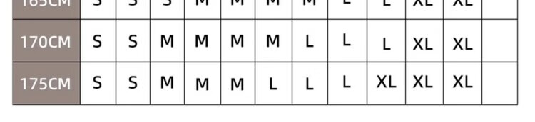 China (cm) 165 / 88-90 170 / 96-98 175 / 108-110 180 / 118-122 185 / 126-130