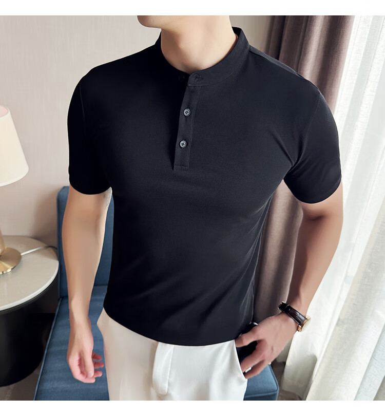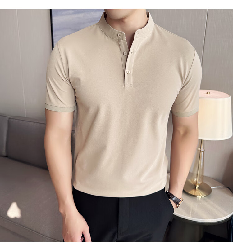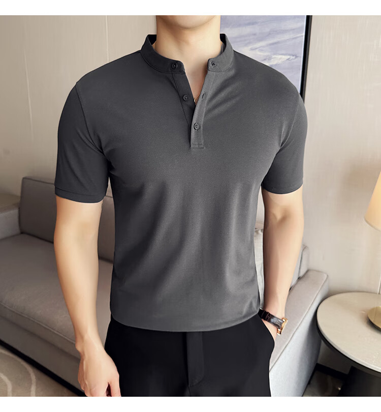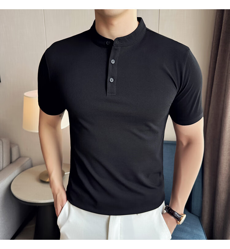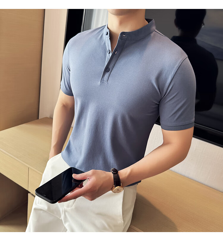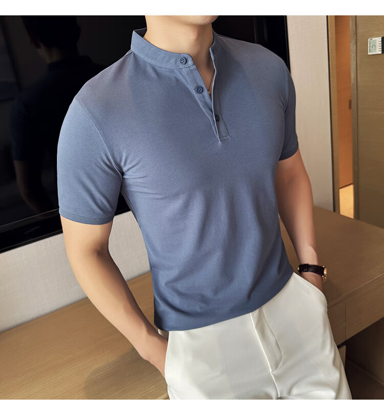 Qing Muqi New Chinese Henry Collar Short Sleeve POLO Shirt Men's 2025 New Summer High-Quality Stand Collar T-Shirt Mature and Stable Blue Stand Collar Polo Short Sleeve M Recommendation 90-105 Jin Jin is equal to 0.5 kg