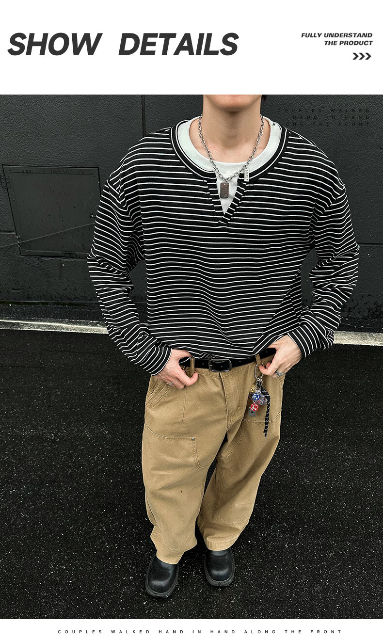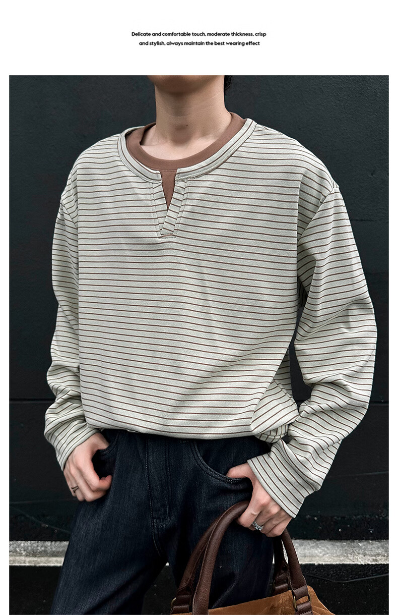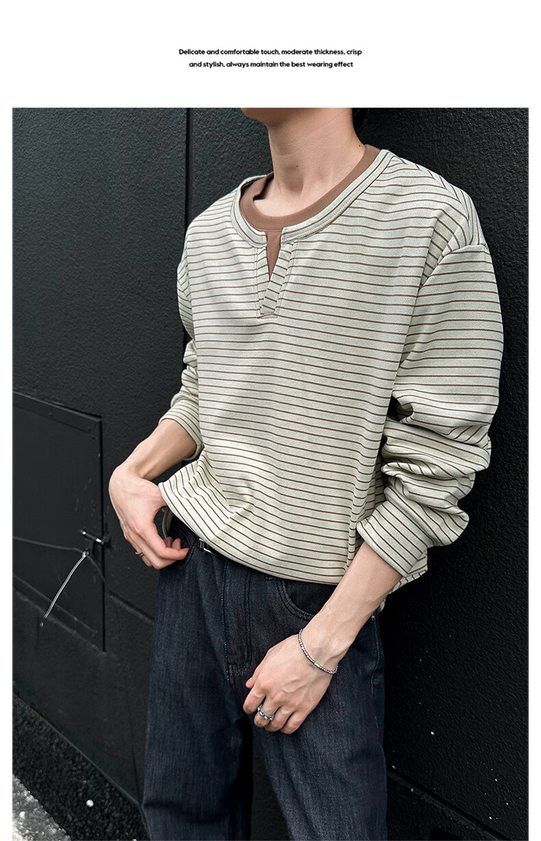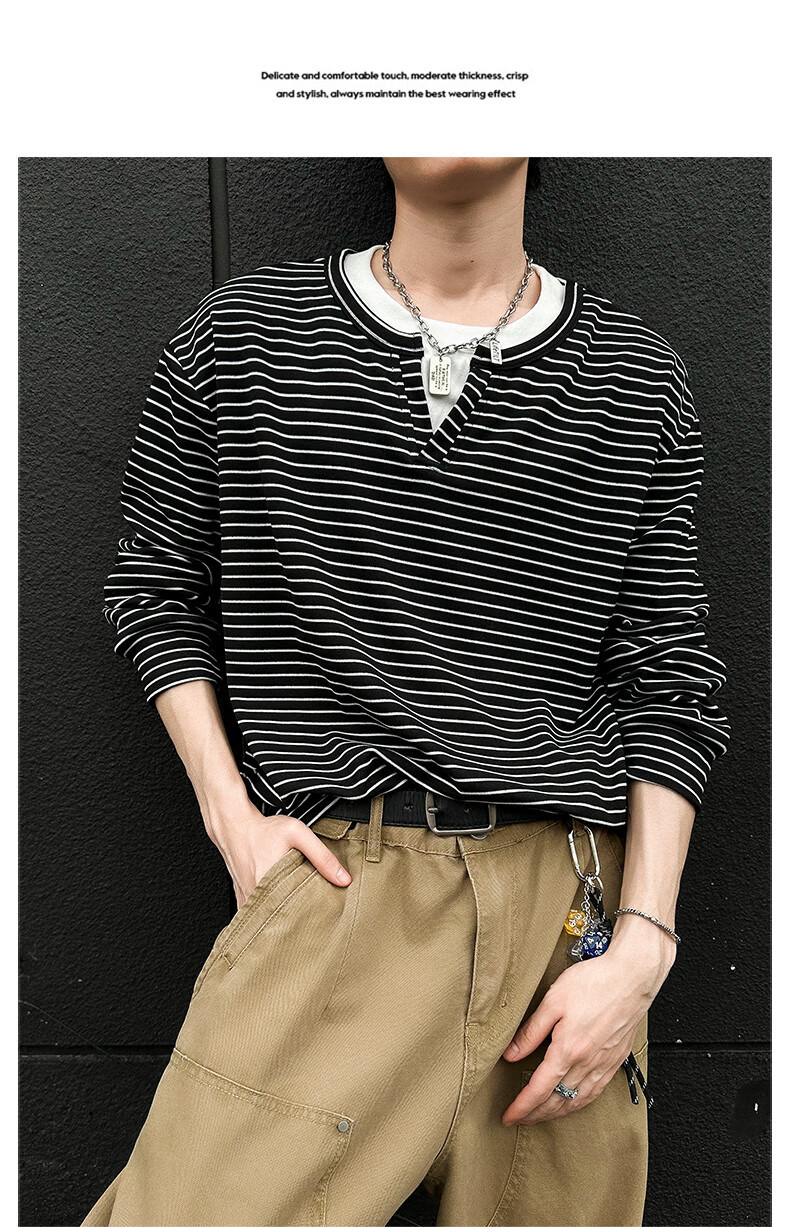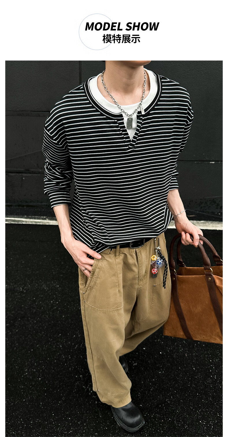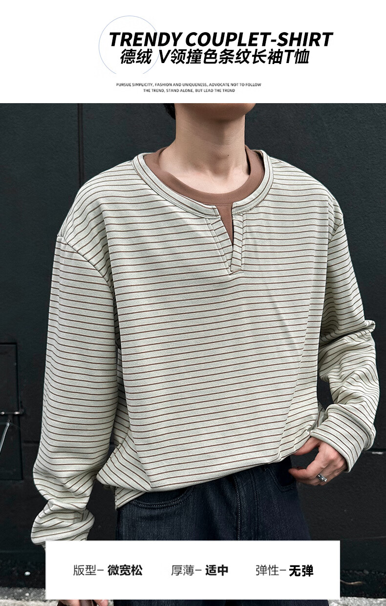 Fake two-piece V-neck striped long-sleeved T-shirt men's autumn and winter trendy Henry collar German velvet bottoming shirt loose casual sweatshirt black MT2581 M Recommendation 105-125Jin Jin is equal to 0.5 kg