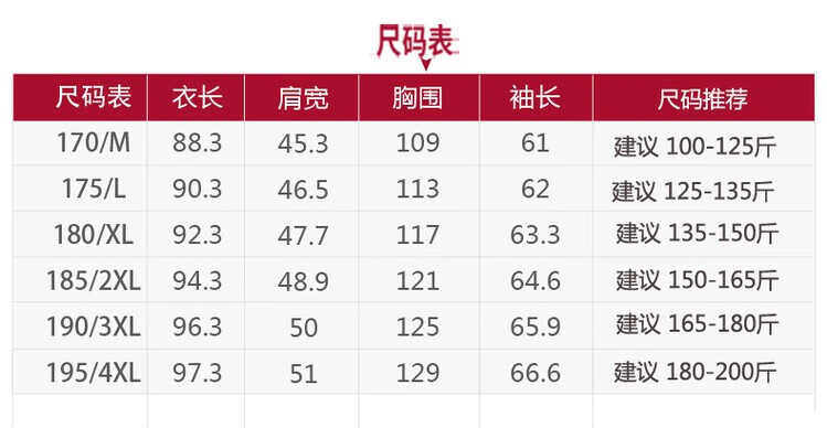 China (cm) 165 / 88-90 170 / 96-98 175 / 108-110 180 / 118-122 185 / 126-130