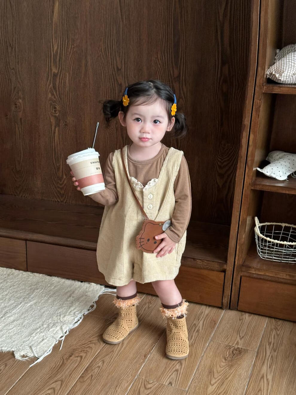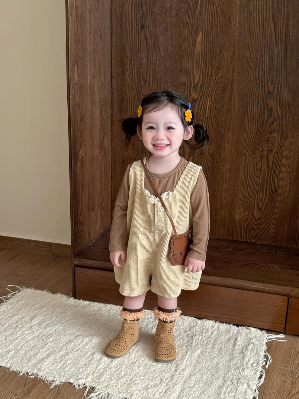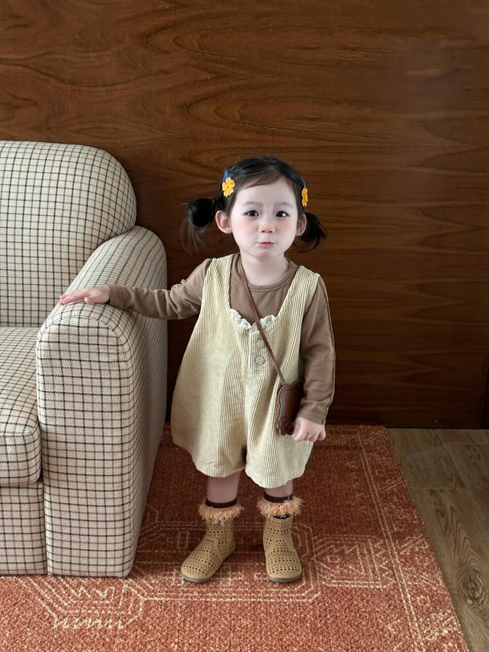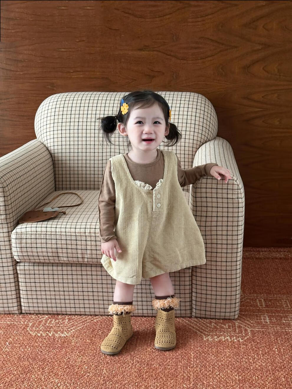Girls overalls set baby autumn style corduroy jumpsuit versatile long-sleeved T-shirt two-piece set khaki overalls 80 cm