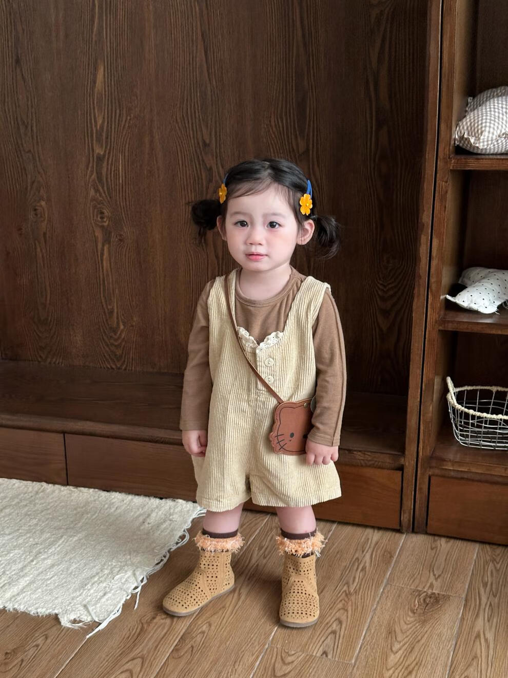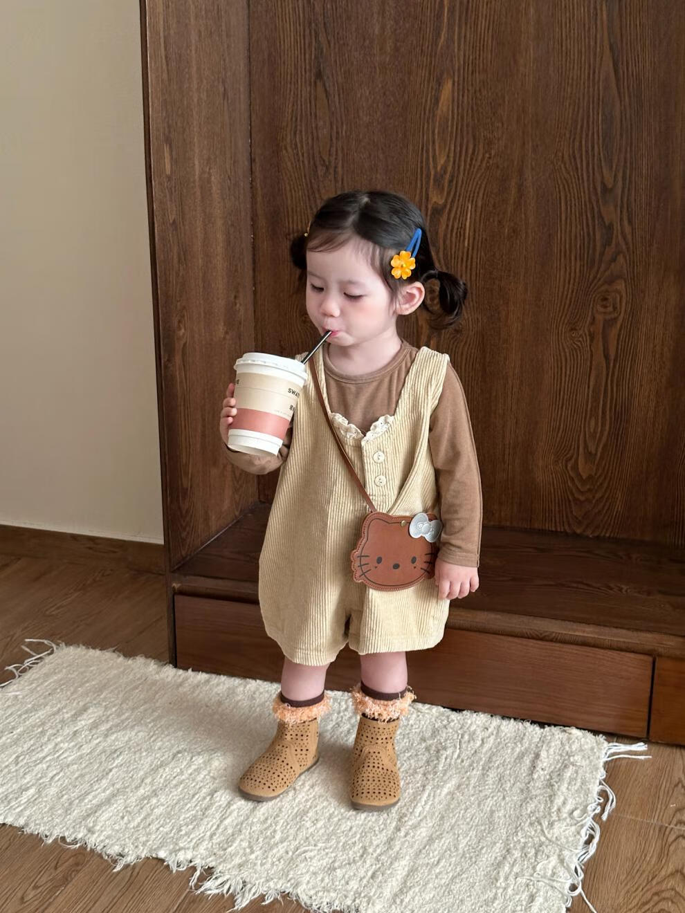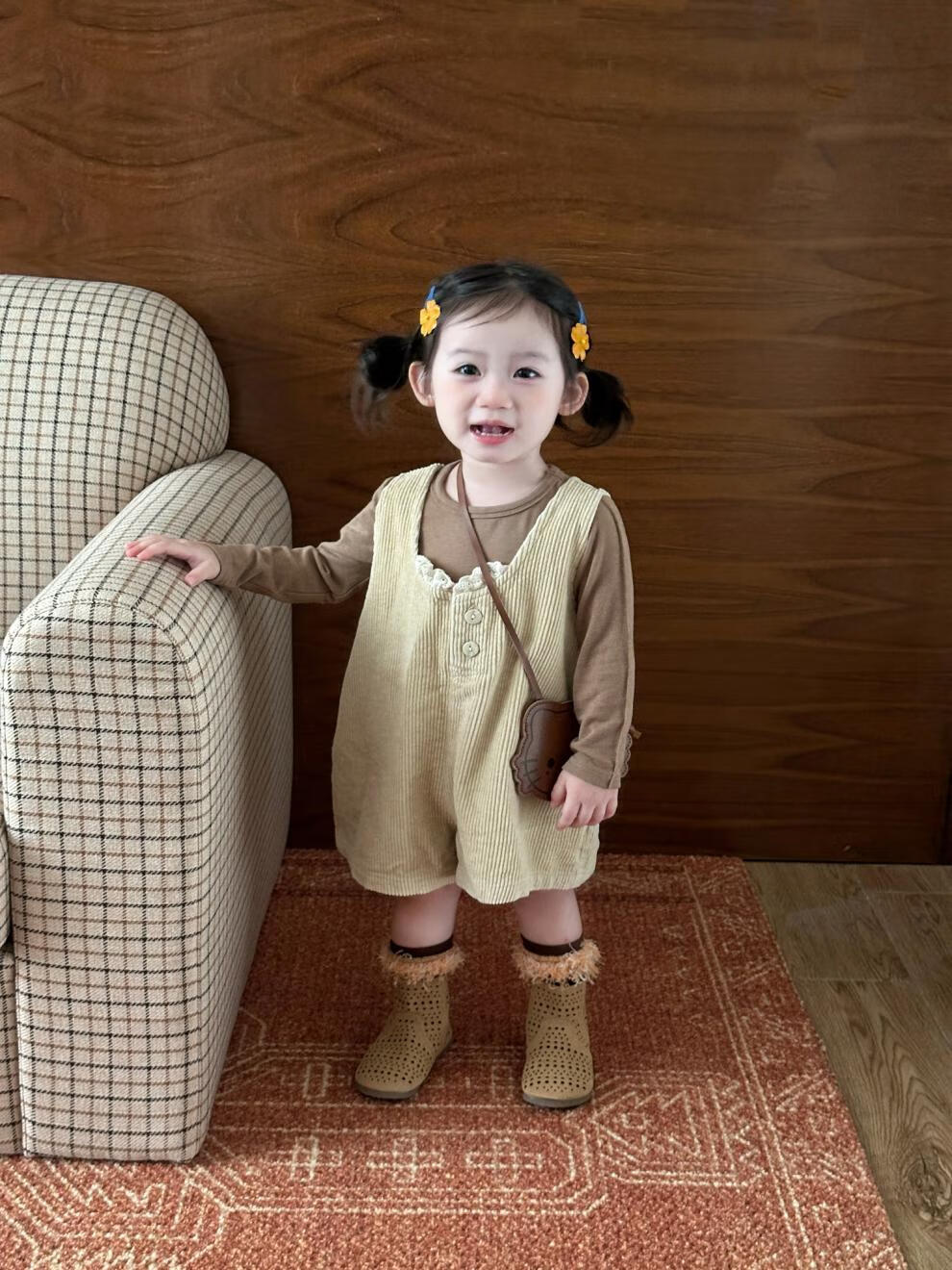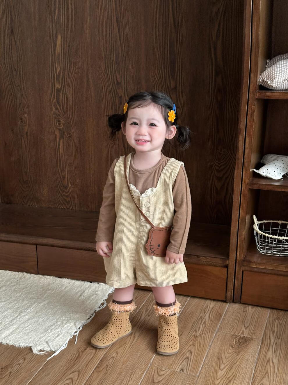 Girls overalls set baby autumn style corduroy jumpsuit versatile long-sleeved T-shirt two-piece set khaki overalls 80 cm