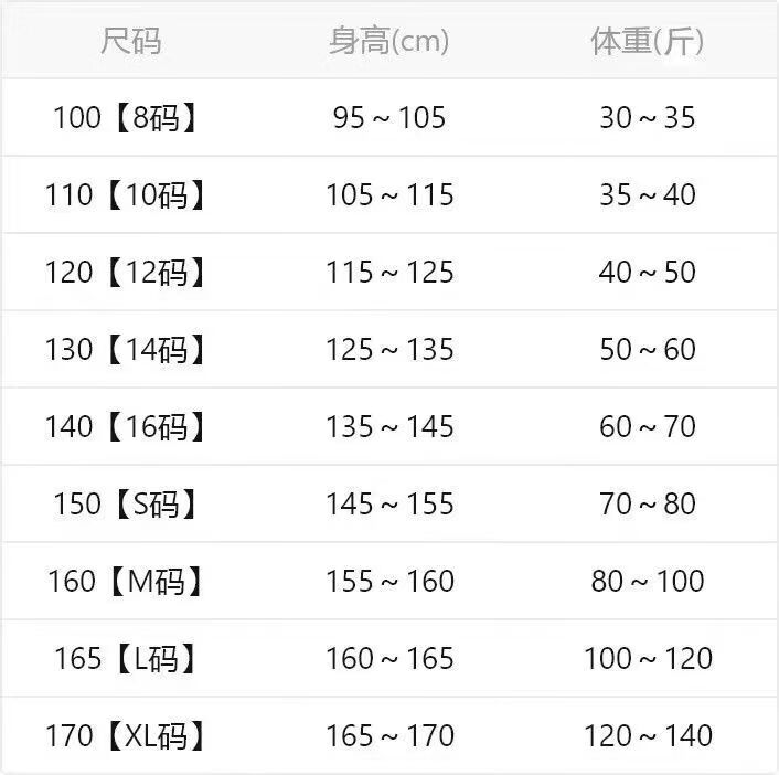China (cm) 160-165/84-86 165-170 / 88-90 167-172 / 92-96 168-173 / 98-102 170-176 / 106-110