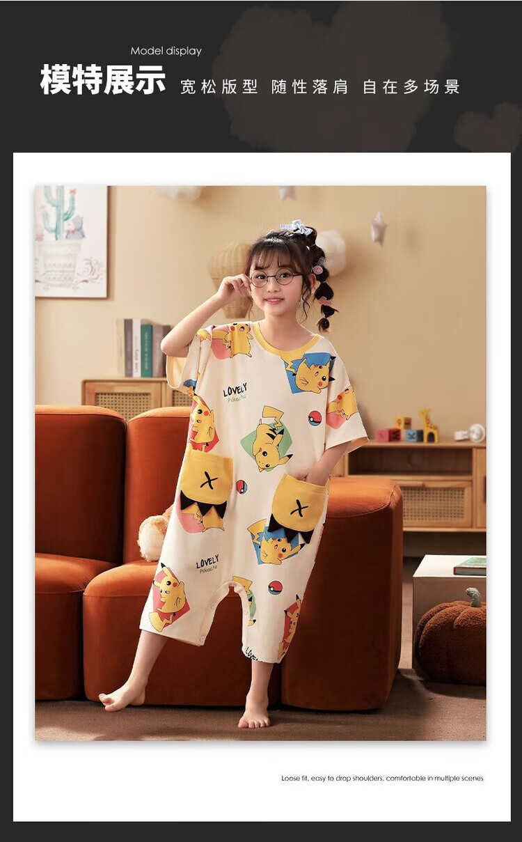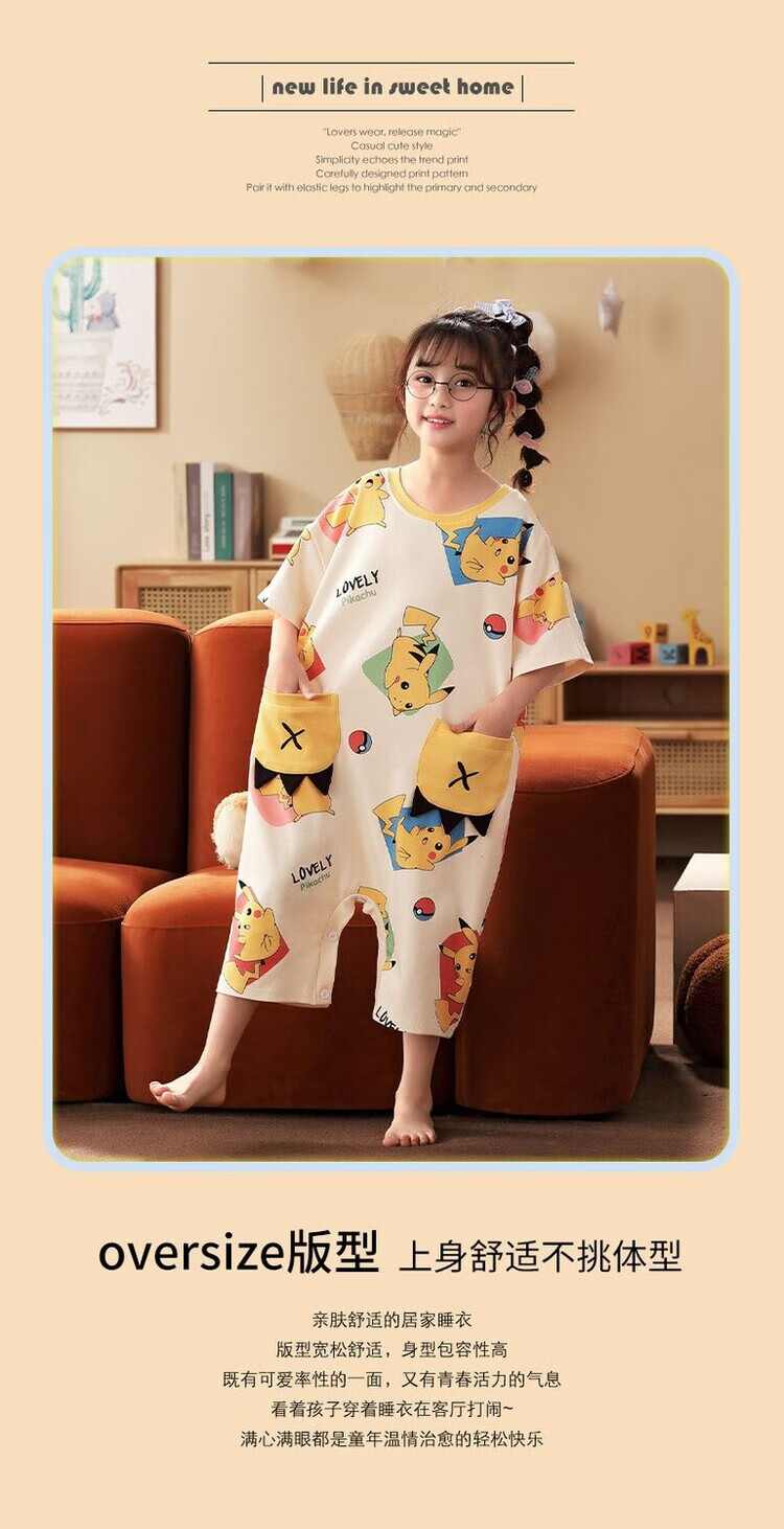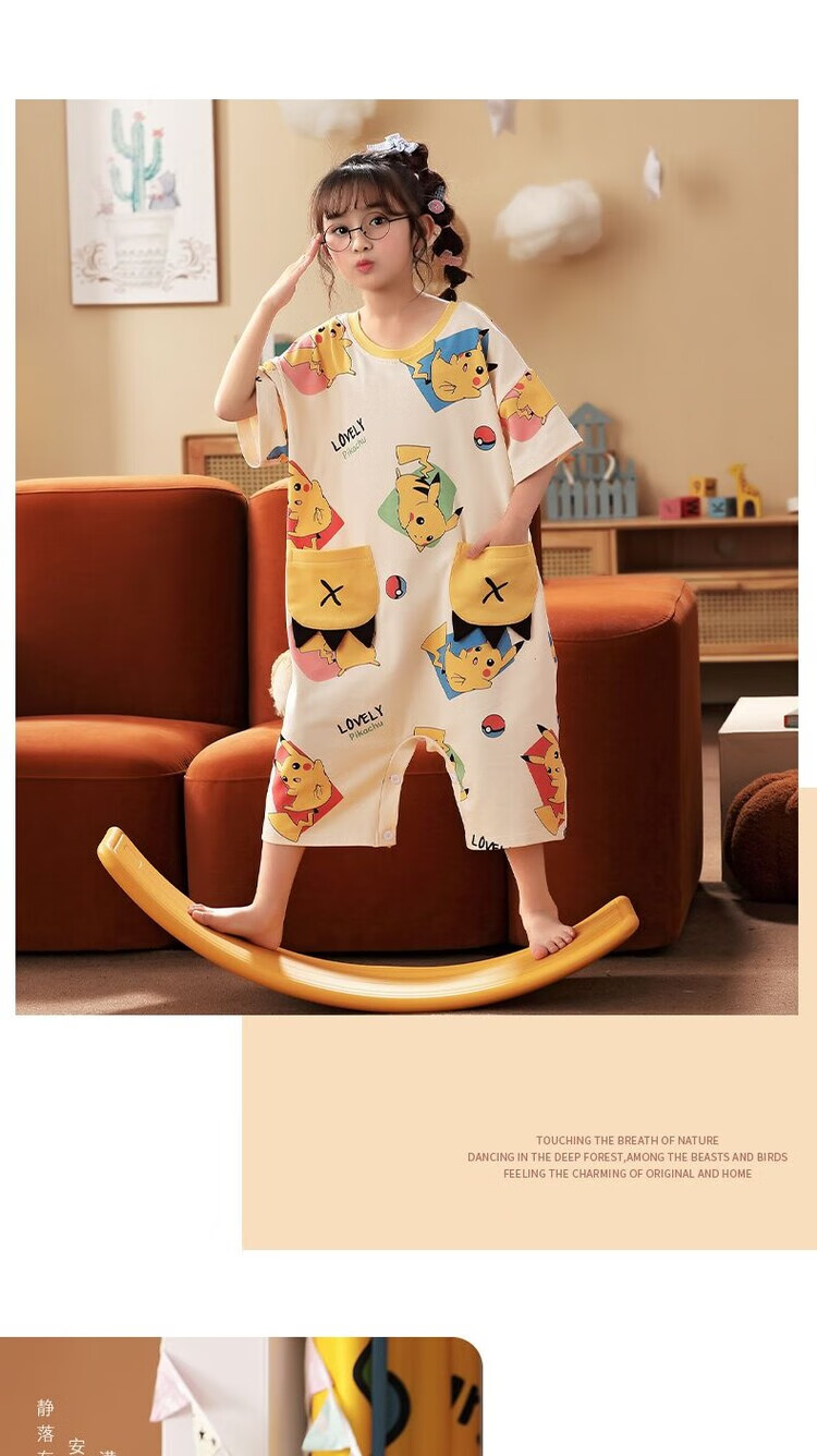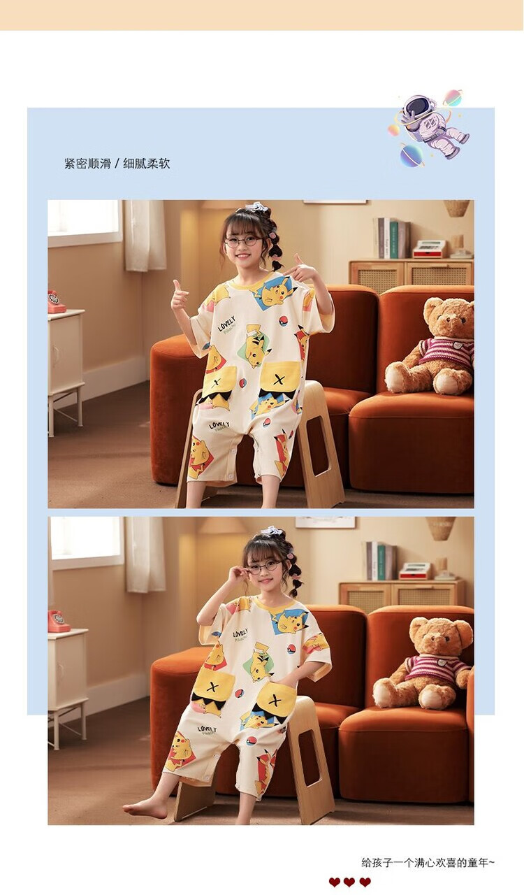 Girls one-piece pajamas summer thin pure cotton short-sleeved snap sleeping bag children baby little girl air-conditioned home clothes M02 one-piece cotton one-piece suit recommended by the store manager 90 size 8 height 90-103cm