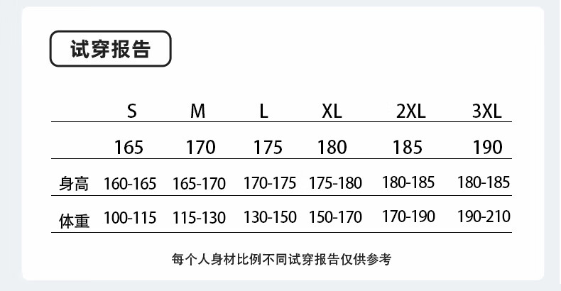 China (cm) 165 / 88-90 170 / 96-98 175 / 108-110 180 / 118-122 185 / 126-130