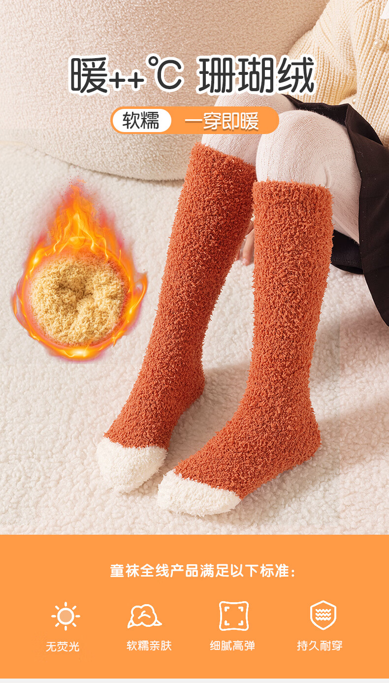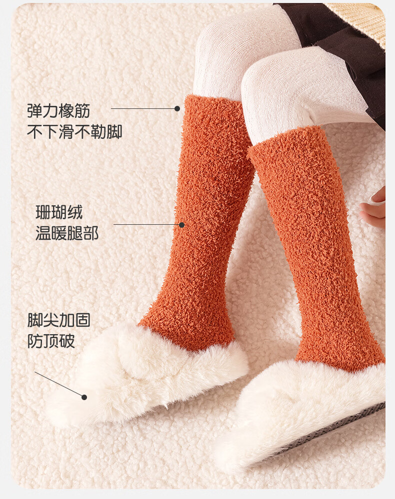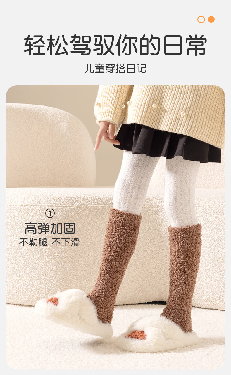 儿童秋冬长筒袜子男童女童珊瑚绒过膝加厚保暖护腿袜睡眠袜 咖色拼色 均码 均码3-15岁