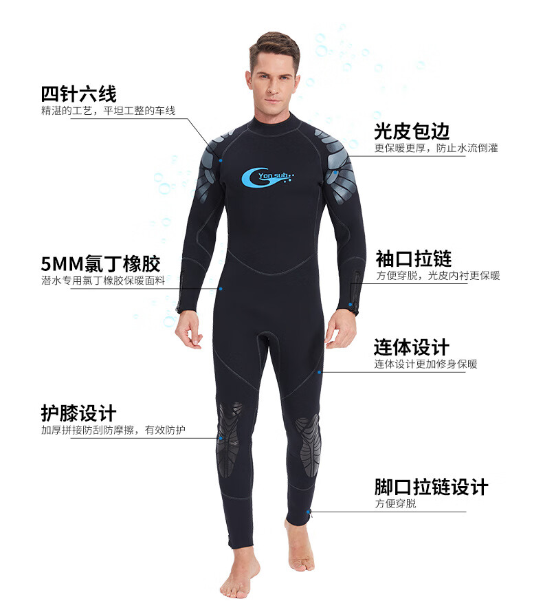 Yonsub5mm adult wetsuit one-piece long-sleeved men's sun protection quick-drying new black windbreaker swimsuit thickened black S