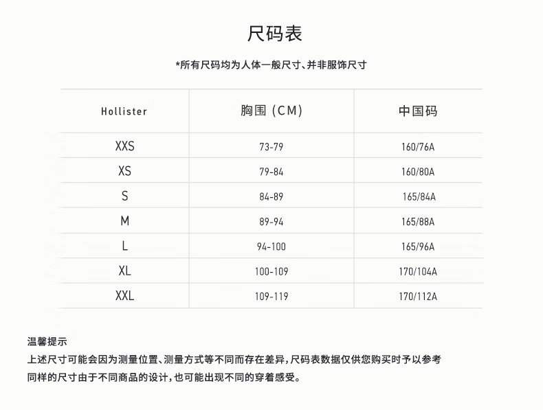 China (cm) 160-165/84-86 165-170 / 88-90 167-172 / 92-96 168-173 / 98-102 170-176 / 106-110