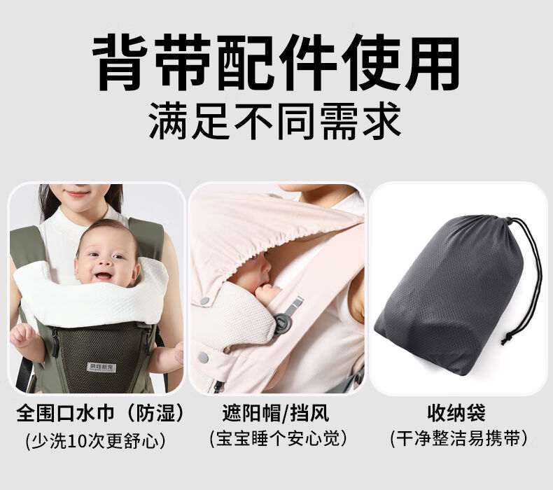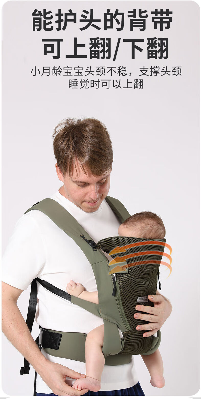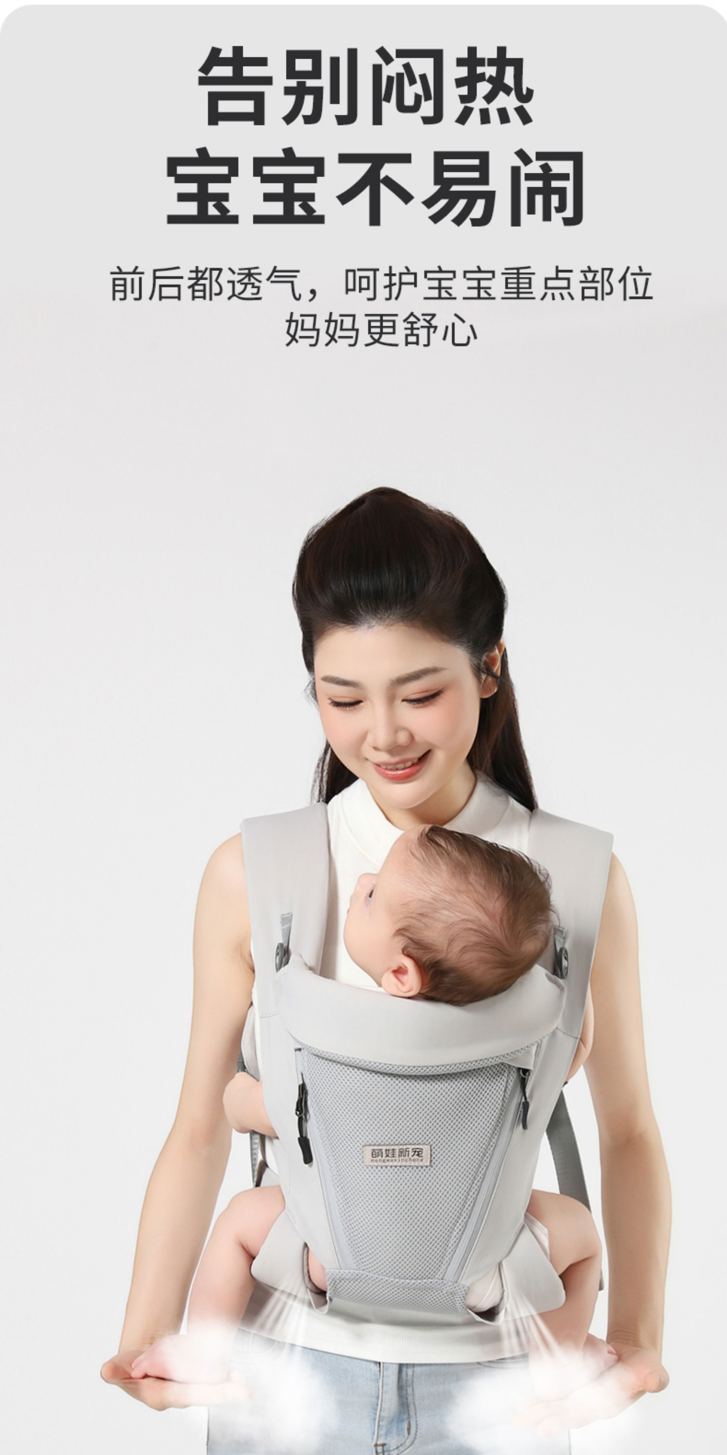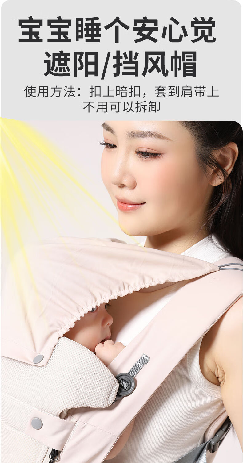 Baby carrier for small months old baby, front and back, dual-use for carrying baby out and back, freeing hands, gray belt, windproof hood + storage bag
