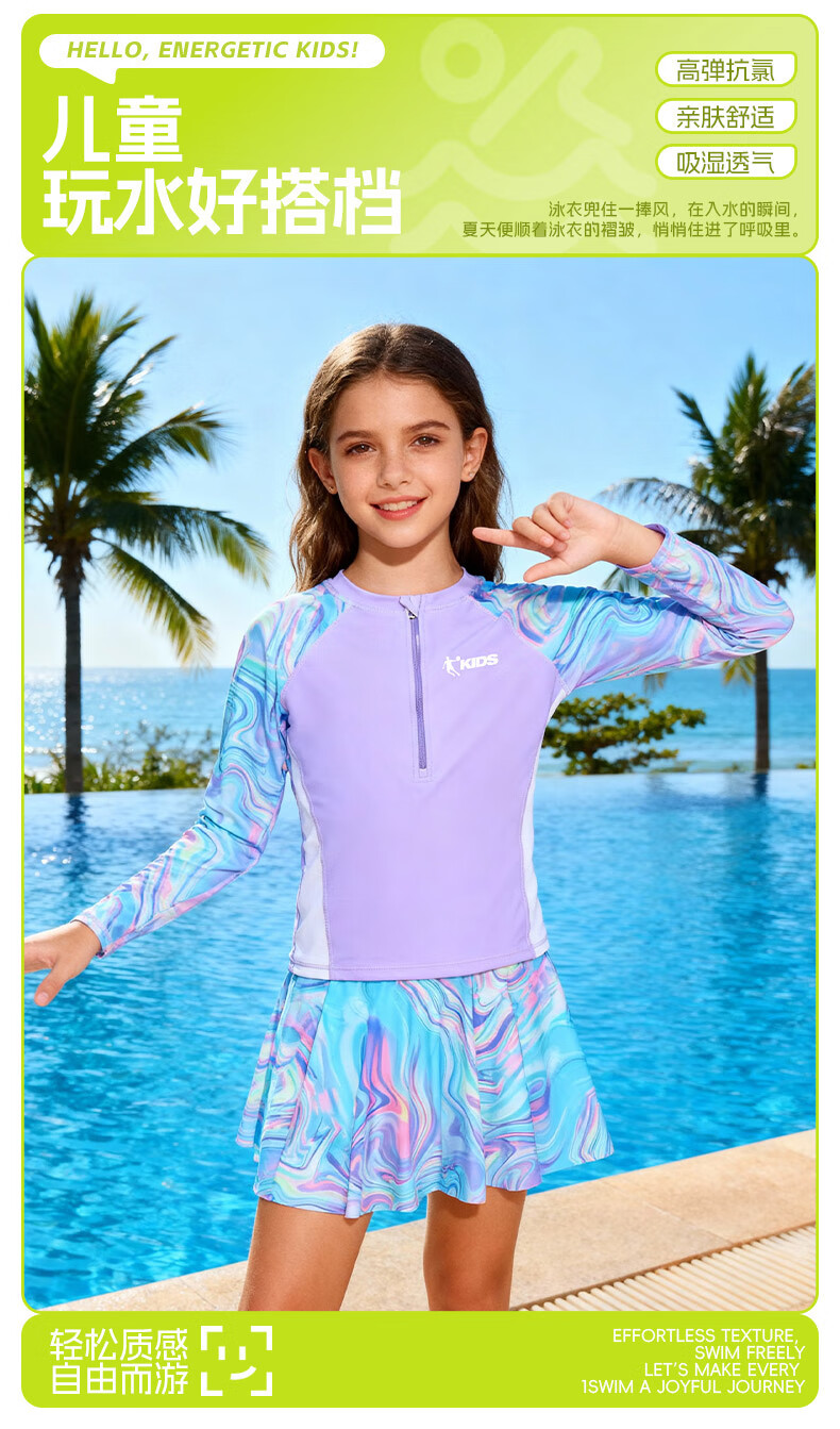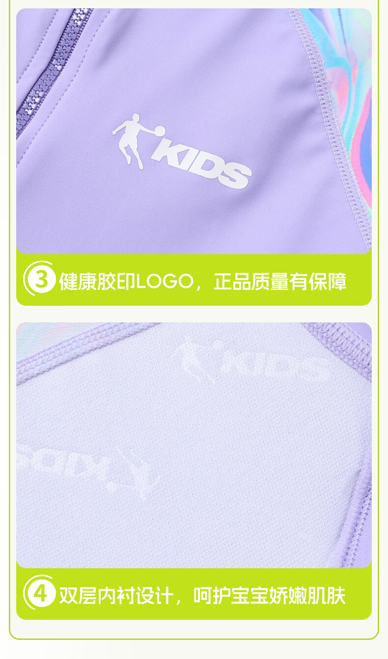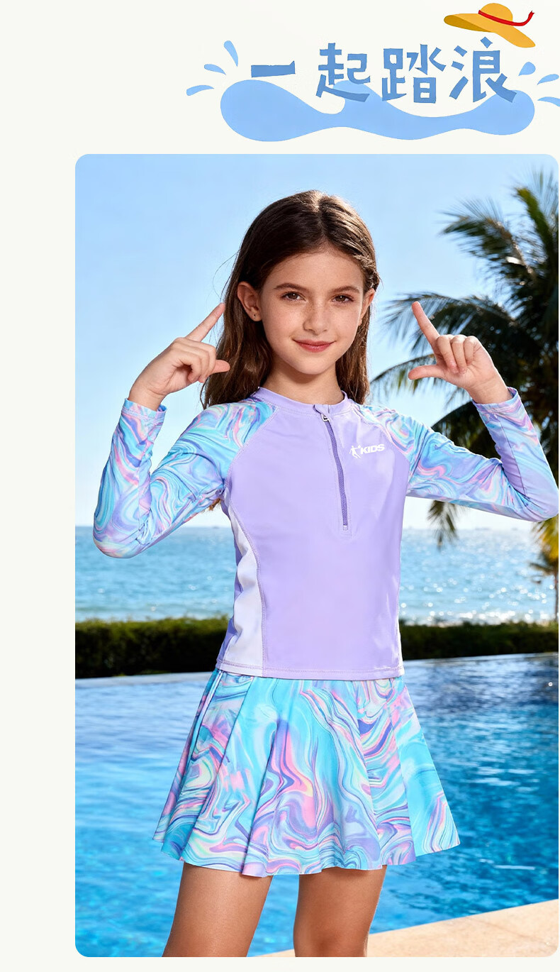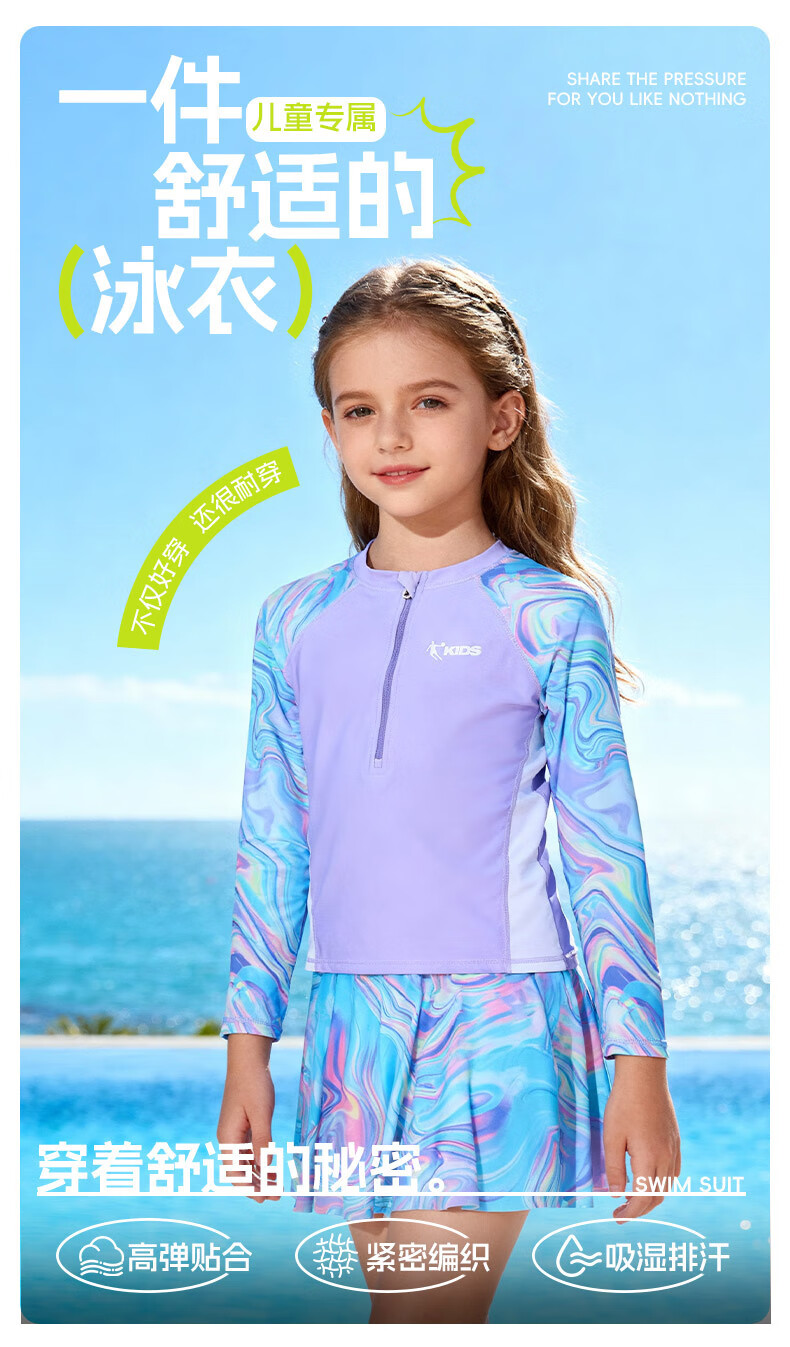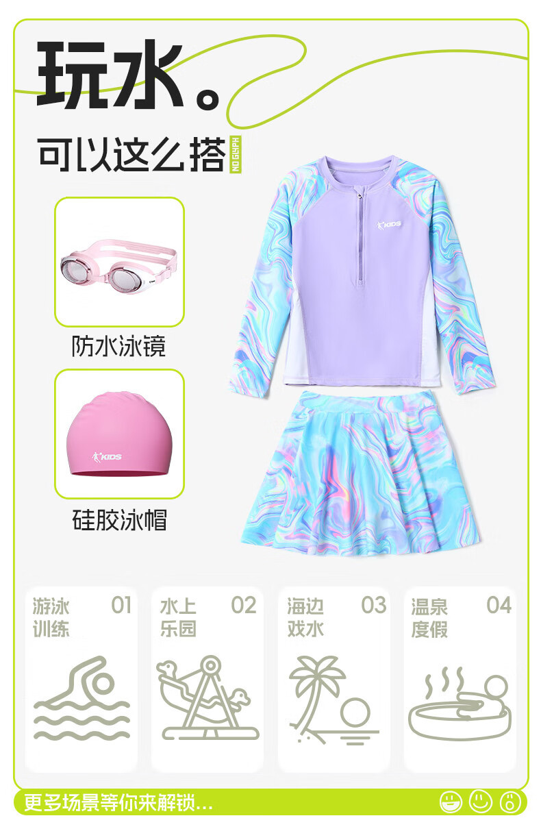 Jordan (QIAODAN) children's split skirt swimsuit girls long-sleeved sun protection swimsuit professional training hot spring printed quick-drying swimsuit purple 130 height 105-115CM weight 30-40Jin Jin equals 0.5 kg
