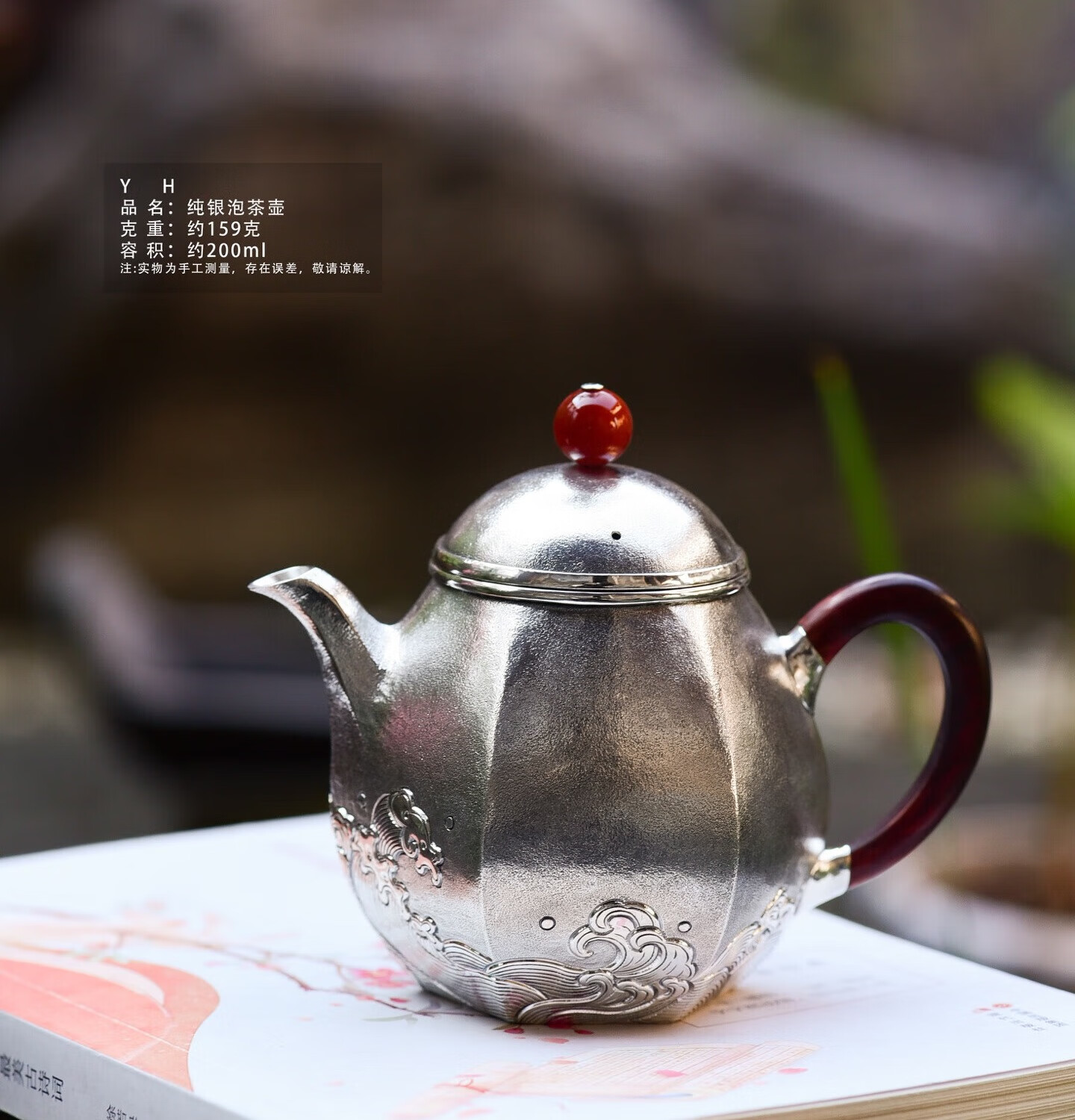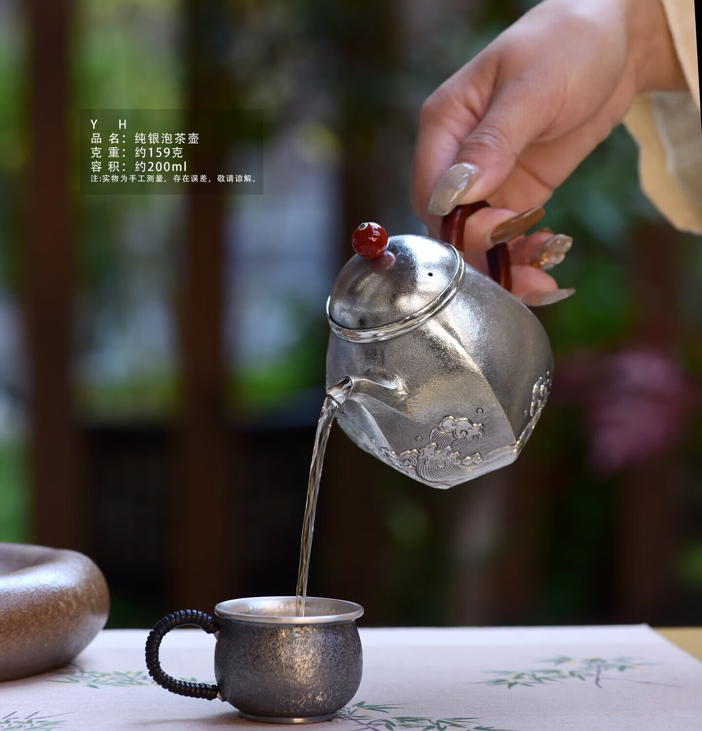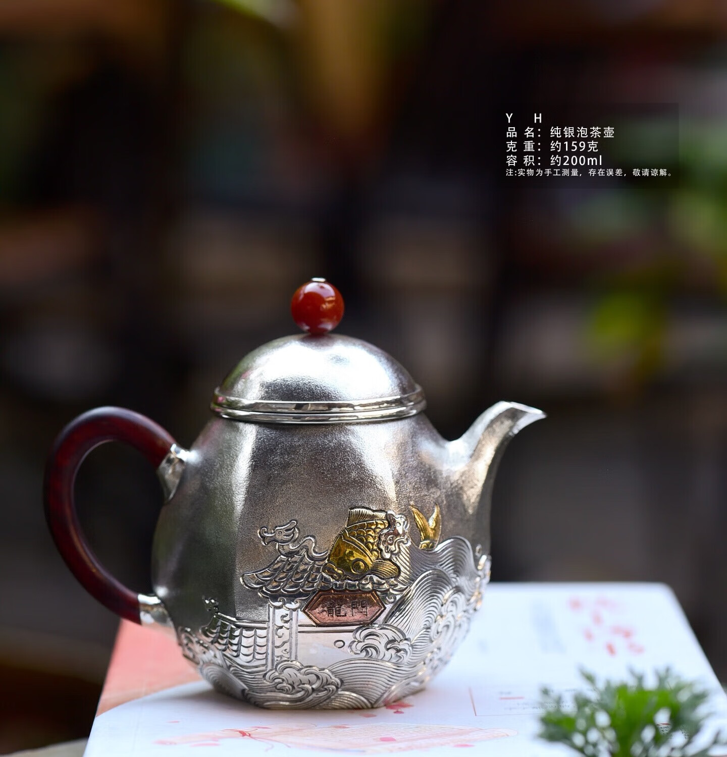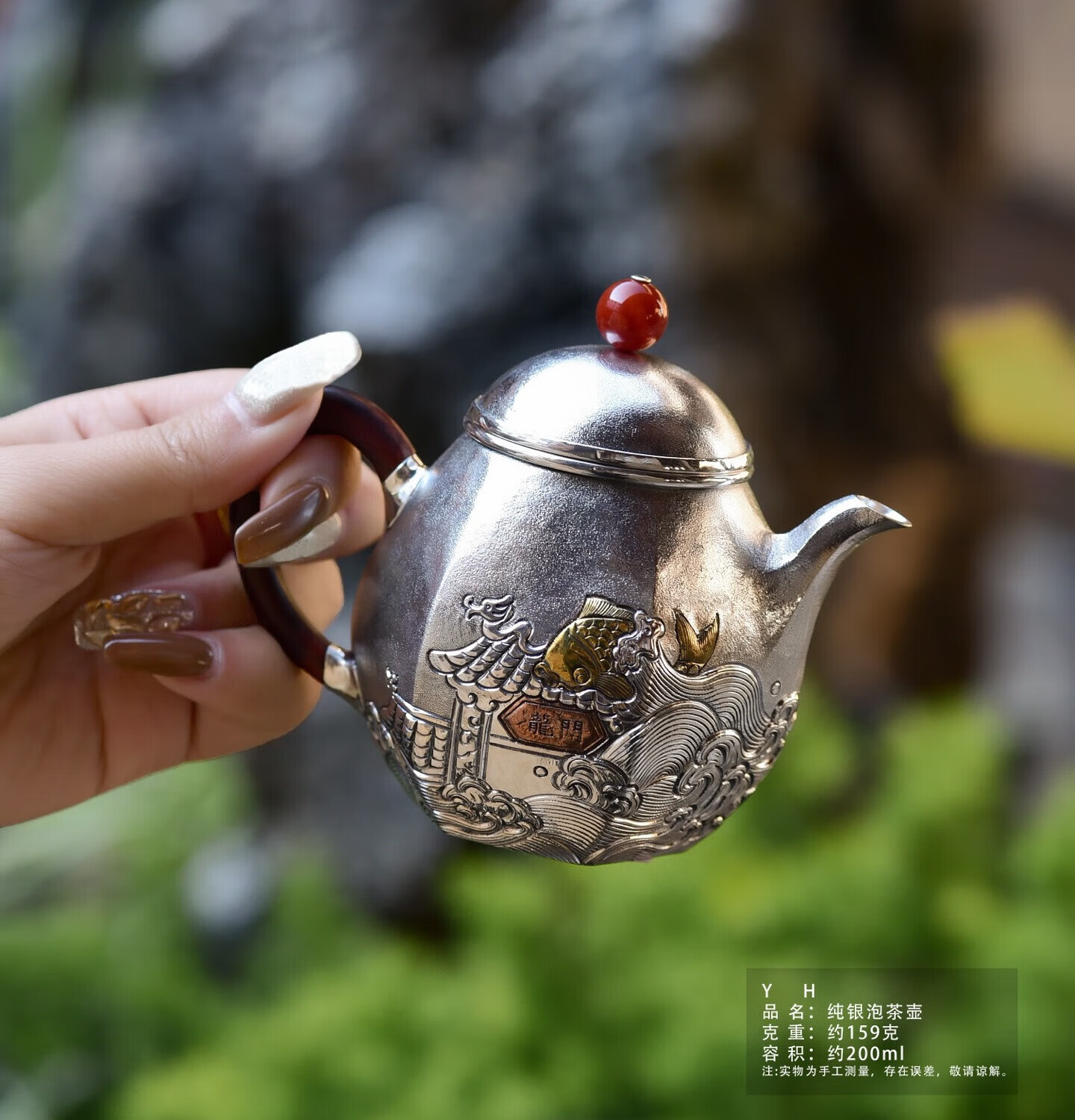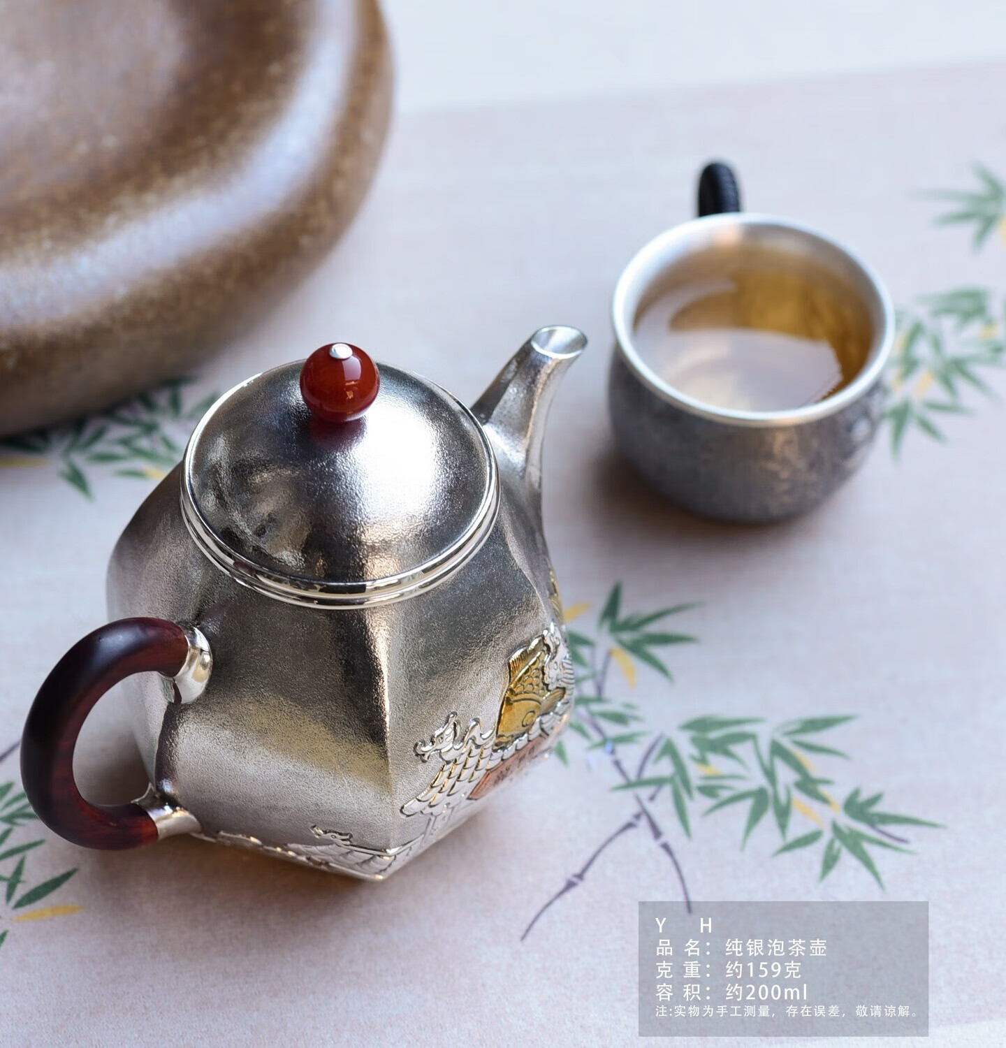 Yuyue Longmen teapot pure silver 999 sterling silver teapot hand-embossed Kung Fu tea set Dali snowflake silver