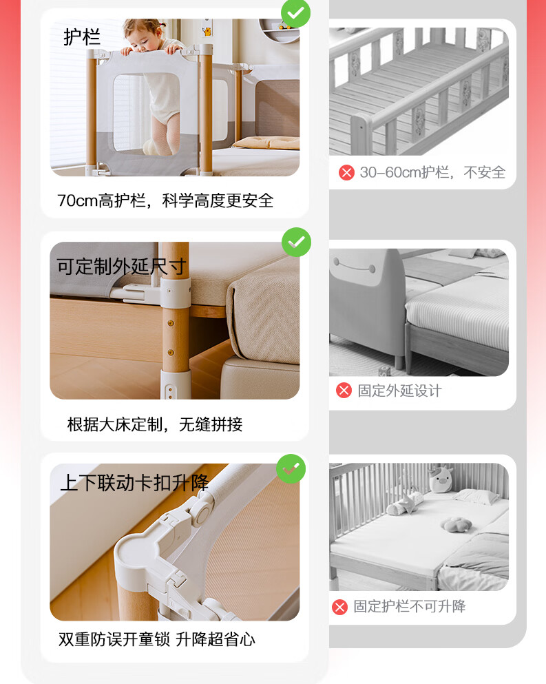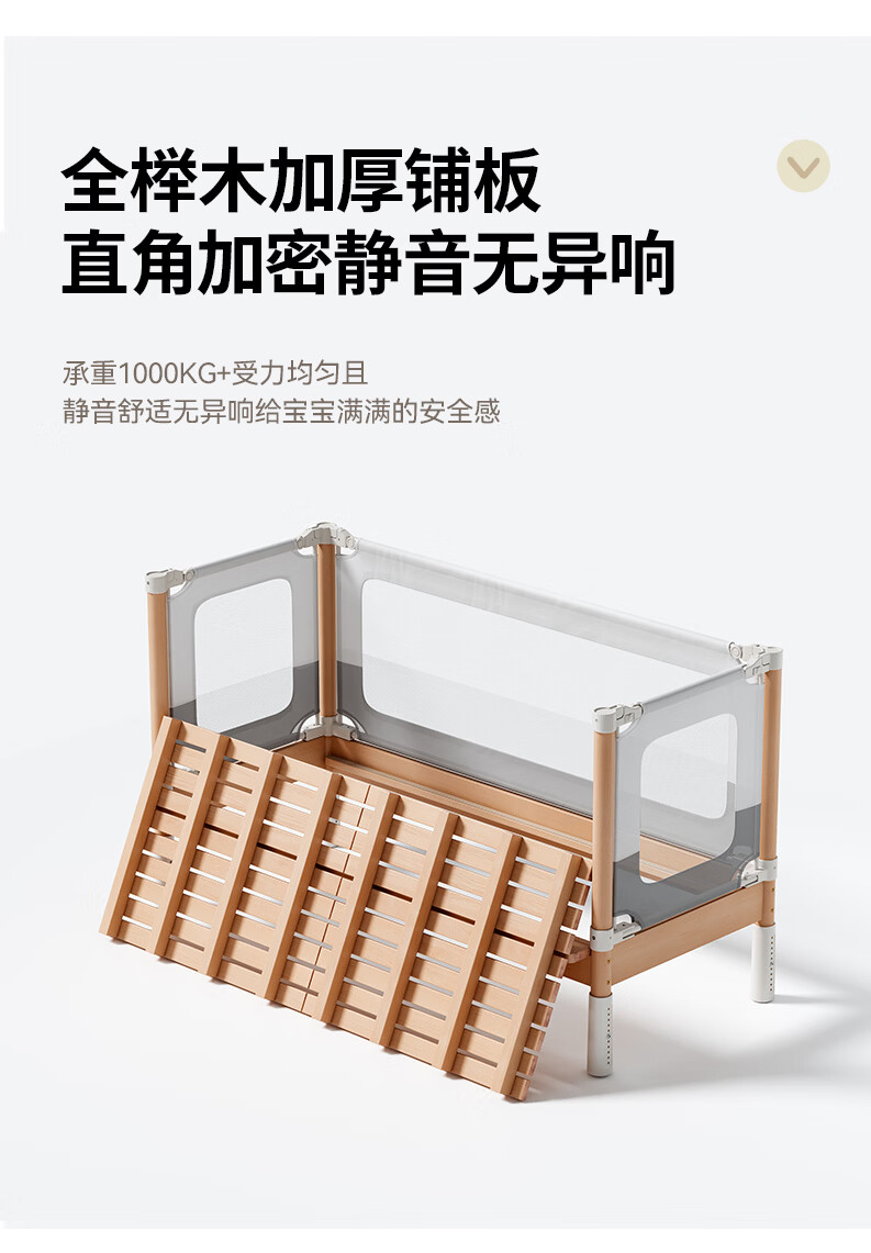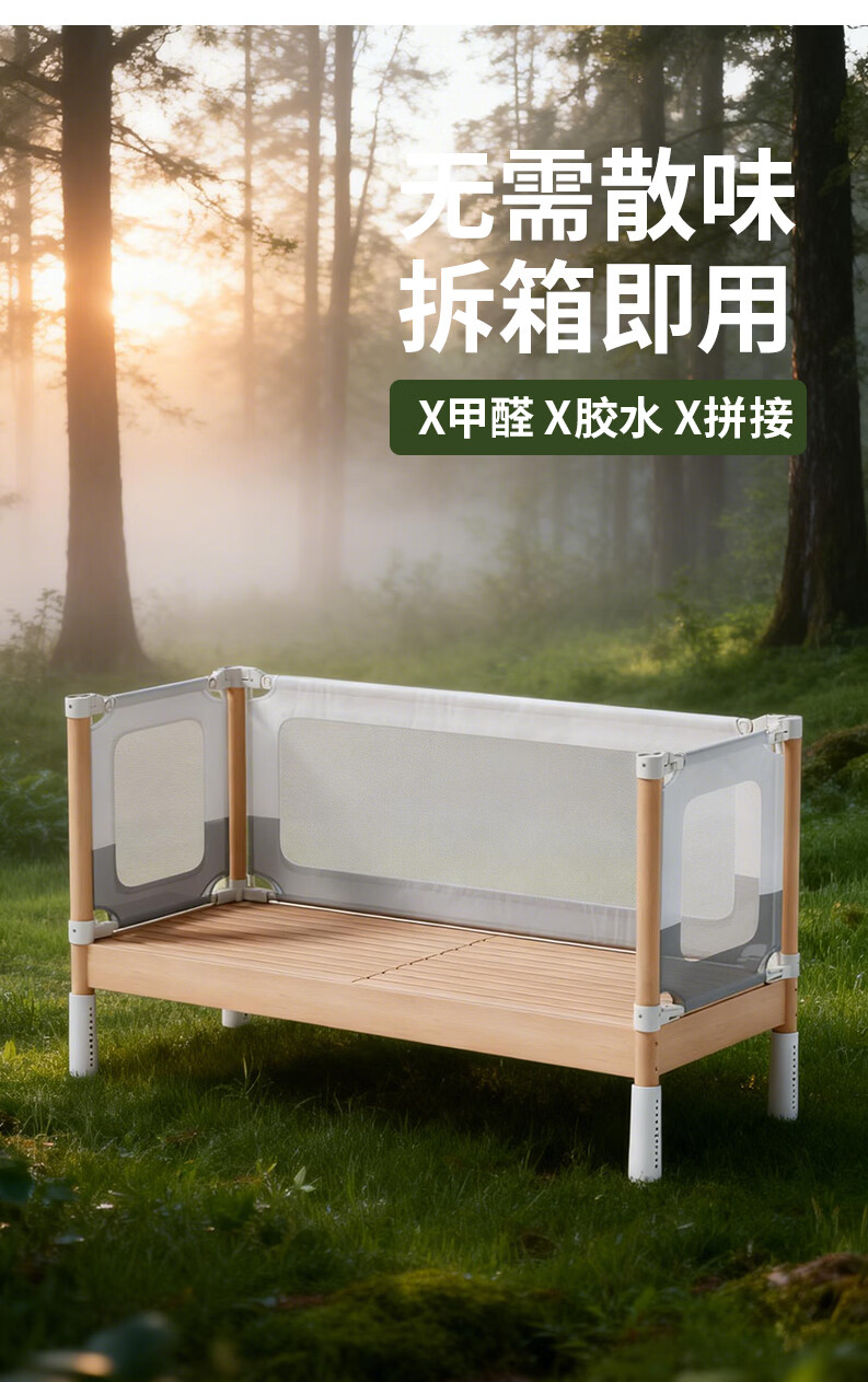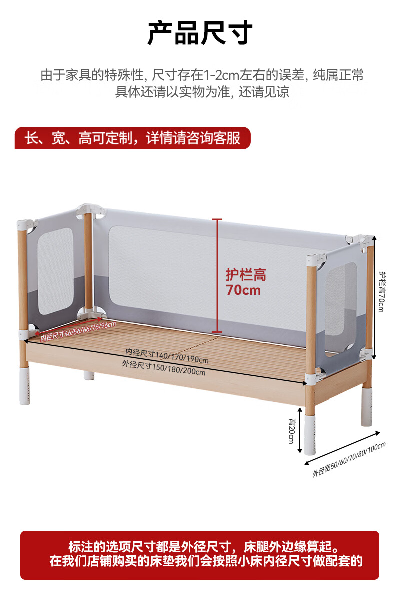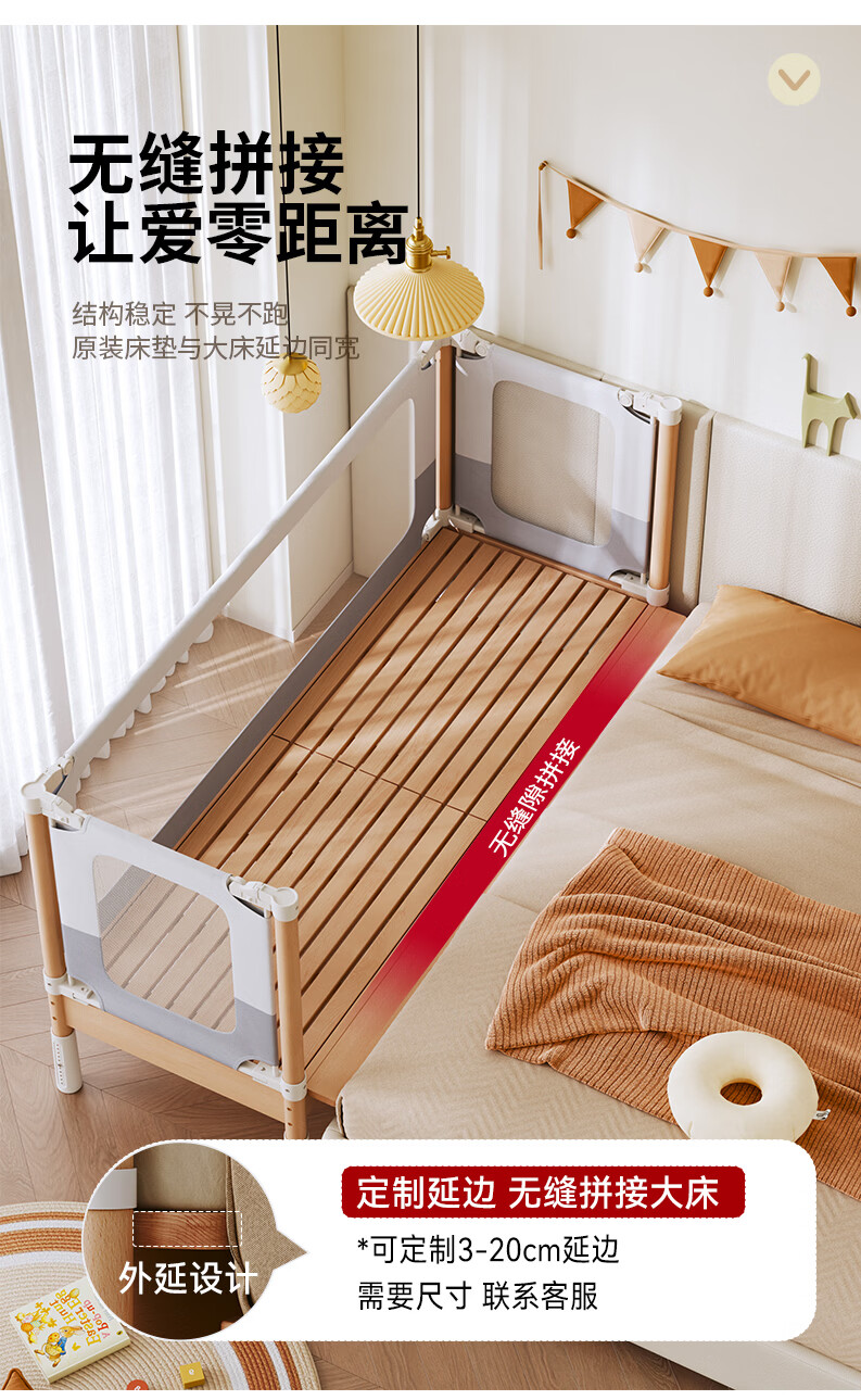 BARTOMOON beech spliced bed crib solid wood children's bed widened children's bedside bed heightened guardrails can be lifted and removed and washed Single bed (three-sided guardrails) + 6cm removable and washable coconut palm mattress 200*60CM three-sided guardrails can be lifted and removed and washed All beech