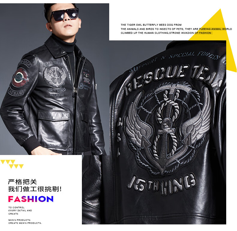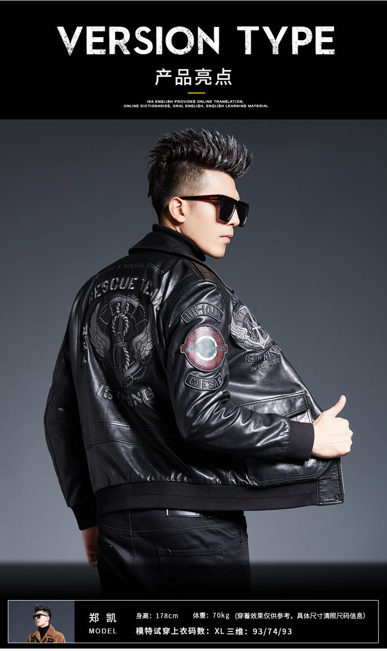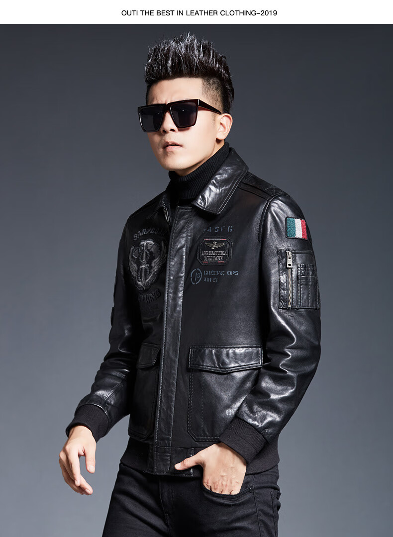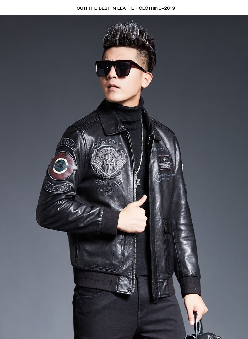 ARMANI EXCHANGE Armani 2025 new sheep leather jacket men's motorcycle jacket lapel B6 air force flight embroidered leather jacket spring and autumn black silk cotton + lamb fur collar L 110-125Jin Jin equals 0.5 kg
