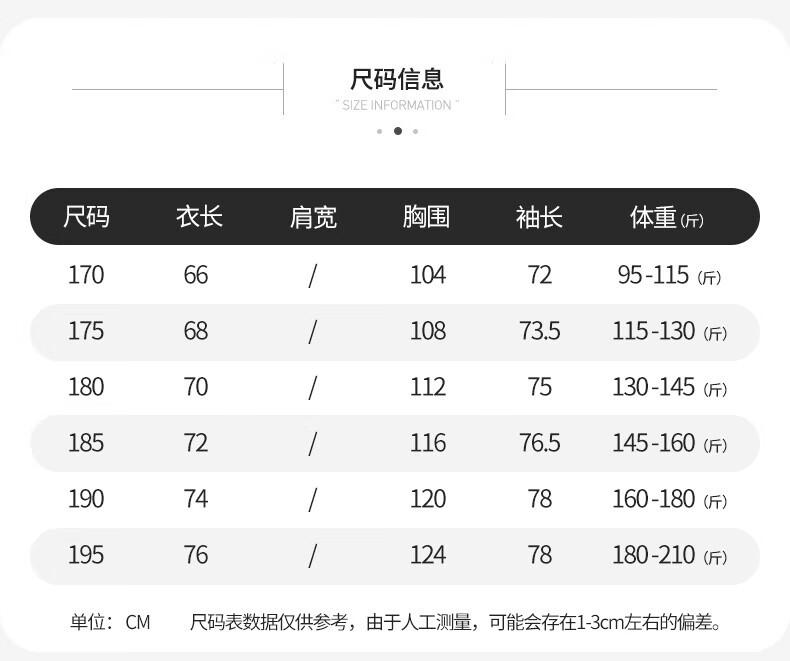 China (cm) 165 / 88-90 170 / 96-98 175 / 108-110 180 / 118-122 185 / 126-130