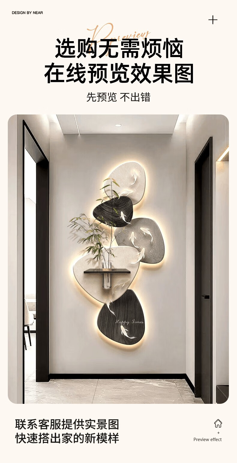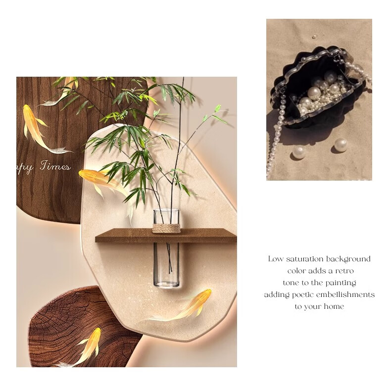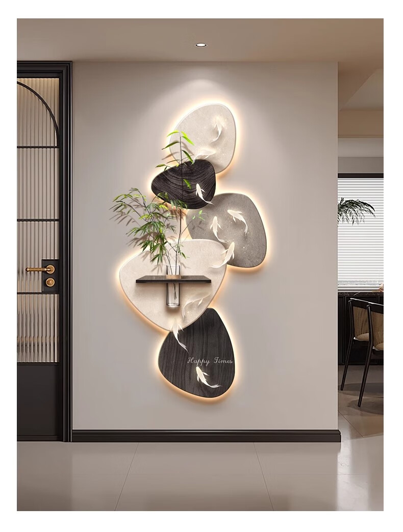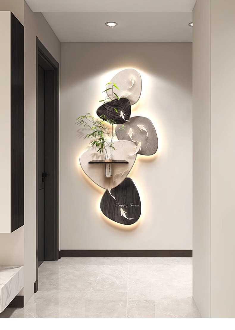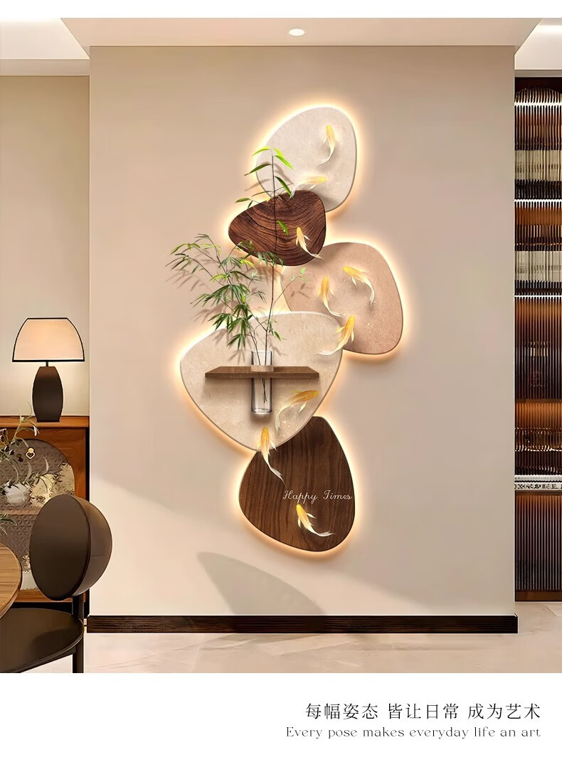 Kezhi Nine Fish Picture facing the entrance door, entrance wall decorative painting mural, 2025 new high-end living room corridor hanging painting A-Koi Yuefu 80*160+shelf 41*12, handmade sandstone+shelf+hemp rope+hydroponic vase+simulated green plants, ordinary model, non-luminous