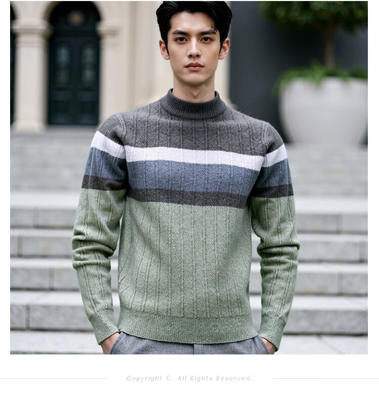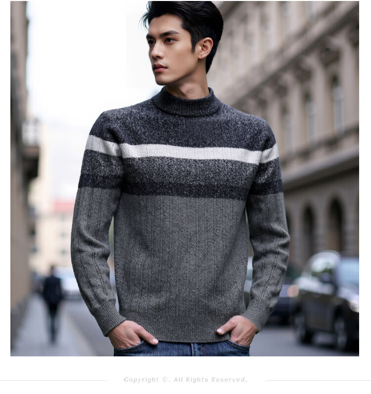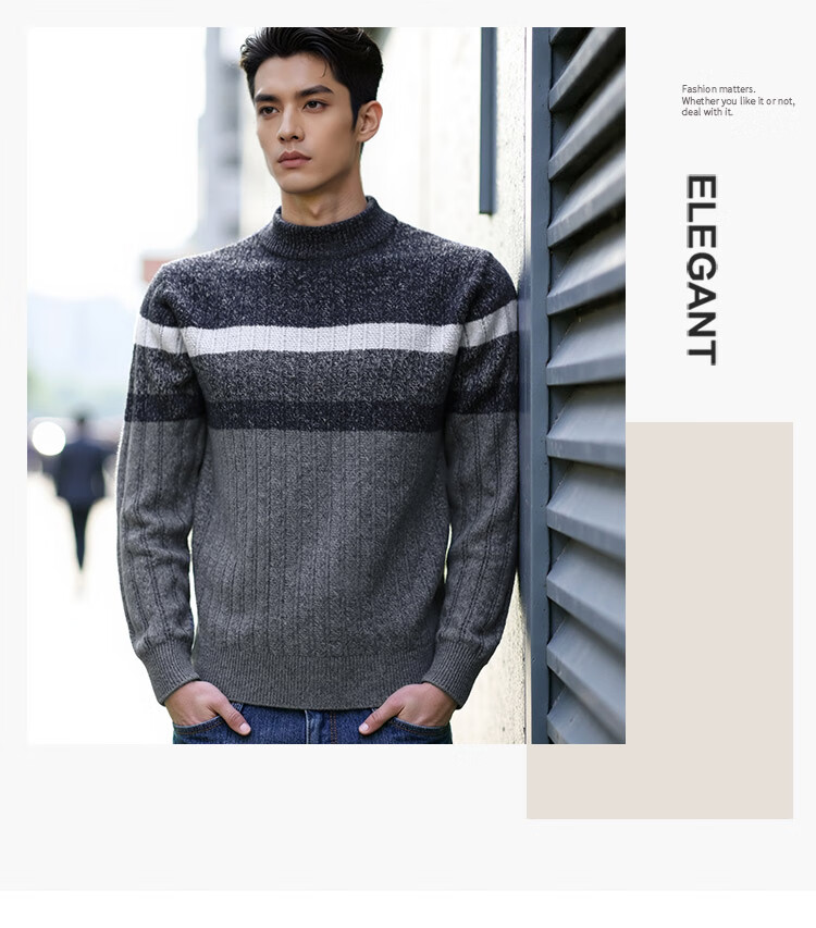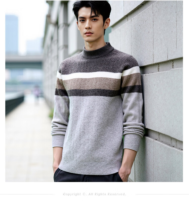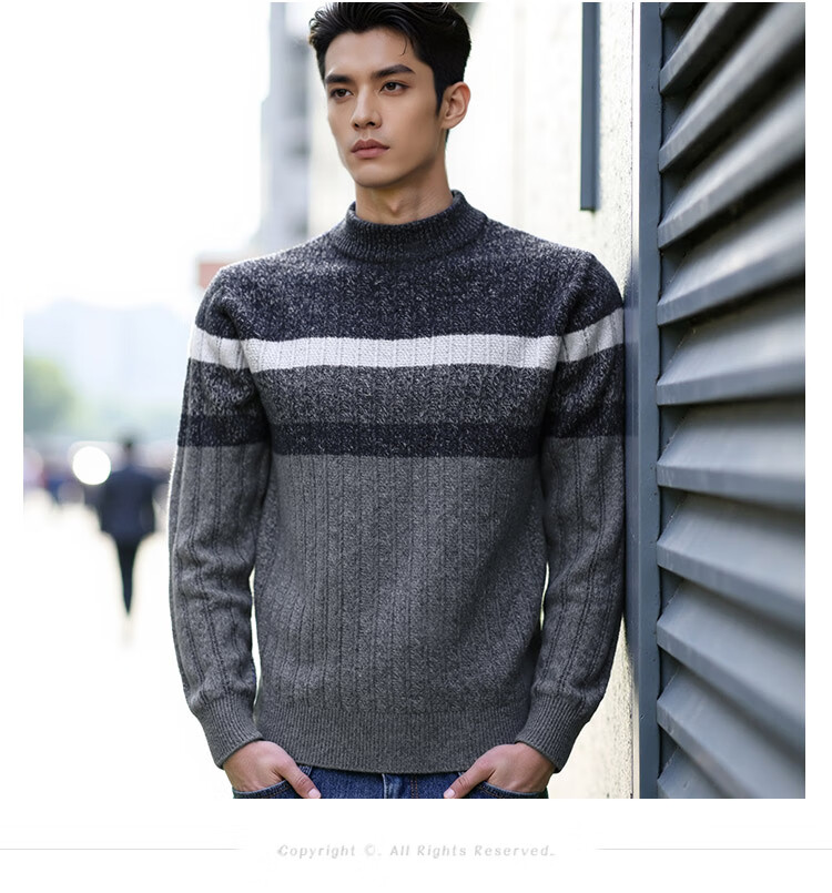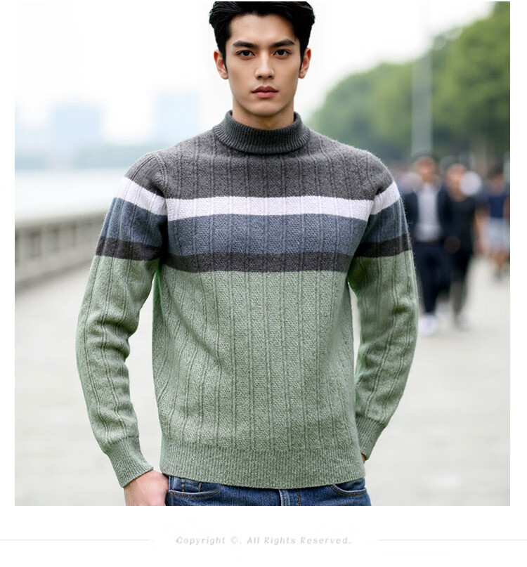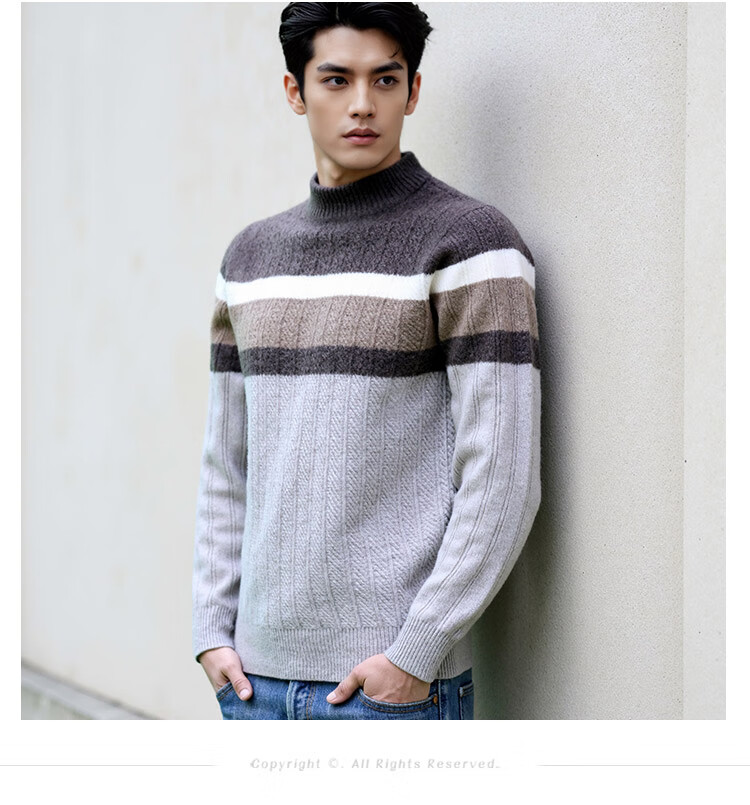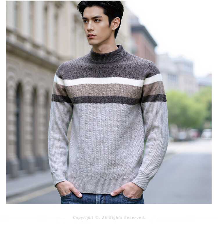 Hengyuanxiang 100% pure wool sweater winter warm thickened men's sweater 2025 new style striped 100% pure wool bottoming sweater trendy beige M 105