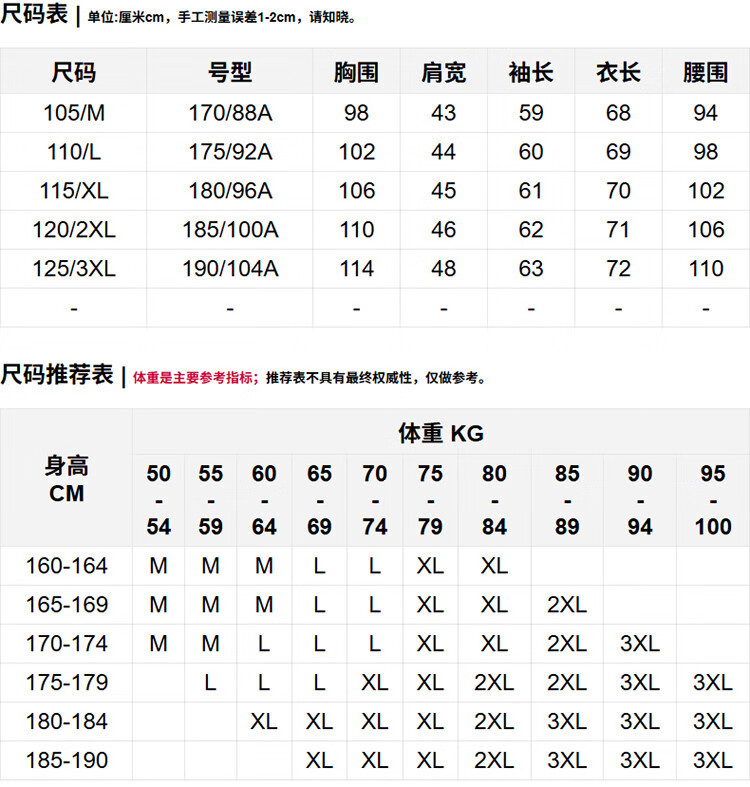 China (cm) 165 / 88-90 170 / 96-98 175 / 108-110 180 / 118-122 185 / 126-130