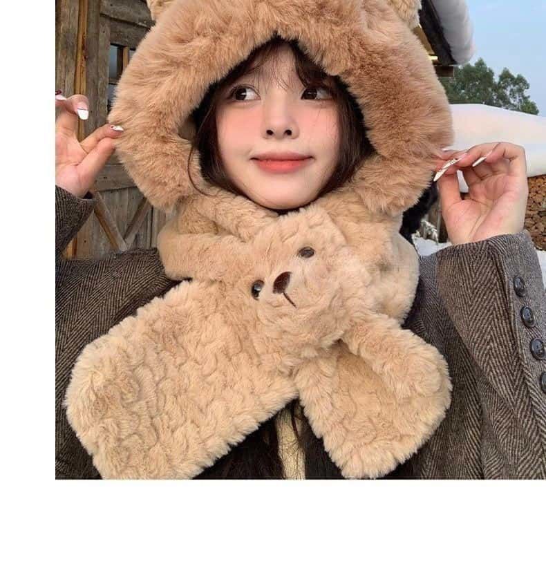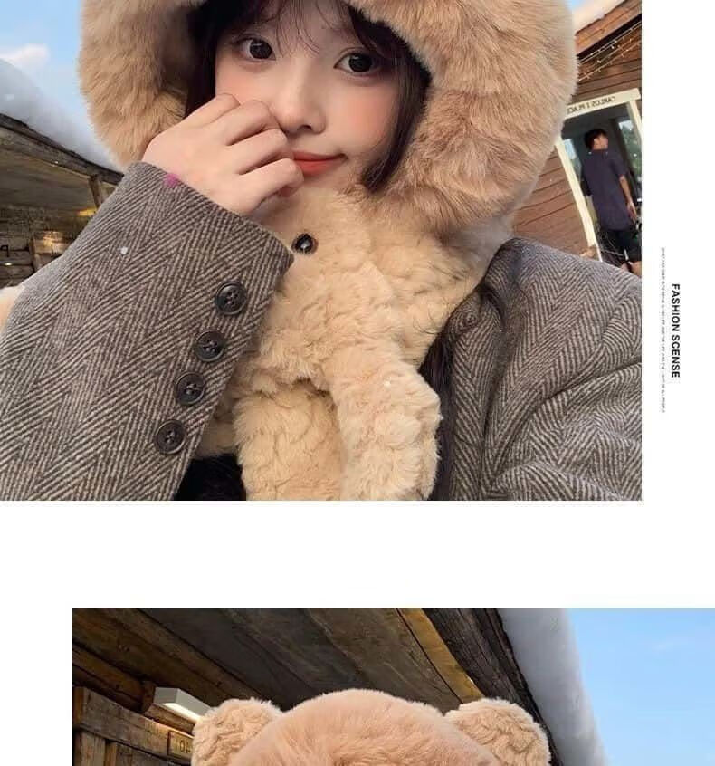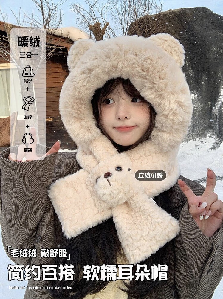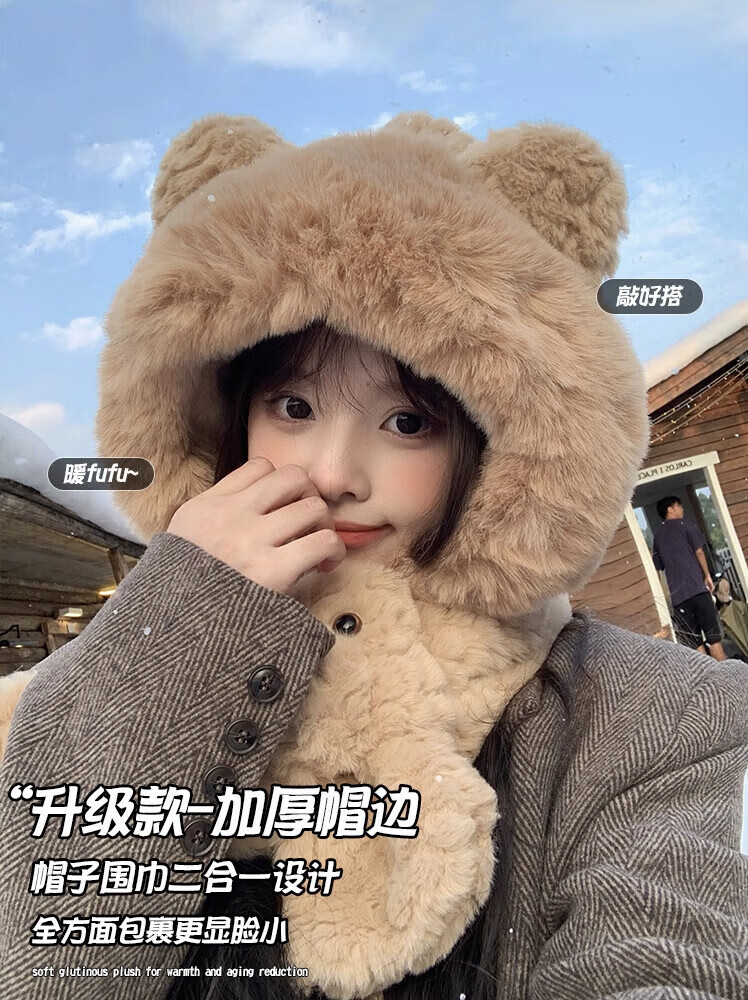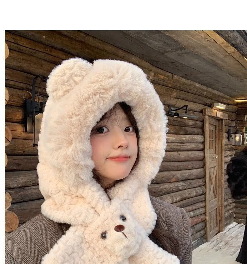Luge Li Bear Ears Hat Scarf All-in-one Women's Winter Warmth Versatile Windproof Plus Velvet Thickened Plush Scarf Lei Feng Hat Bear Scarf Hat Beige