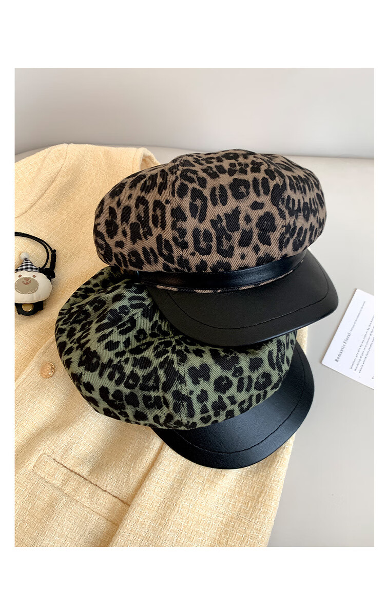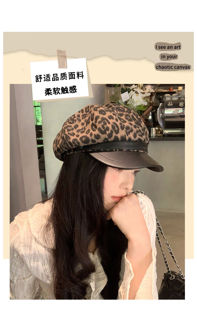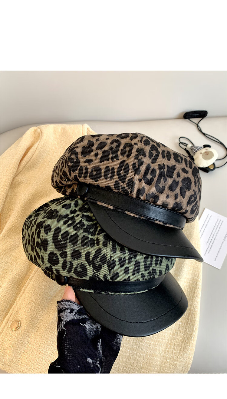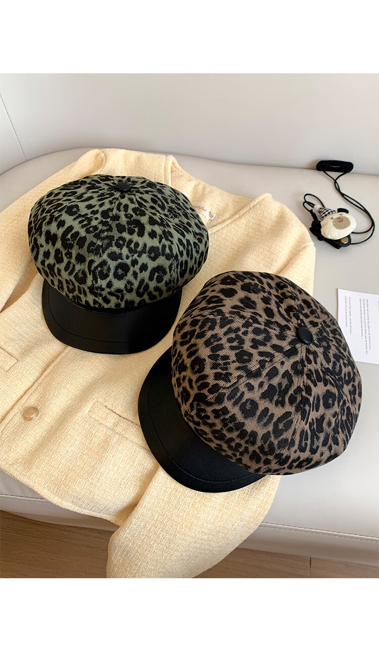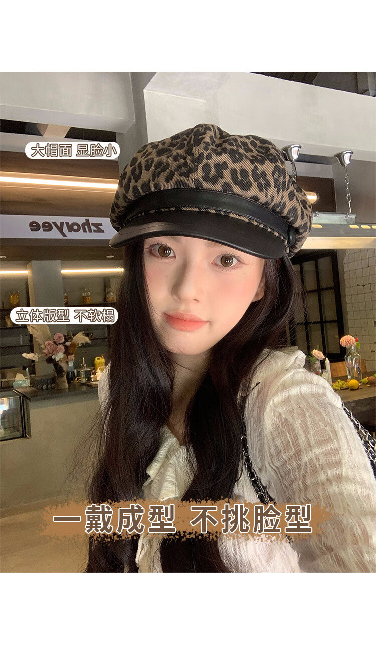 2025 New Retro Leopard Print Beret Girls Autumn Millennial Niche Octagonal Hat Big Head Circumference Showing Face Hat Fashion Brown Leopard Print