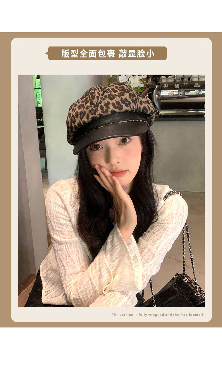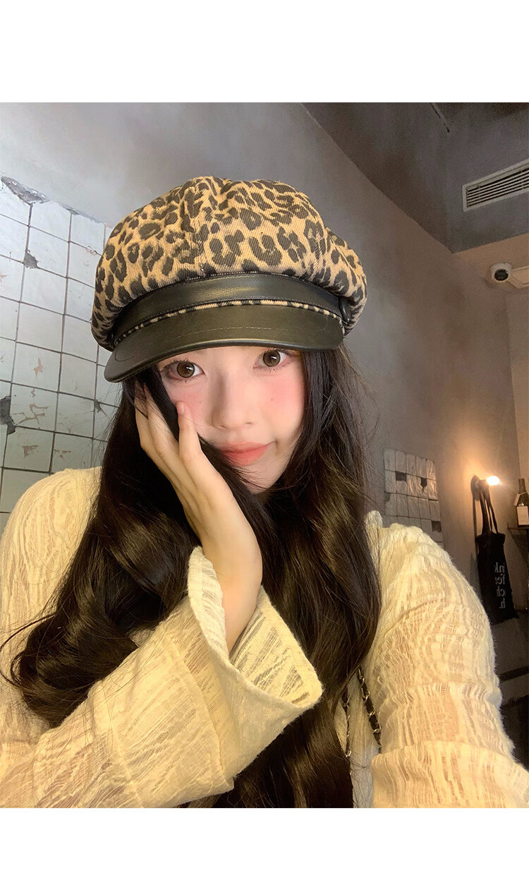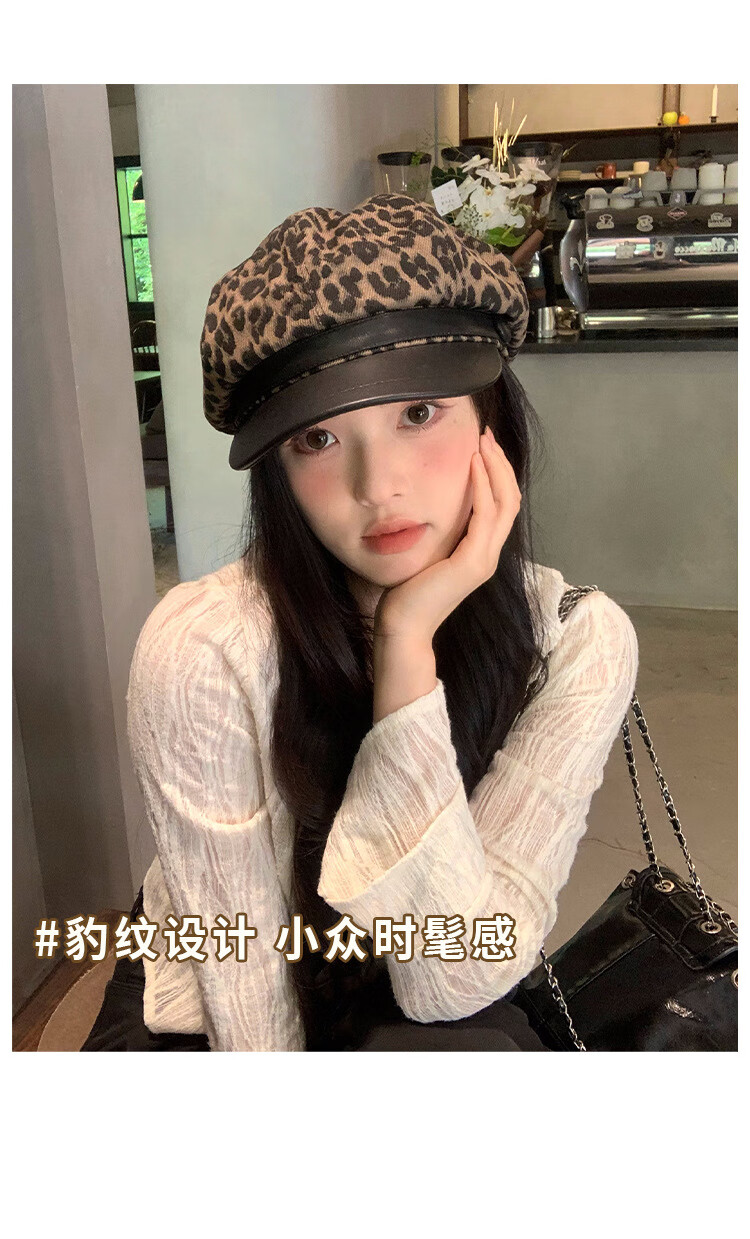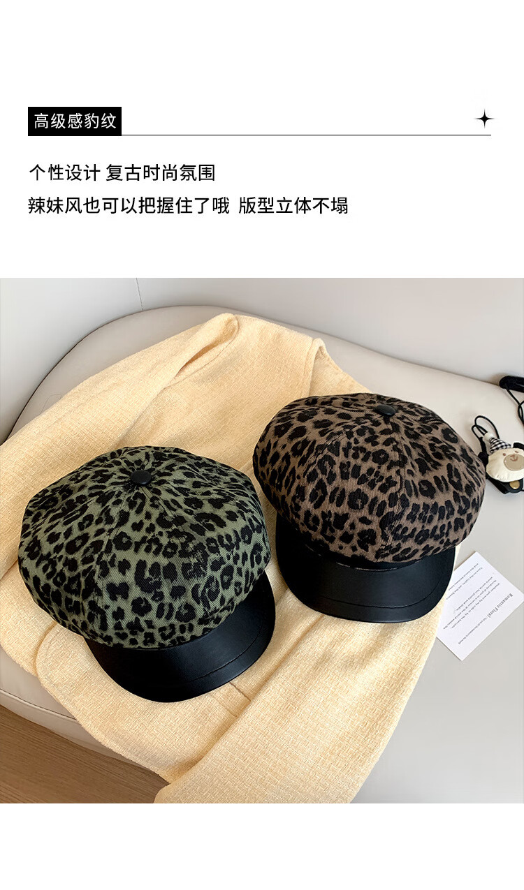 2025 New Retro Leopard Print Beret Girls Autumn Millennial Niche Octagonal Hat Big Head Circumference Showing Face Hat Fashion Brown Leopard Print