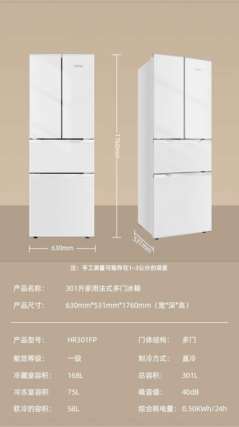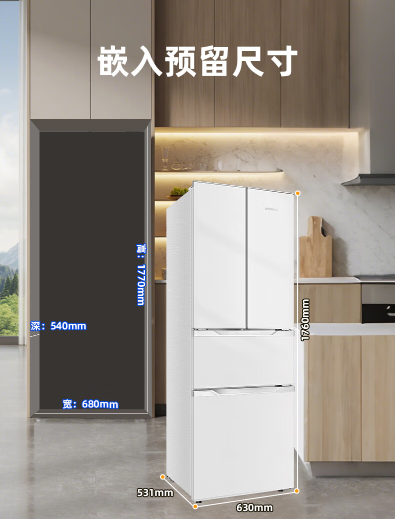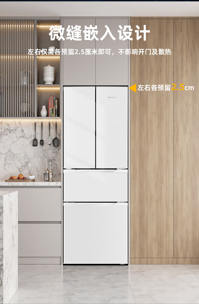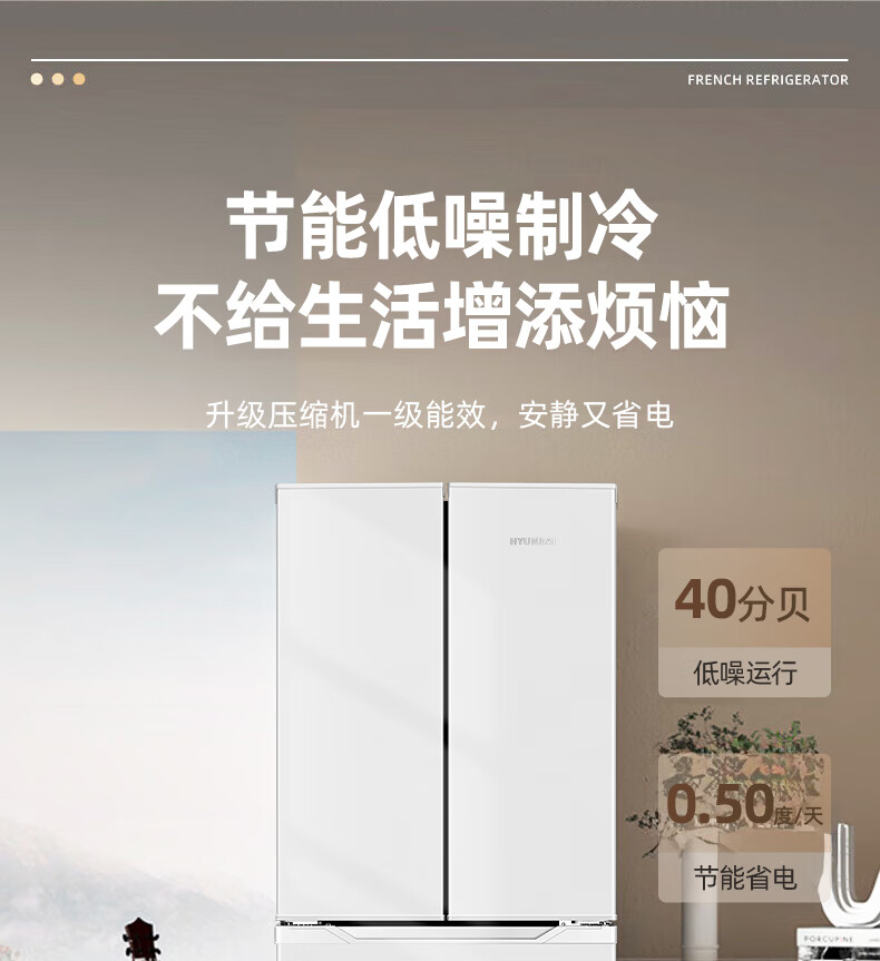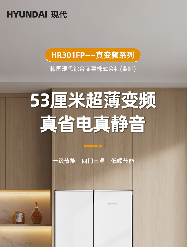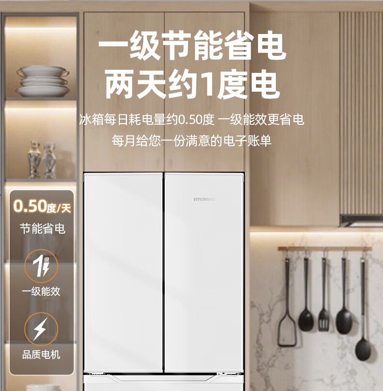 HYUNDAI Korean modern refrigerator large capacity first-class energy efficiency home frequency conversion power-saving white French cross four-door silent low-noise energy-saving ultra-thin embedded air-cooled frost-free 301L French white first-class frequency conversion 53 cm ultra-thin embedded