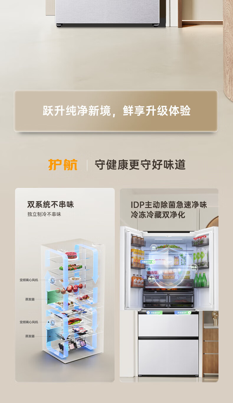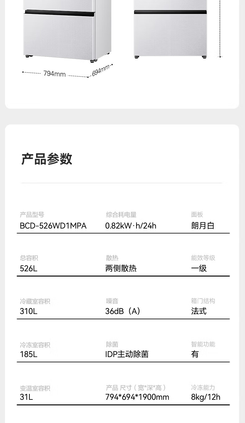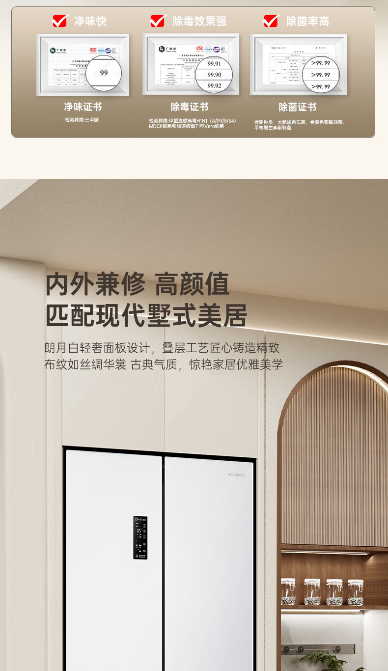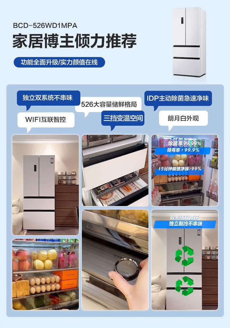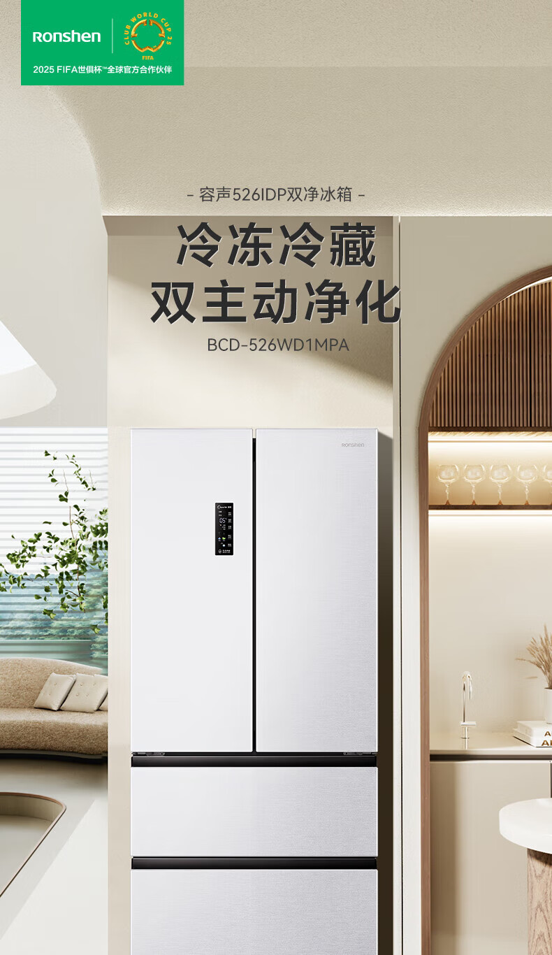 Rongsheng Refrigerator 526 liters dual-clean dual-system French multi-door four-door refrigerator household first-class energy efficiency air-cooled frost-free energy-saving large capacity BCD-526WD1MPA white dual system no odor + IDP active sterilization + air-cooled frost-free