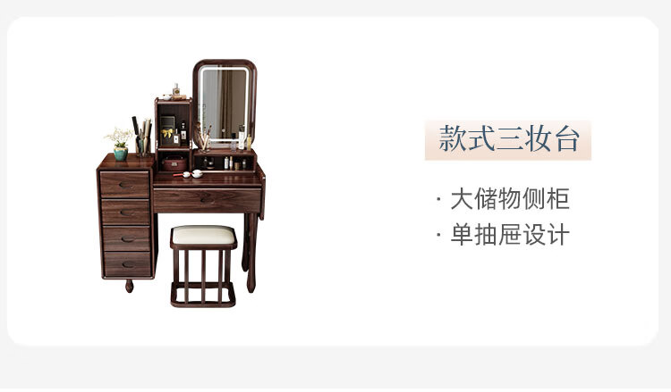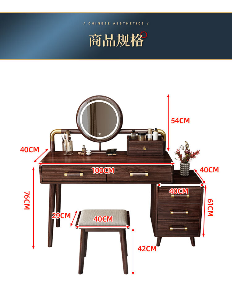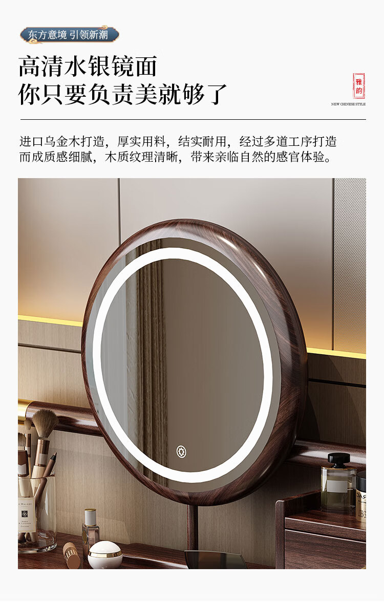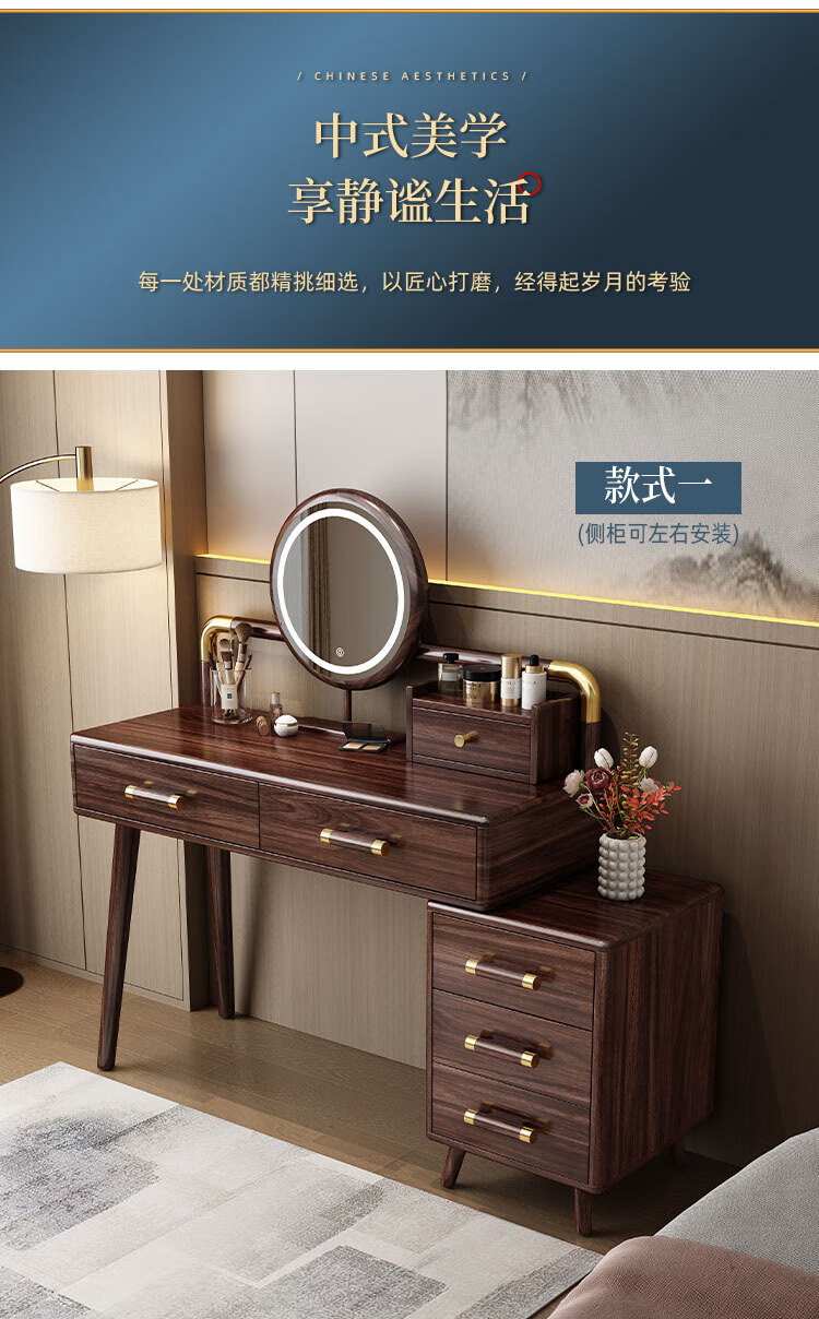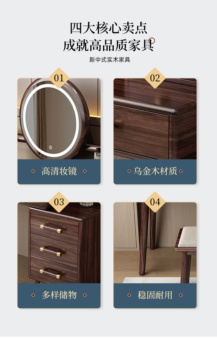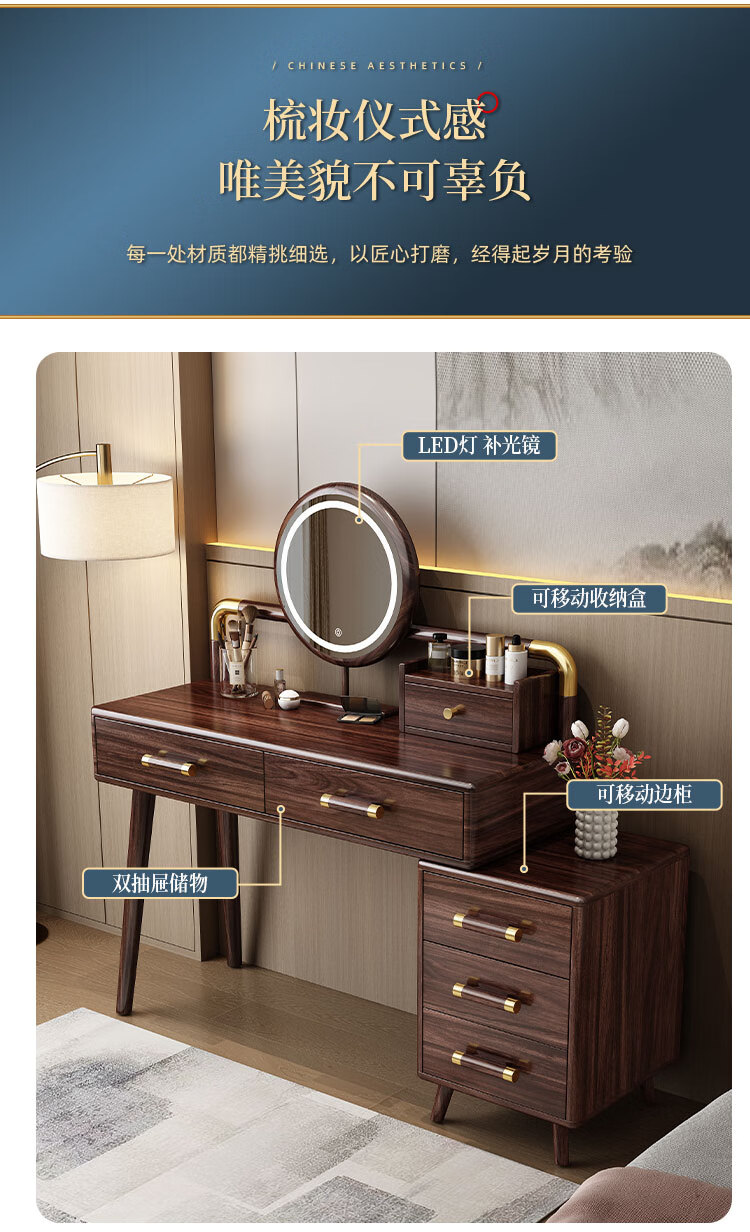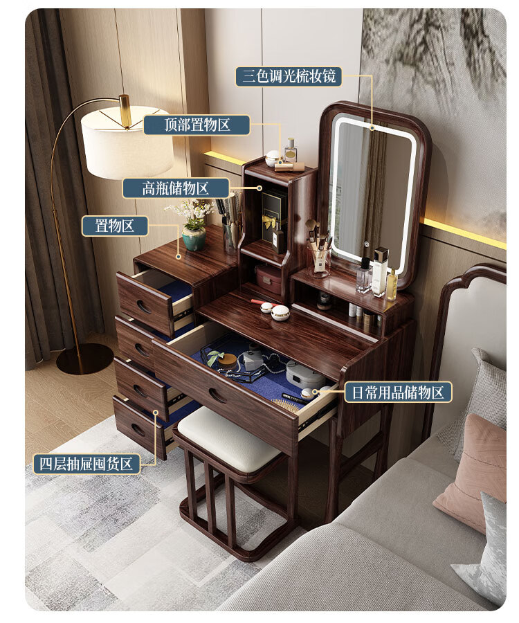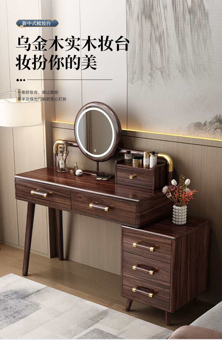 MIKEMIJIA Gujia New Chinese Dressing Bedroom Black Gold Wood Dressing Table Complete with Mirror Cabinet Storage Dressing Table 310# Dressing Table + Makeup Mirror + Makeup Stool + Storage Box Semi-Assembled (Just Install the Feet and Mirror Frame) x Black Gold Wood