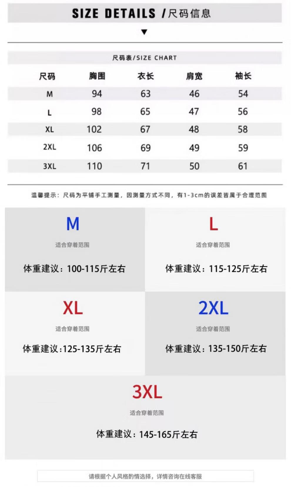 China (cm) 165 / 88-90 170 / 96-98 175 / 108-110 180 / 118-122 185 / 126-130