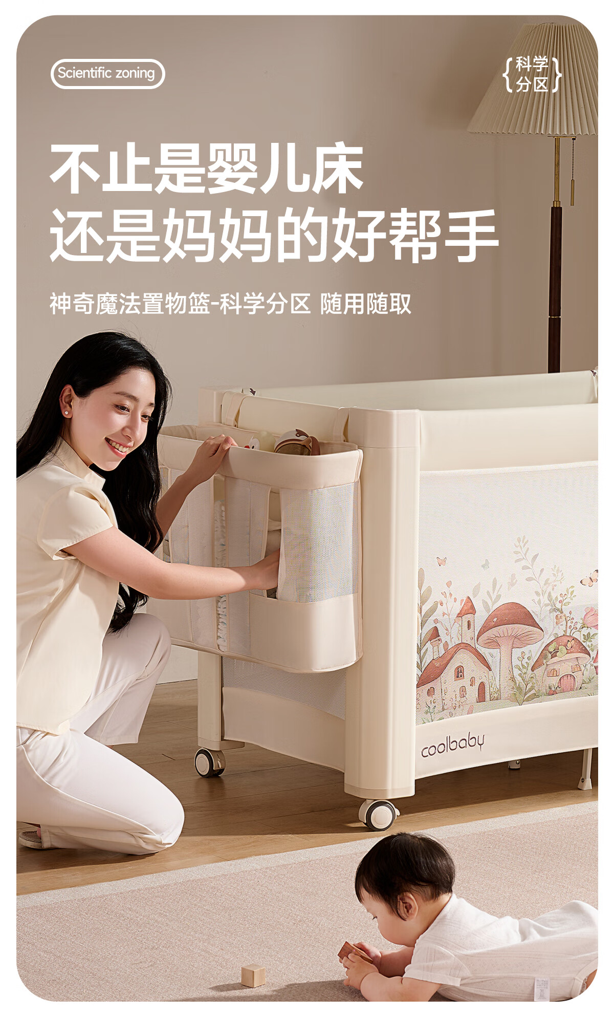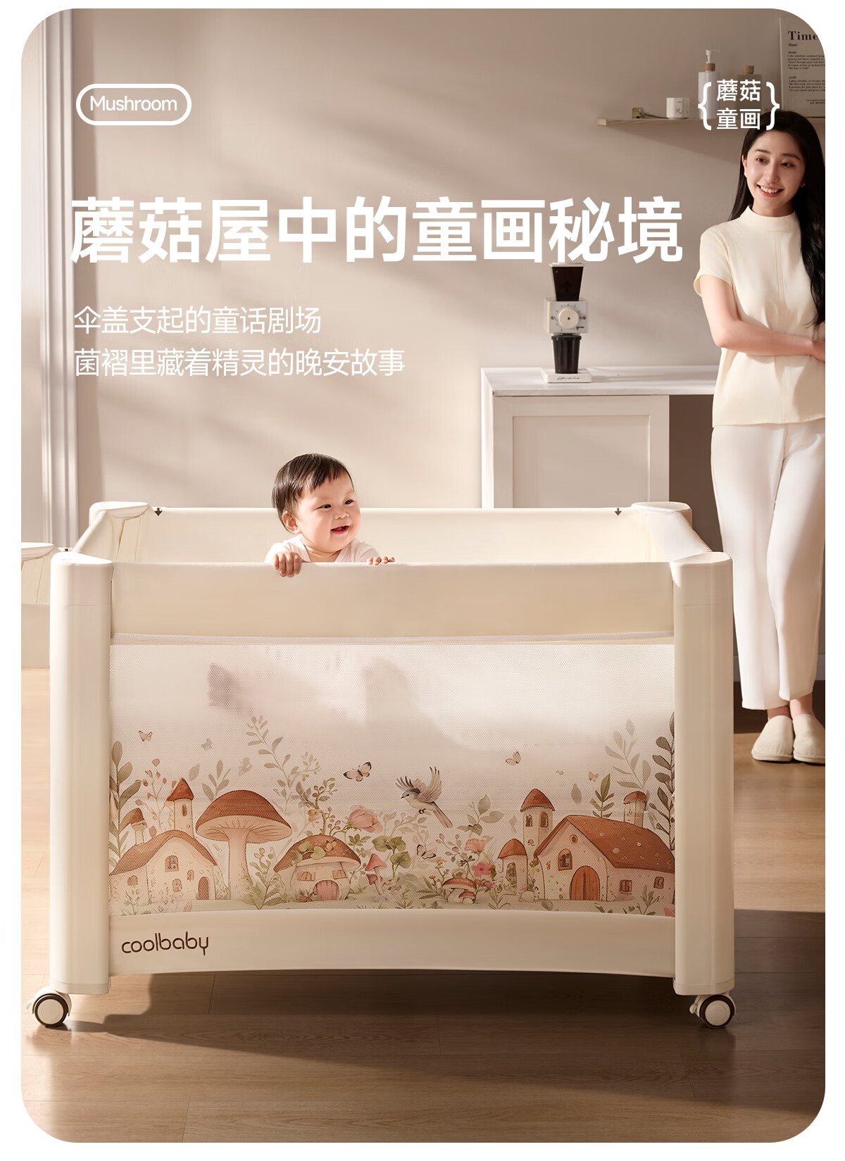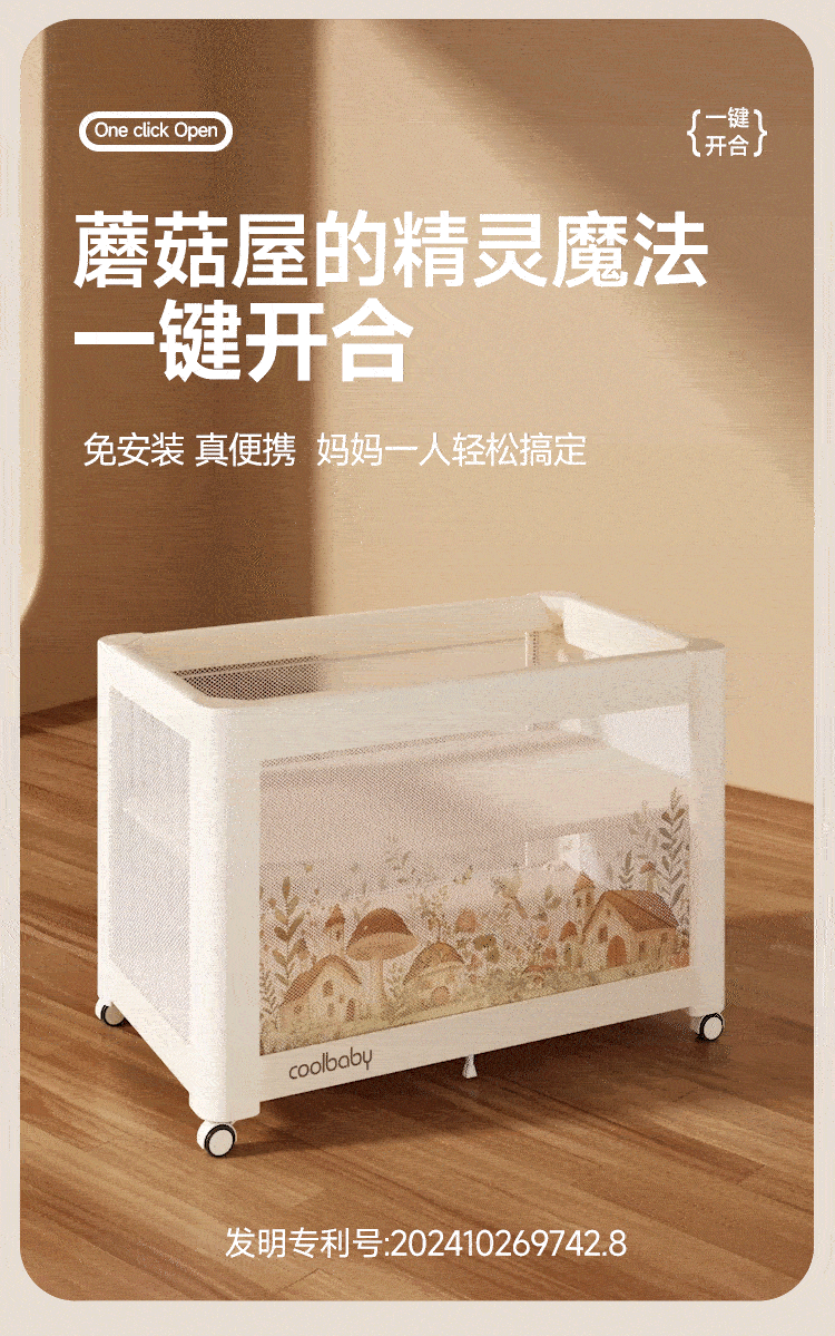 Coolbaby Mushroom House crib foldable newborn baby bed one-click opening and closing seamless splicing bed suitable for large bed lift Mushroom House