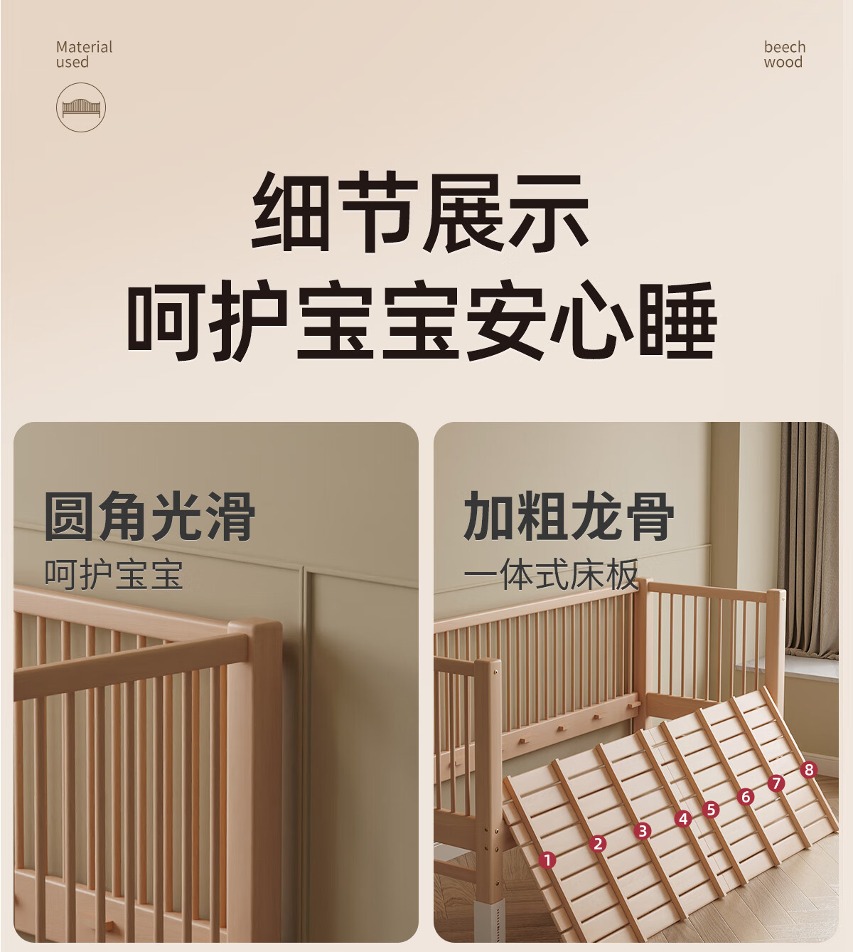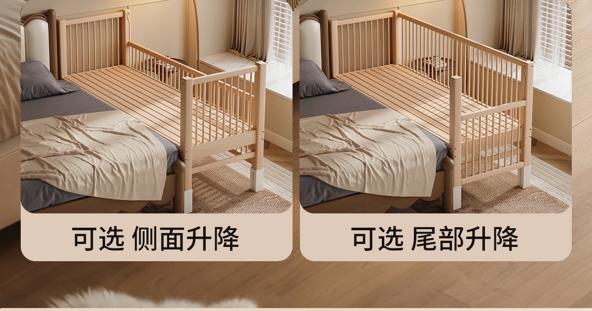 Shantou Lincun Children's Spliced Bed Crib Side Extended and Widened Adults Can Sleep Seamless Artifact Solid Beech Liftable Imported Beech Two-sided Guardrail Side Lift + Antibacterial Cotton Bed Surround 150x60cm