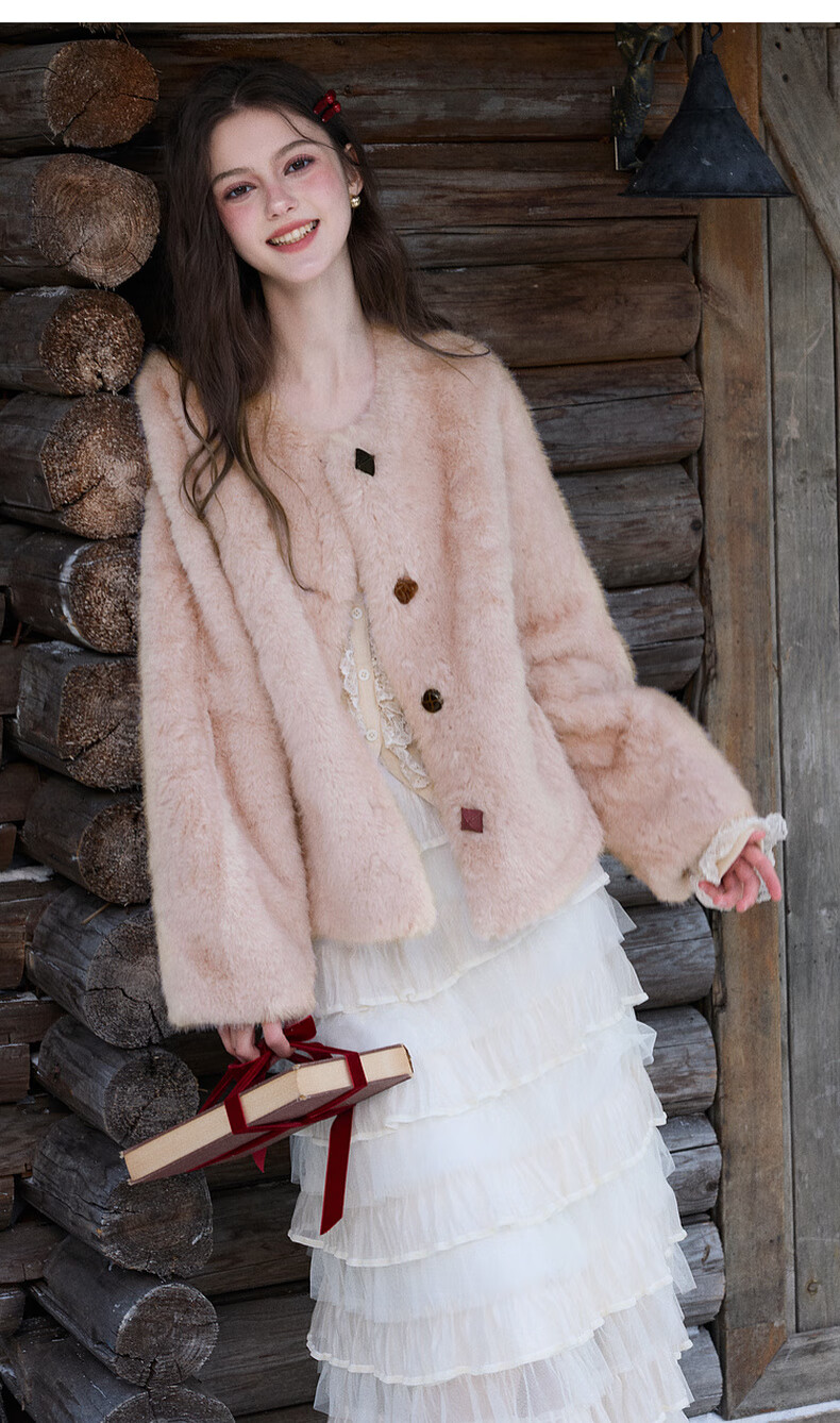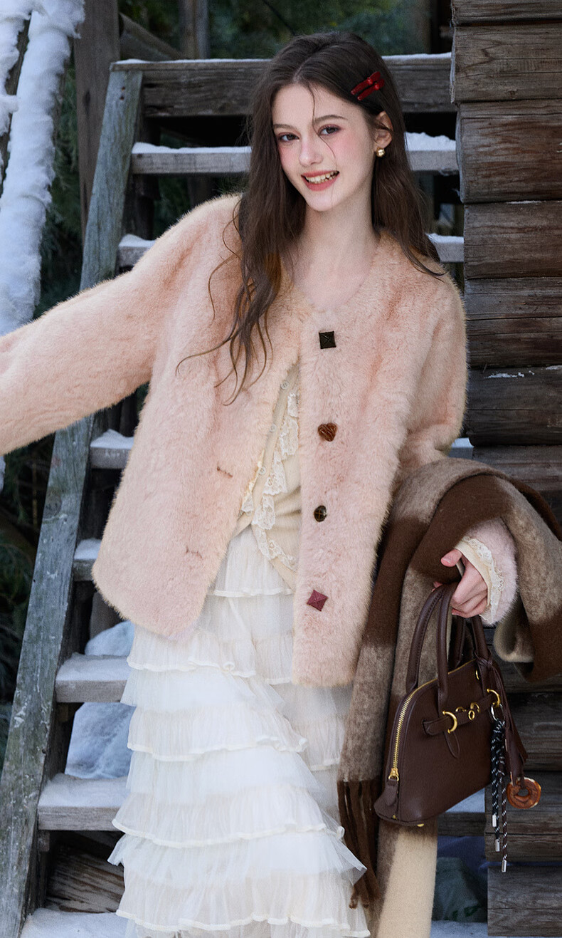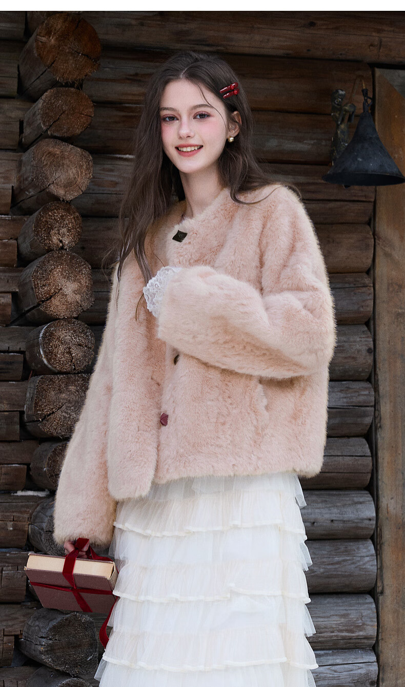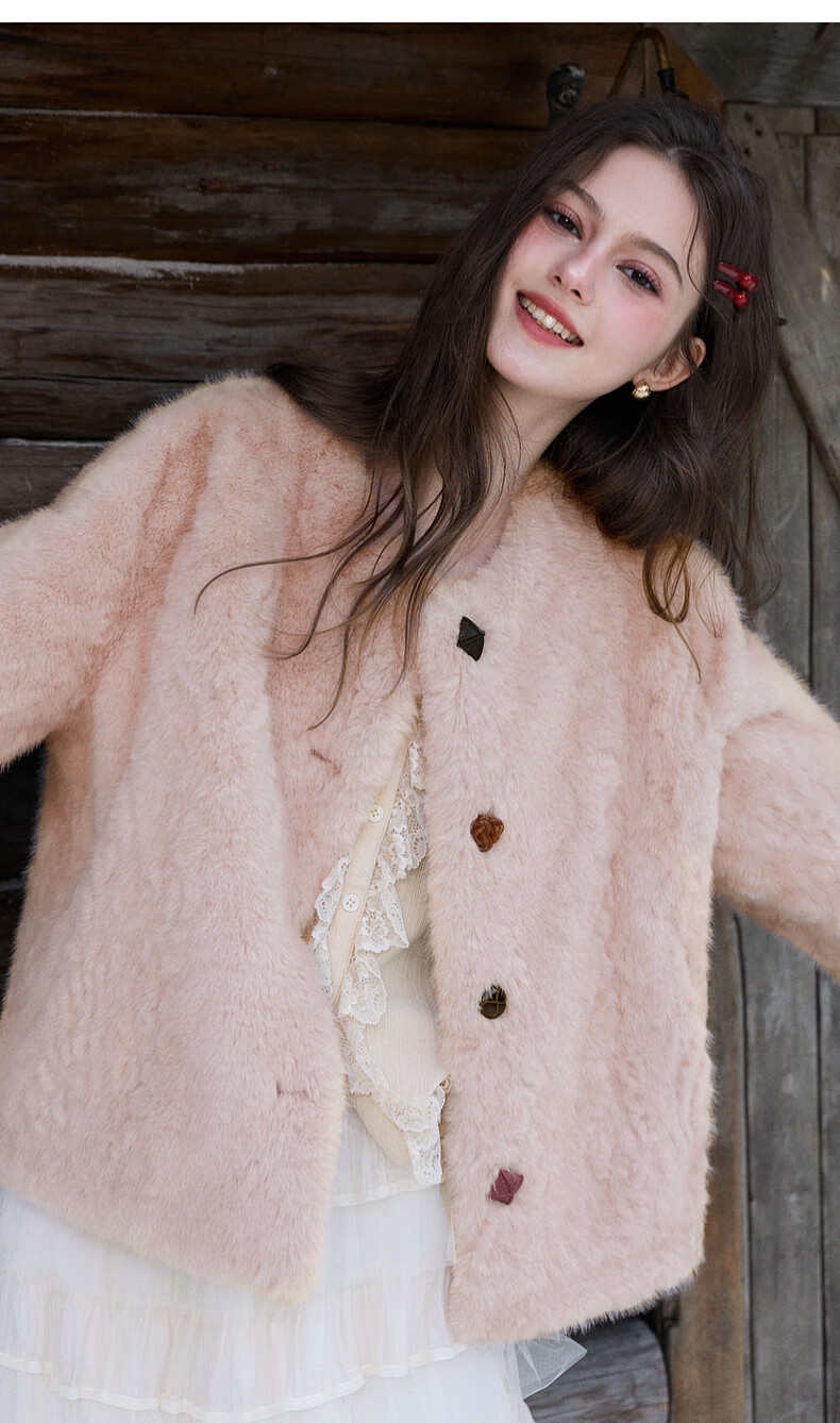 Sancai 2025 winter new eco-friendly fur coat loose short round neck long sleeves warm pink M cinnamon powder M 160/84A