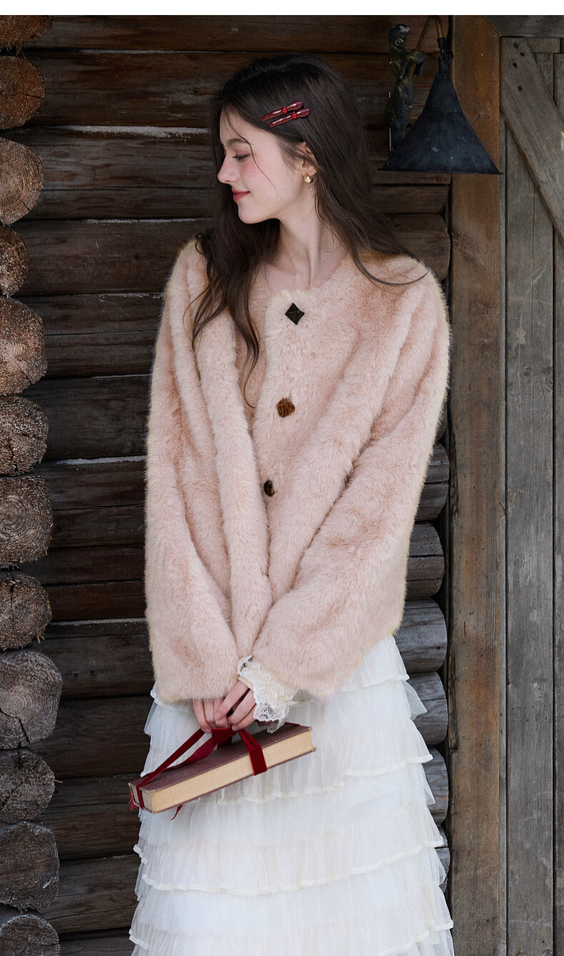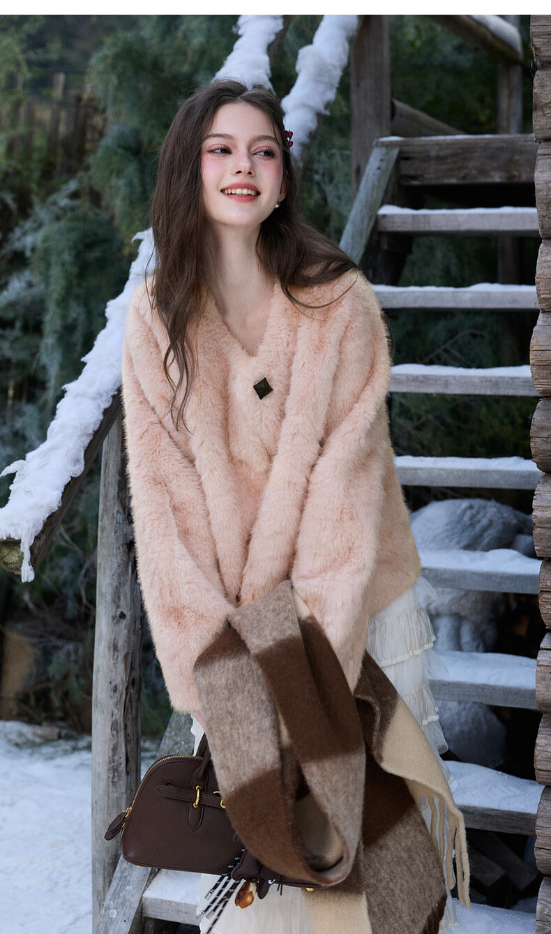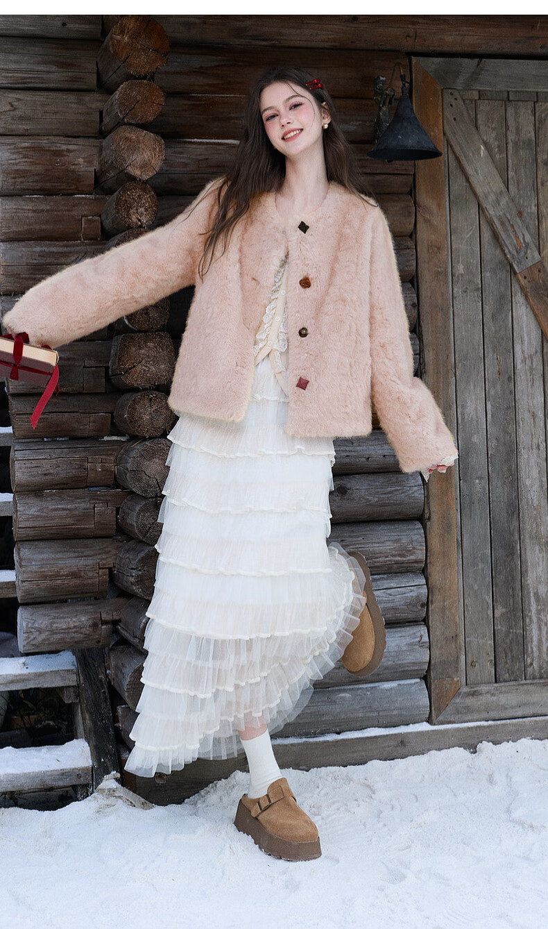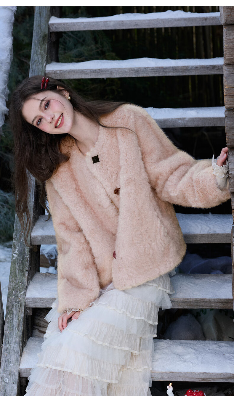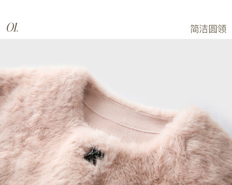 Sancai 2025 winter new eco-friendly fur coat loose short round neck long sleeves warm pink M cinnamon powder M 160/84A