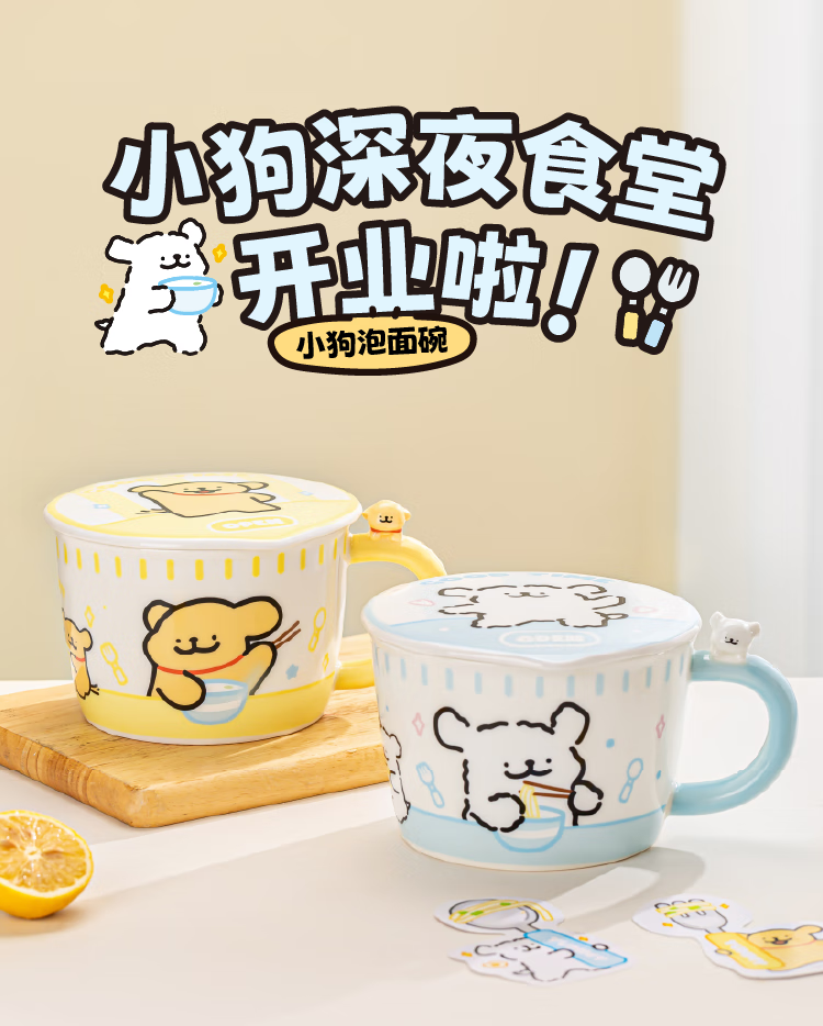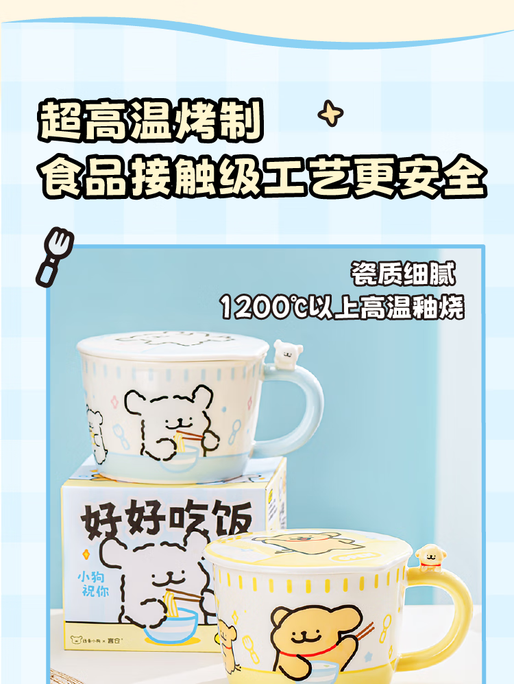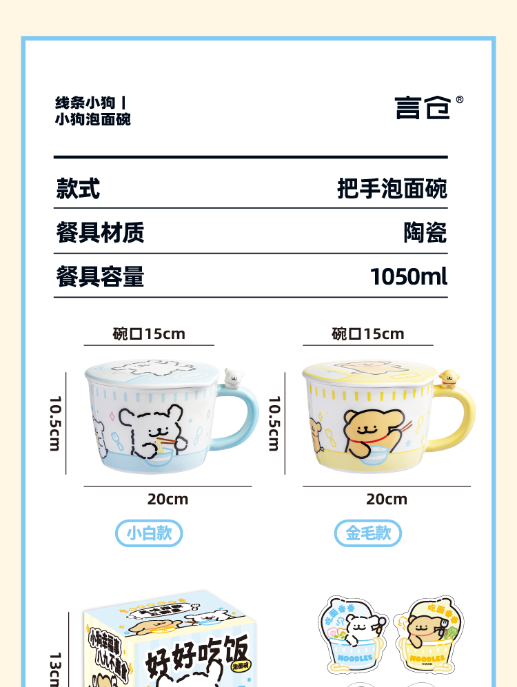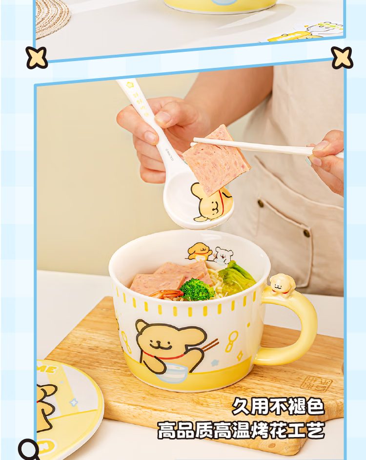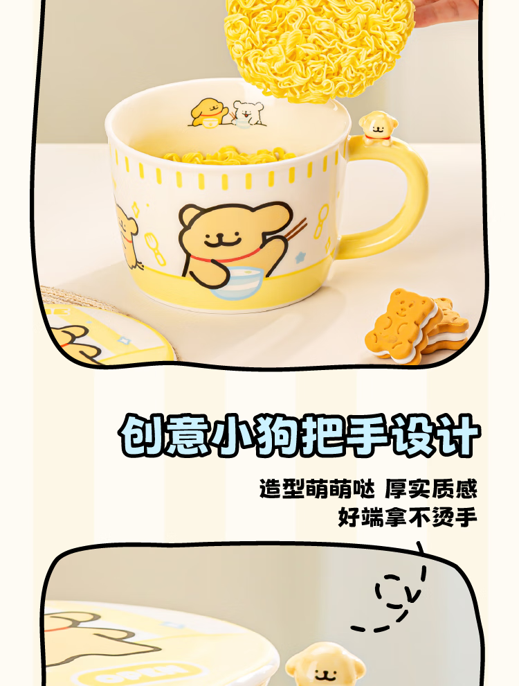 Yancang line puppy instant noodle bowl ceramic with handle large capacity soup bowl with lid practical for one person cute tableware small white handle instant noodle bowl
