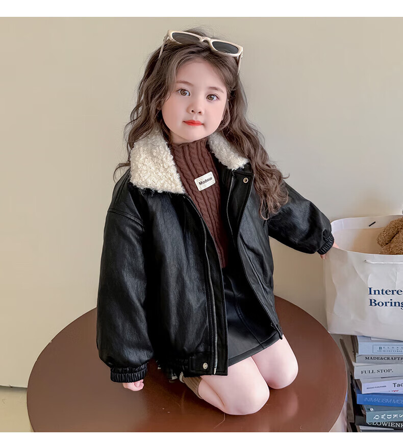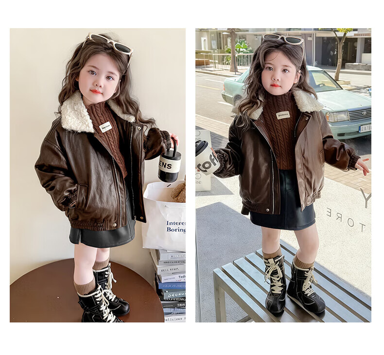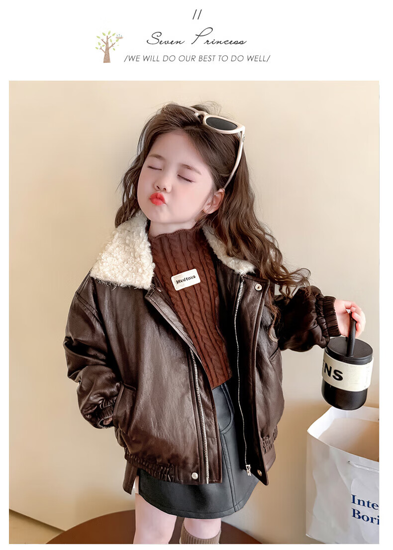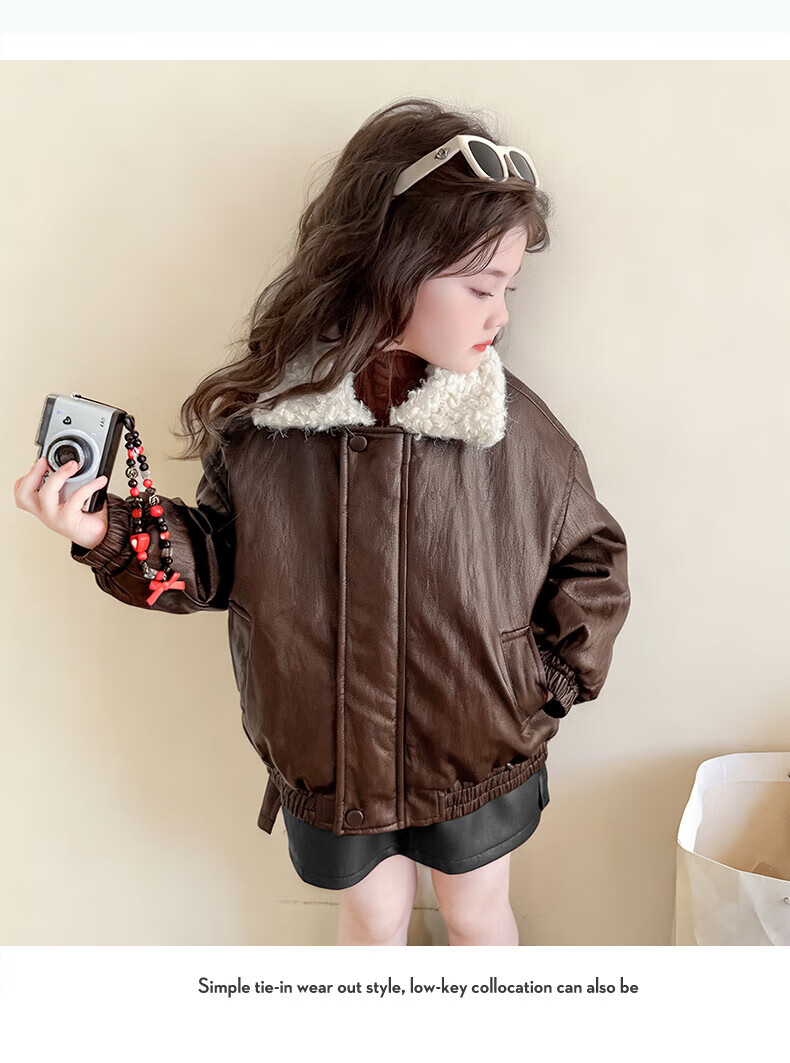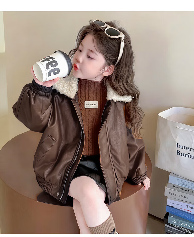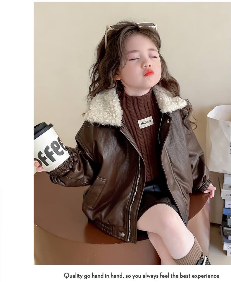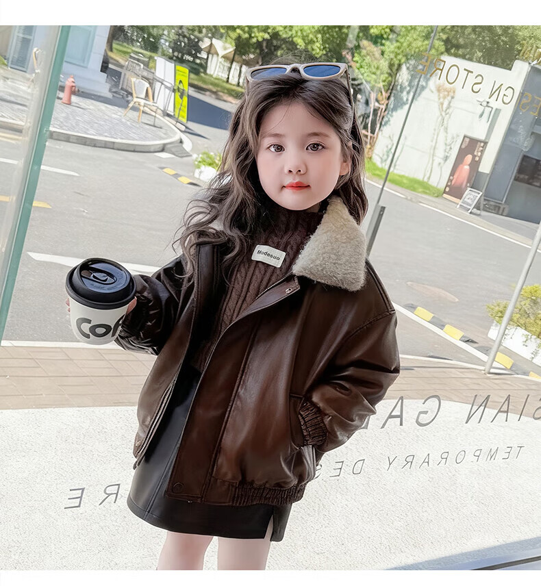 G.duck baby clothes for girls plus velvet leather jacket autumn and winter 2025 new style super good-looking children's early winter clothes for baby girls coffee color 90