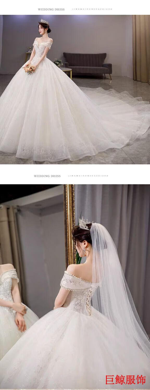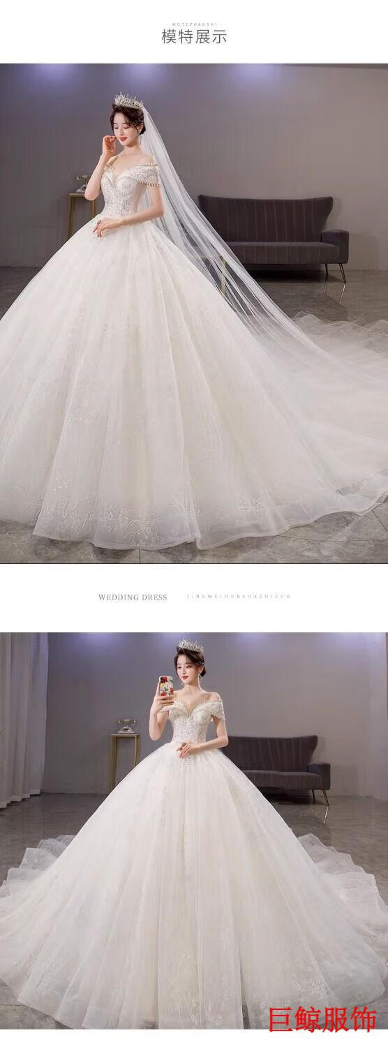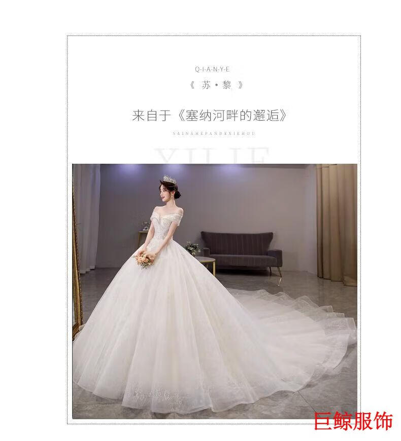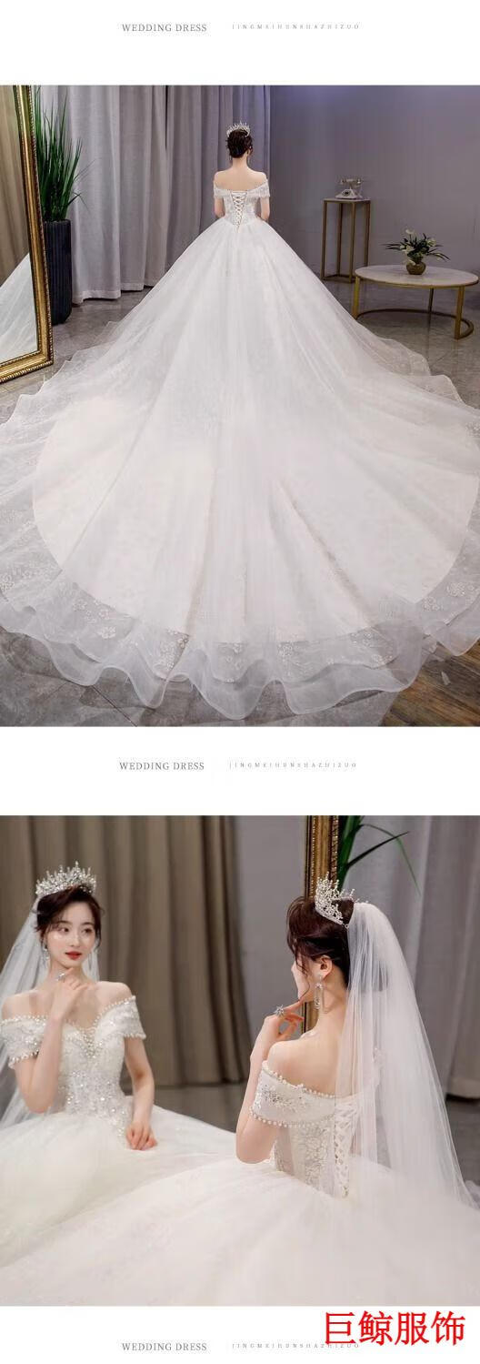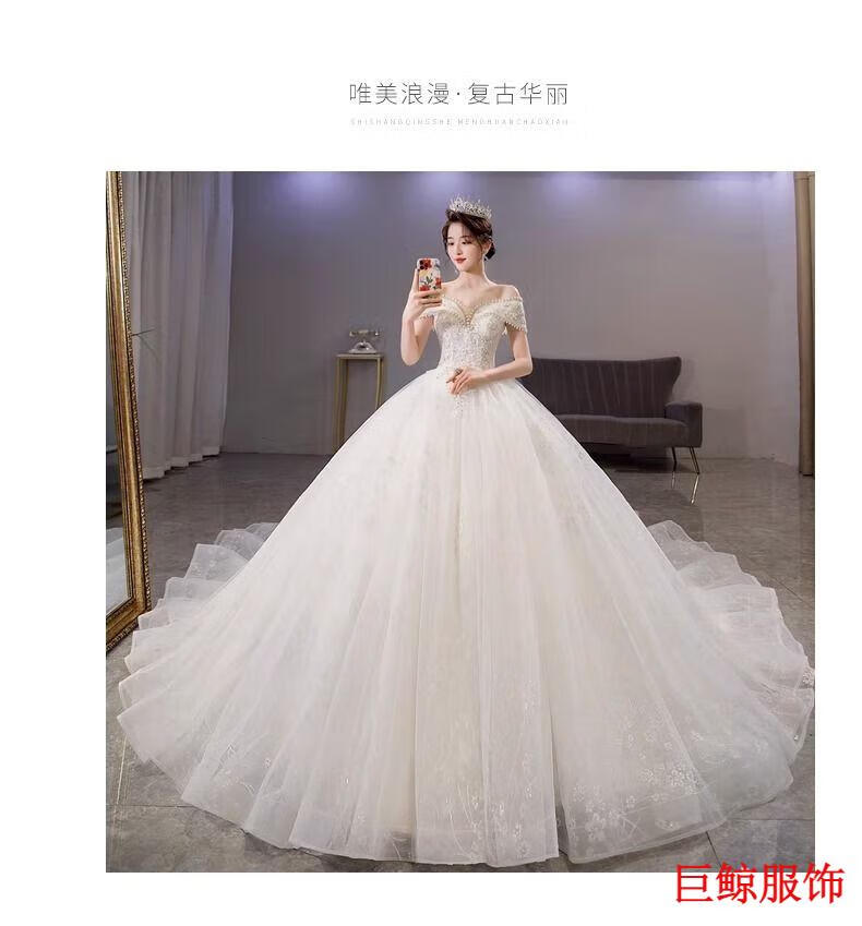 Tromlfz one-shoulder wedding dress new bridal main yarn palace style heavy industry trailing white going out yarn simple floor-length M