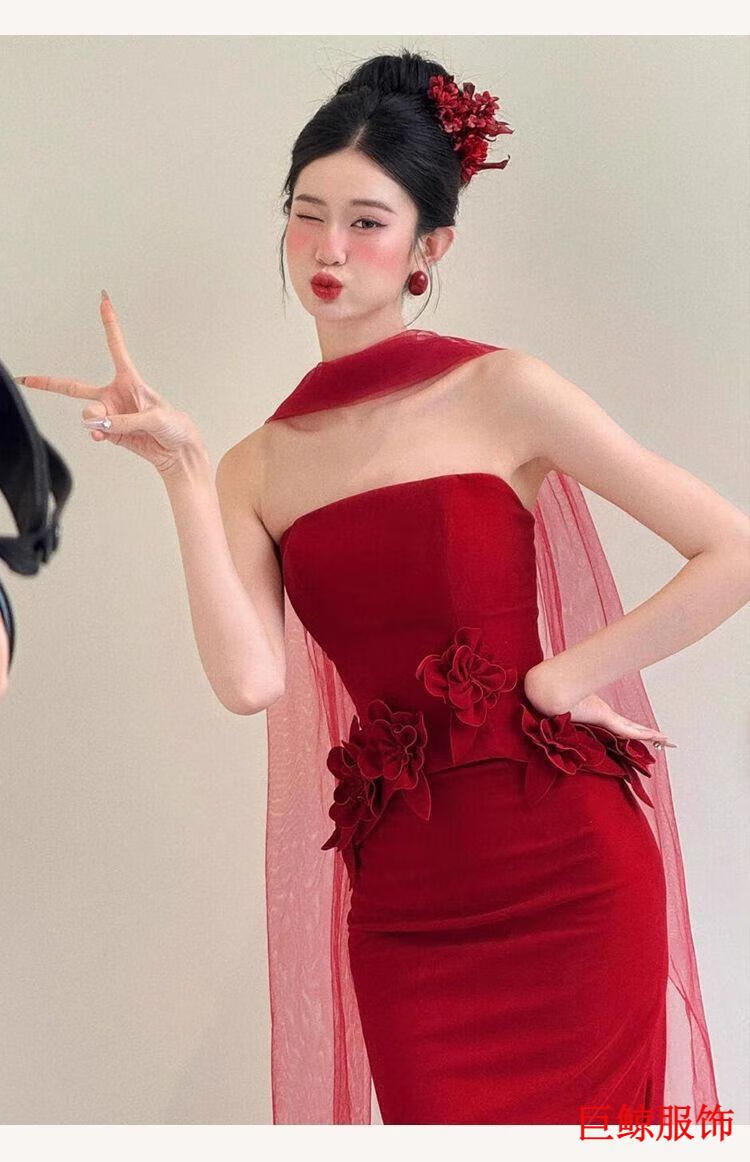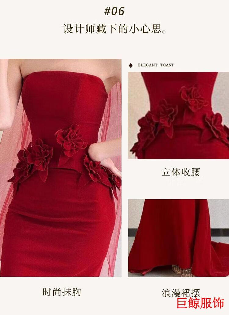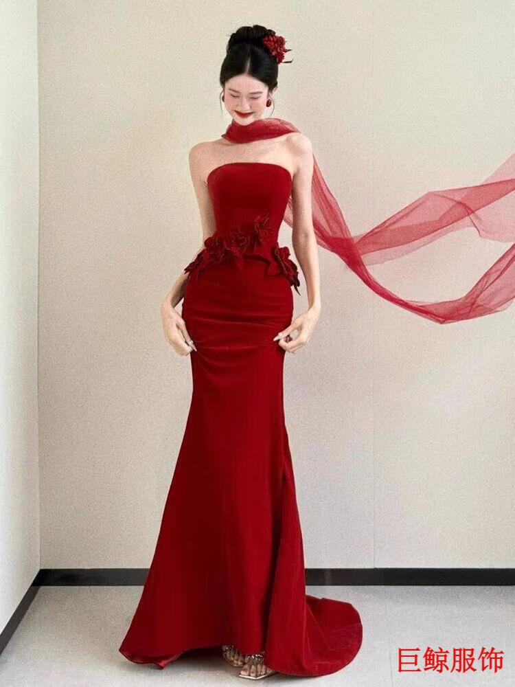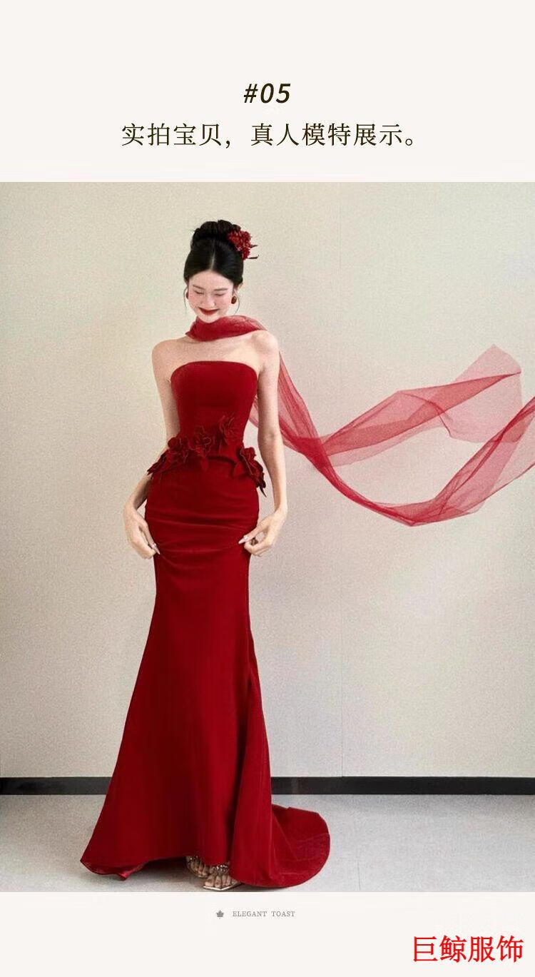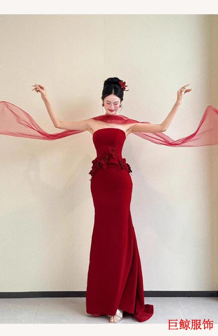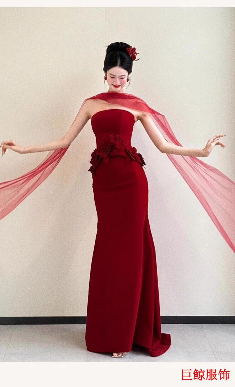 Tromlfz toast dress bride new tube top beautiful light wedding dress bride dressing gown red engagement dress skirt small tail burgundy L