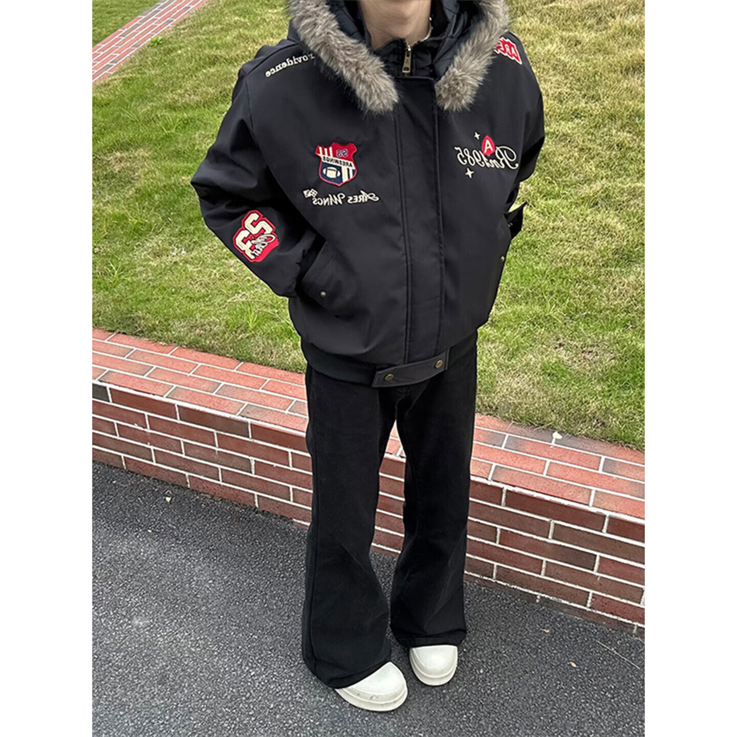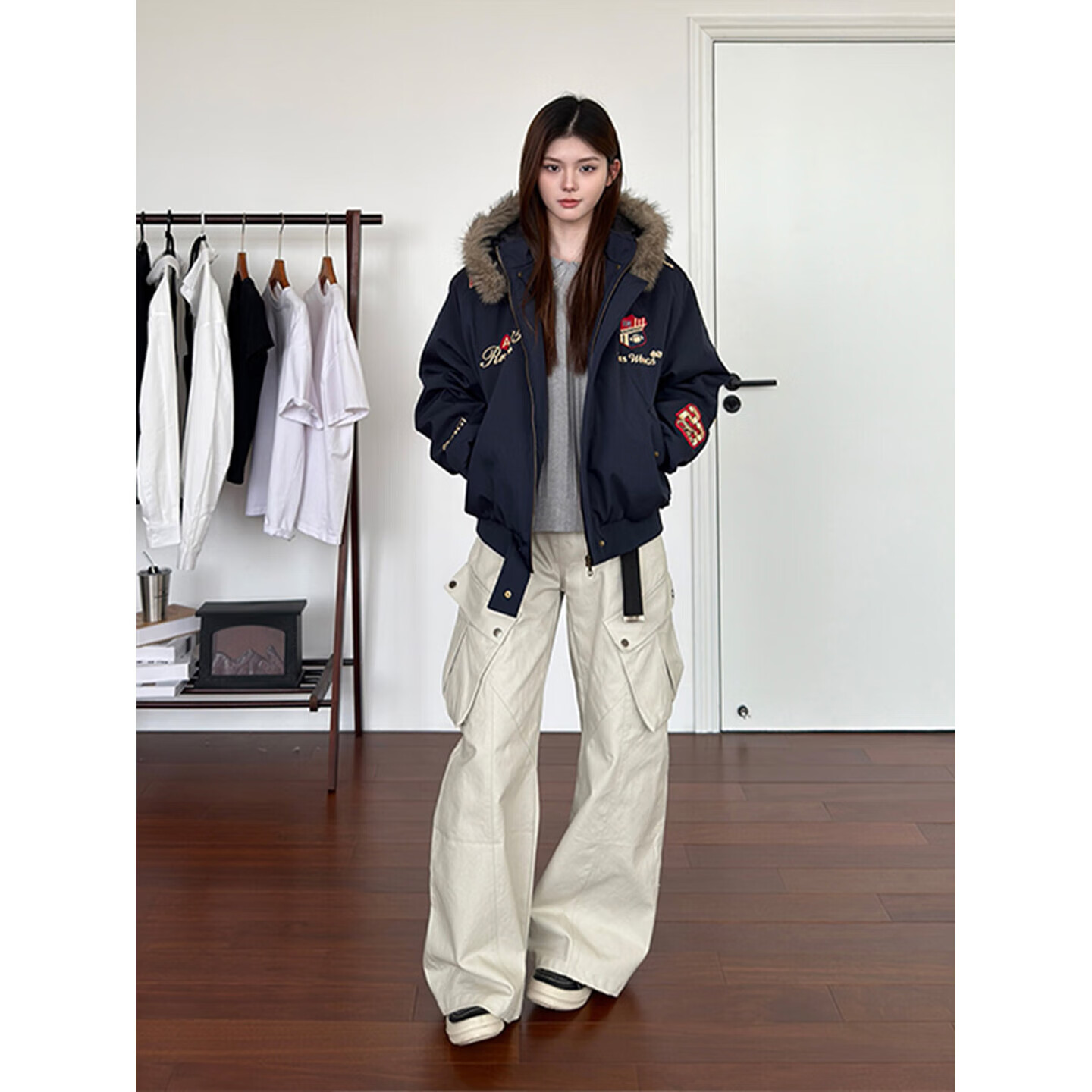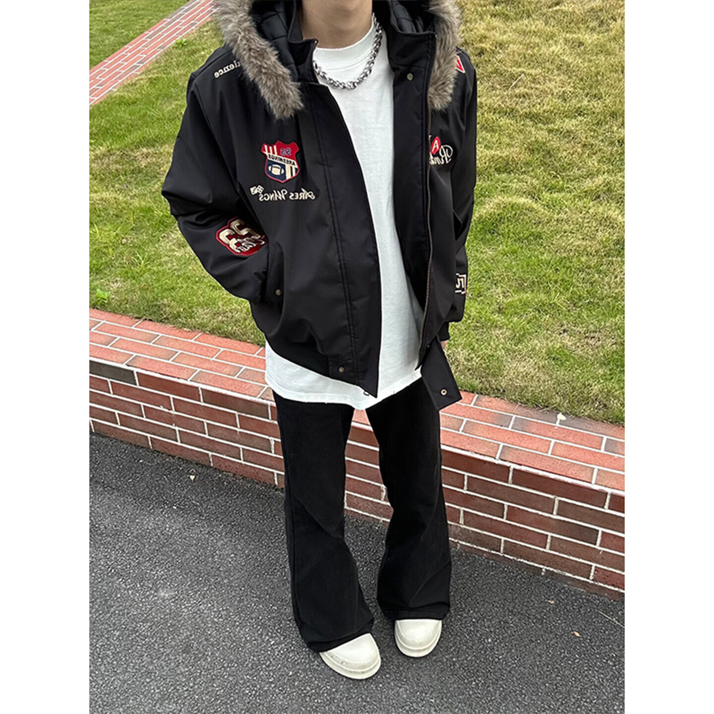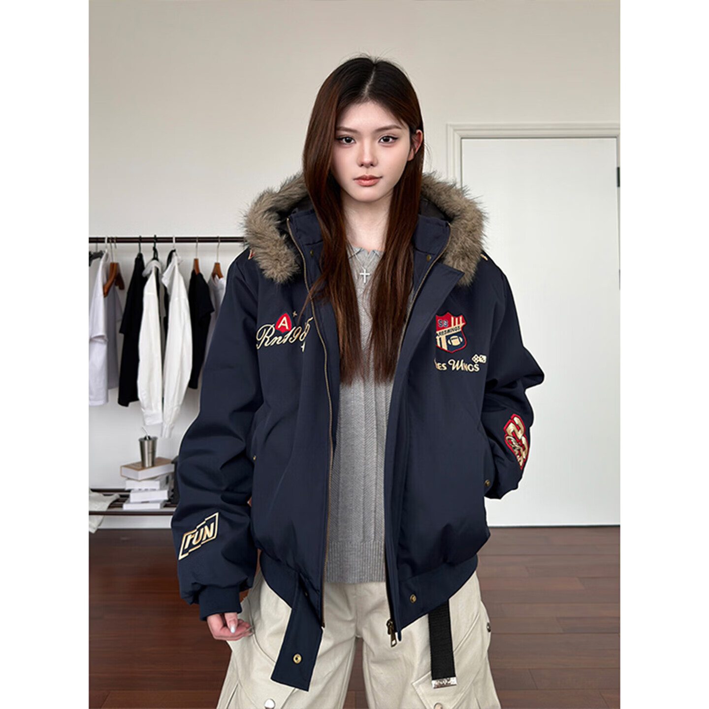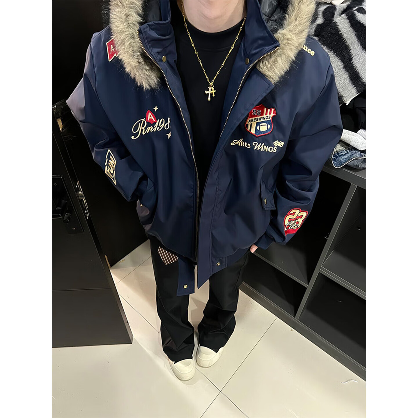Bushman Navy Badge Embroidered Fur Collar Cotton Jacket Men's Winter Thickened Warm Cotton Jacket American Mountain Carving Cotton Jacket Navy Blue Upgraded L